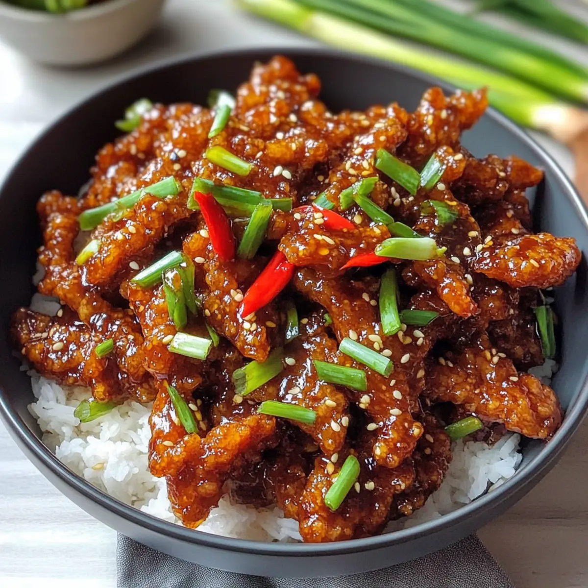 Nehme die Pfanne vom Herd und garniere das Knusprige Chili-Rindfleisch mit frisch geschnittenen Frühlingszwiebeln. Serviere das Gericht sofort, idealerweise mit gedämpftem Reis, um die köstliche Sauce aufzunehmen und den perfekten Genuss zu erleben.