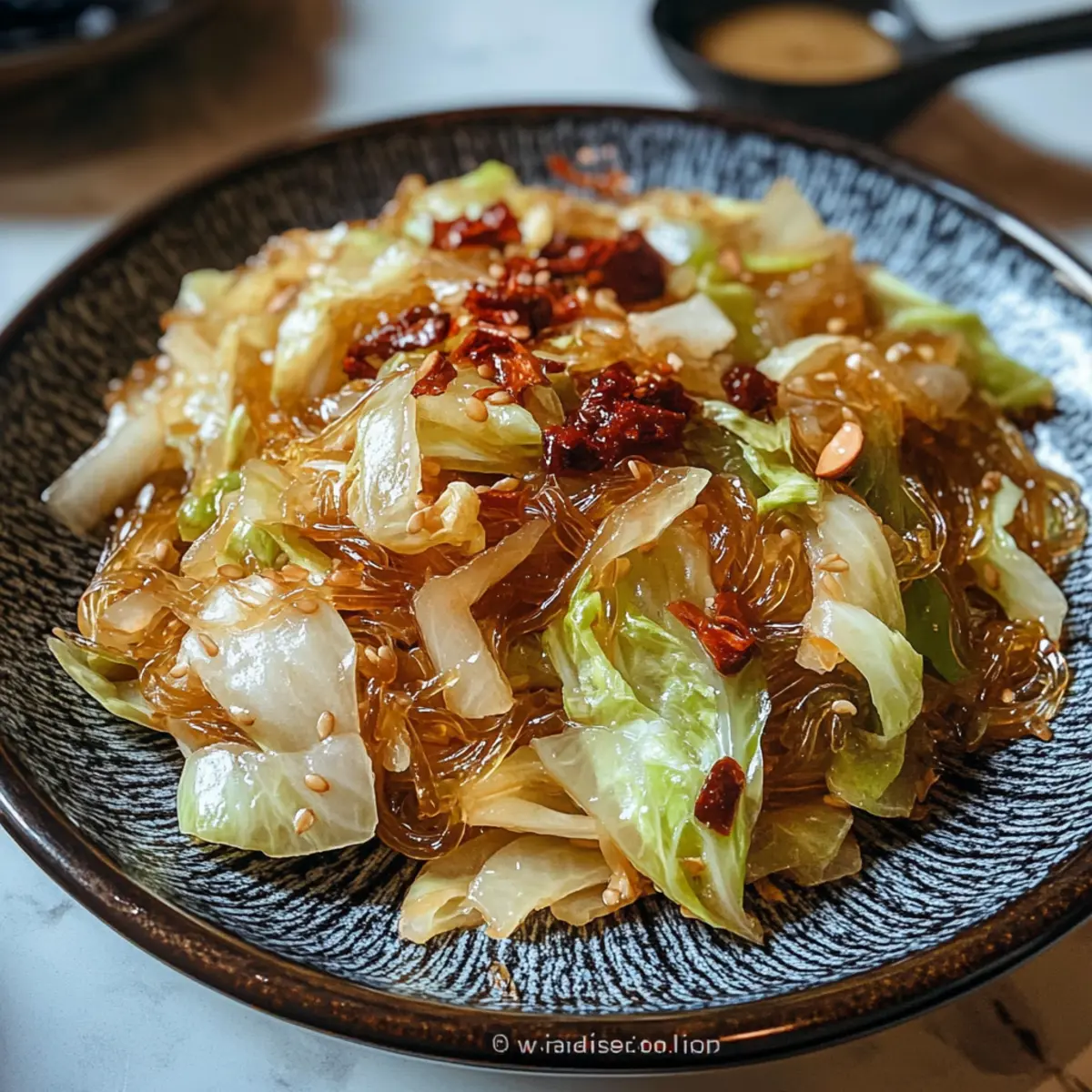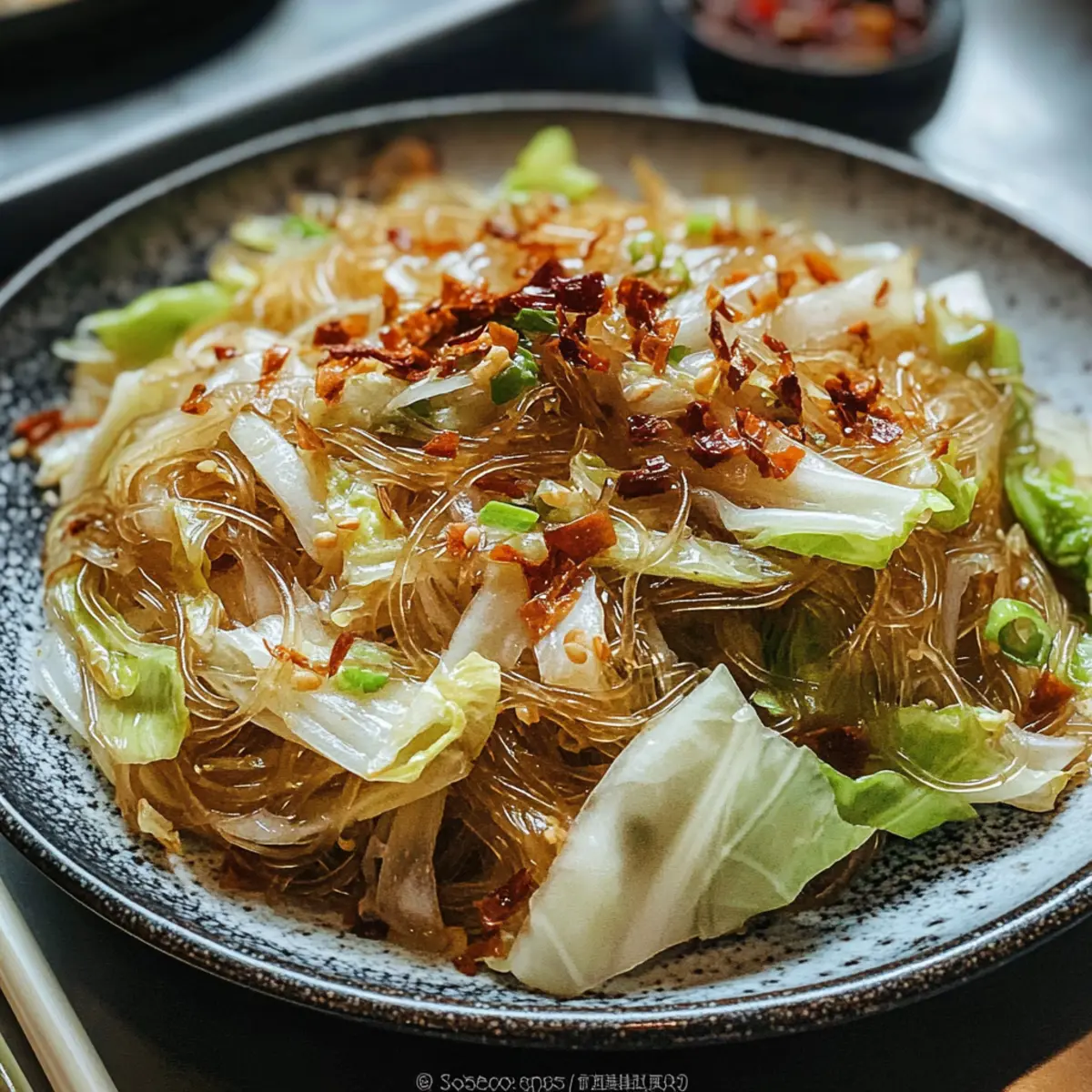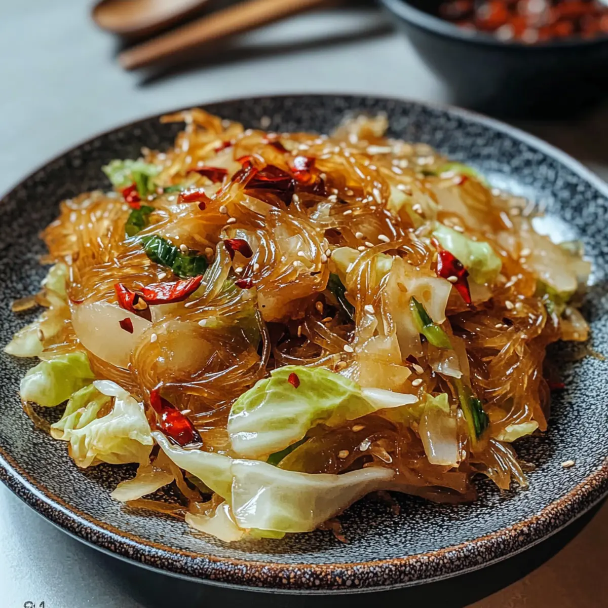 Als ich letztens in der Küche stand, fiel mir wieder ein, wie oft das Kohl Glasknudel Pfannengericht zu unserem Familienessen gefeiert wurde, und das aus gutem Grund. Diese lebhafte Mischung aus knusprigem Kohl und zarten Mungbohnennudeln ist nicht nur ein Genuss für die Sinne, sondern auch in nur 10 Minuten zubereitet! Perfekt für geschäftige Wochentage, ist dieses Rezept vegan und lässt sich glutenfrei anpassen – ideal für jeden, der auf schnelle und gesunde Ernährung achtet. Die beste Nachricht? Ihr könnt die Zutaten nach Lust und Laune variieren, um eure persönliche Note einzubringen. Welche Abwandlung würdet ihr heute ausprobieren? Warum sollten Sie dieses Rezept lieben? Einfachheit pur: Die Zubereitung ist unkompliziert und benötigt nur wenige Kochfähigkeiten. Reicher Geschmack: Die Kombination aus frischem Kohl und aromatischen Gewürzen sorgt für eine geschmackliche Explosion. Vielseitigkeit: Ob vegan oder mit Protein wie Rührei oder Hackfleisch, passen Sie das Rezept nach Ihren Vorlieben an. Schnell zubereitet: In nur 10 Minuten auf dem Tisch – ideal für hektische Wochentage. Gesund und nahrhaft: Mit nur etwa 126 Kalorien pro Portion ist dieses Gericht eine großartige Quelle für Ballaststoffe und eignet sich hervorragend als leichtes Abendessen. Entdecken Sie auch unser köstliches Birnenkompott Mit Zimt als perfektes Dessert, um Ihr Menü abzurunden! Kohl Glasknudel Pfannengericht Zutaten • Für das Pfannengericht: Mungbohnen-Vermicelli – Die Basis des Gerichts, die eine einzigartige Textur verleiht; bei Bedarf mit Reisvermicelli ersetzen. Kohl – Sorgt für Crunch und Volumen; 12 oz ergeben nach dem Schneiden etwa 4 Tassen, perfekt für das schnelle Gericht. Salz – Verstärkt die Aromen; verwenden Sie es sparsam zum Würzen. Erdnussöl (oder Pflanzenöl) – Ideal zum Anbraten, verleiht Tiefe im Geschmack; kann durch ein neutrales Öl ersetzt werden. Getrocknete Chili-Schoten – Für eine milde Schärfe und ein hervorragendes Aroma; ganz lassen für einen sanfteren Geschmack. Knoblauch – Unverzichtbar für ein aromatisches Gesamtbild; fein hacken für gleichmäßige Verteilung. Helle Sojasauce – Hauptgewürz, das Umami-Geschmack bietet; Tamari eignet sich perfekt für glutenfreie Varianten. Dunkle Sojasauce – Sorgt für Farbe und Intensität. Zucker – Balanciert die Salzigkeit der Sojasauce; kann für eine zuckerreduzierte Variante weggelassen werden. Dieses köstliche Kohl Glasknudel Pfannengericht vereint all diese einfach zu beschaffenden Zutaten, sodass Sie gleich loslegen können! Schritt-für-Schritt-Anleitung für das Kohl Glasknudel Pfannengericht Step 1: Nudeln einweichen Bringen Sie einen Topf mit Wasser zum Kochen und geben Sie die Mungbohnen-Vermicelli hinein. Kochen Sie die Nudeln für etwa 3–4 Minuten, bis sie leicht fest sind. Gießen Sie sie anschließend in ein Sieb, spülen Sie sie kalt ab und schneiden Sie sie in 3-Zoll-Stücke. Step 2: Sauce zubereiten In einer kleinen Schüssel vermengen Sie die helle Sojasauce, die dunkle Sojasauce und den Zucker zu einer homogenen Mischung. Dies wird die aromatische Sauce für Ihr Kohl Glasknudel Pfannengericht, die sowohl Geschmack als auch Farbe verleiht. Step 3: Öl erhitzen Erhitzen Sie in einer großen Pfanne oder einem Wok 2 Esslöffel Erdnussöl bei mittlerer bis hoher Hitze. Warten Sie, bis das Öl leicht zu schimmern beginnt, was etwa 1–2 Minuten dauert. Dies ist der perfekte Zeitpunkt, um mit dem Anbraten der Aromen zu beginnen. Step 4: Gewürze anbraten Fügen Sie die getrockneten Chili-Schoten und den gehackten Knoblauch in das heiße Öl hinzu. Rühren Sie die Mischung 30 Sekunden lang um, bis der Knoblauch goldbraun und duftend ist. Achten Sie darauf, dass der Knoblauch nicht verbrennt, um den besten Geschmack zu erhalten. Step 5: Kohl garen Geben Sie den geschnittenen Kohl in die Pfanne und würzen Sie ihn mit einer Prise Salz. Braten Sie den Kohl 2–3 Minuten lang an, bis er nur leicht zart, aber noch knackig ist. Die Farben werden lebendig und die Aromen beginnen sich zu vermengen. Step 6: Kombinieren Fügen Sie die vorbereiteten Glasknudeln und die zuvor zubereitete Sauce hinzu. Rühren Sie alles gut um, bis die Nudeln die Sauce aufnehmen und die Aromen sich gut vermischen. Kochen Sie alles für weitere 2 Minuten, bis der Kohl zart und die Nudeln warm sind. Step 7: Anrichten Transferieren Sie das fertige Kohl Glasknudel Pfannengericht auf einen großen Teller und servieren Sie es sofort heiß. Genießen Sie dieses geschmackvolle Gericht, das perfekt als eigenständige Mahlzeit oder als Beilage zu anderen himmlischen Gerichten geeignet ist. Was passt zu Kohl Glasknudel Pfannengericht? Genießen Sie die bunten Aromen und köstlichen Texturen mit kreativen Beilagen, die Ihr Gericht perfekt ergänzen. Aromatische Suppe: Eine einfache Misosuppe ist leicht und wärmt, wodurch sie eine harmonische Ergänzung zu den Aromen Ihres Pfannengerichts bildet. Frische Frühlingsrollen: Diese knusprigen Rollen mit frischem Gemüse und Kräutern bieten einen köstlichen Kontrast und machen die Mahlzeit noch spannender. Sesam-Spinat-Salat: Der nussige Geschmack von Sesam und die zarte Textur des Spinats schaffen eine ausgewogene Kombination, die das Pfannengericht ergänzt. Würzige Sojasauce: Stellen Sie eine kleine Schale mit einer Mischung aus Sojasauce und Chili bereit, um zusätzlichen Geschmack und eine angenehme Schärfe zu bieten. Gekühlter Koriander-Reis: Ein leichter, erfrischender Reis mit einer Note Koriander bringt zusätzliche Frische und ergänzt die herzhaften Aromen des Pfannengerichts. Fruchtiger Dessert: Runden Sie Ihr Menü mit einer leichten Mango-Sorbet ab, um einen süßen Abschluss zu bieten, der perfekt zu den herzhaften Noten passt. Expert Tips für das Kohl Glasknudel Pfannengericht Nudeln richtig kochen: Achten Sie darauf, die Mungbohnen-Vermicelli nicht zu lange zu kochen, da sie sonst zu weich werden. Sie sollten gerade so bissfest sein. Wok nutzen: 