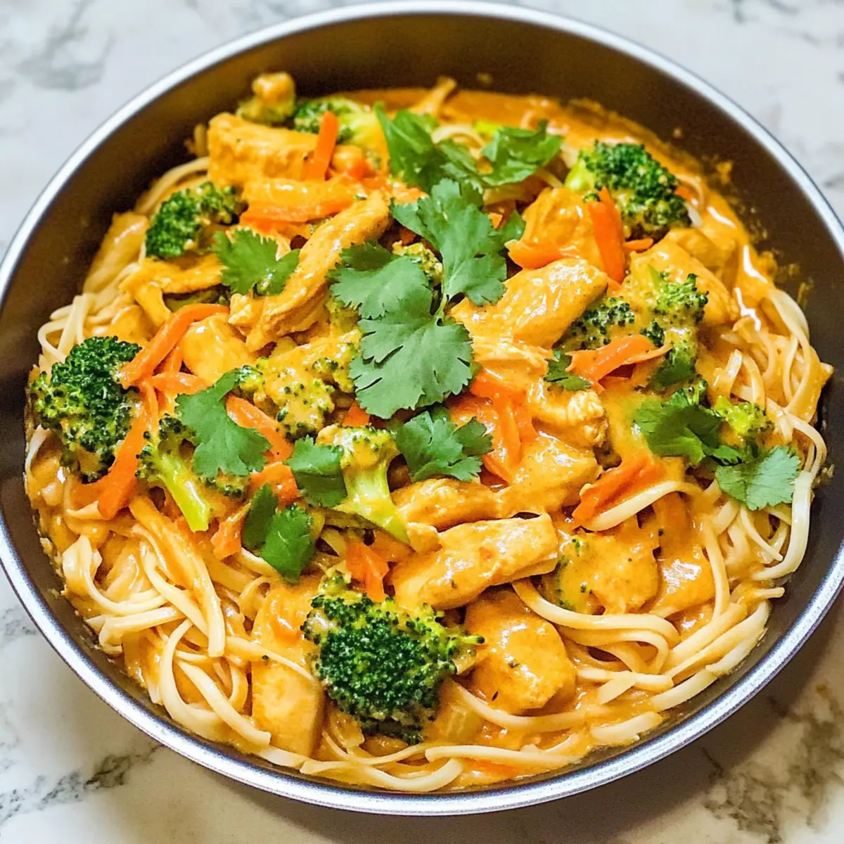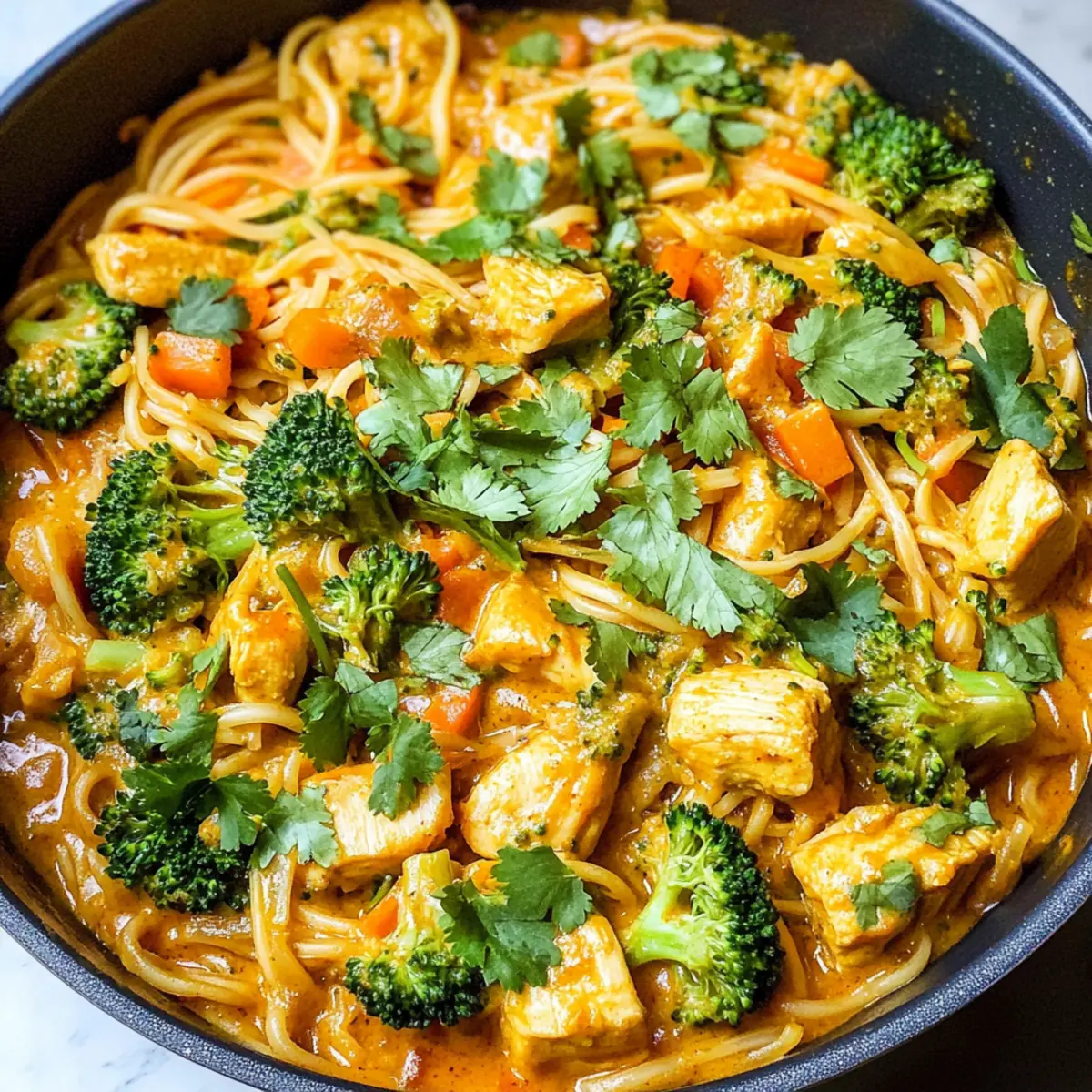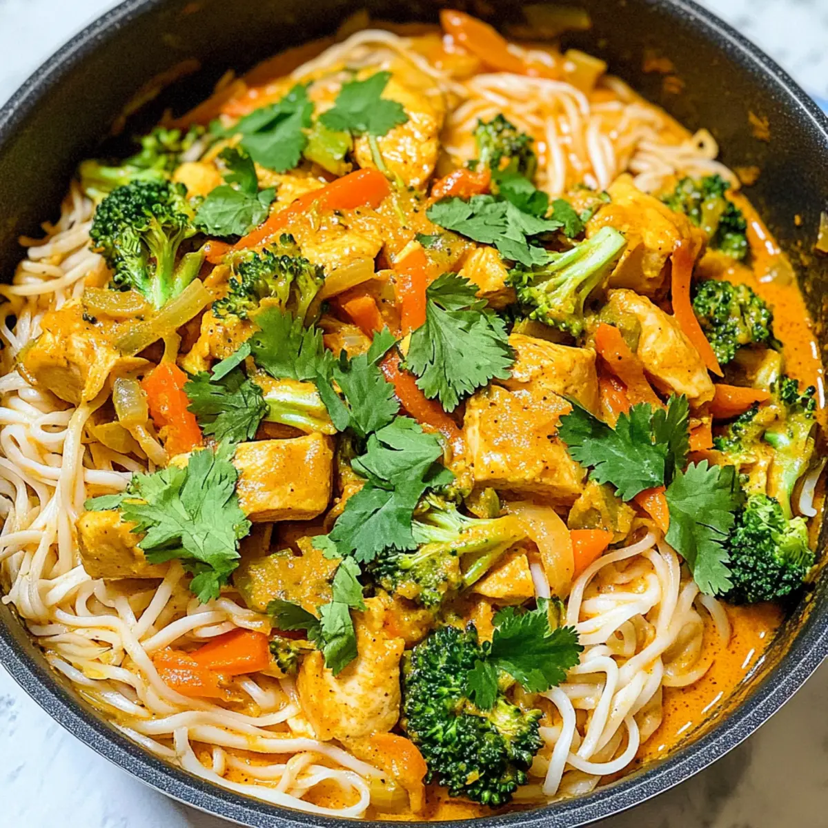 Ein warmer, tröstlicher Duft zieht durch die Küche, während ich das erste Mal in meinen Topf mit Kokosnuss-Curry-Hühnchen und Reisnudeln schaue. Diese köstliche Mahlzeit vereint zarte Hühnchenstücke mit cremigen Reisnudeln und knackigem Gemüse, alles umhüllt von einer mild würzigen Currysauce. Perfekt für geschäftige Wochentage, ist dieses Gericht nicht nur schnell zubereitet, sondern auch unglaublich anpassungsfähig – ob mit Garnelen, Tofu oder saisonalem Gemüse, der Kreativität sind keine Grenzen gesetzt! Als Bonus ist es eine gesunde Alternative zu Fast Food und bringt mit jedem Bissen ein wenig exotischen Flair auf deinen Tisch. Bist du bereit, dieses Asia-Genuss-Abenteuer zu entdecken? Warum wirst du dieses Rezept lieben? Einfachheit: Die Zubereitung ist kinderleicht und erfordert nur grundlegende Kochkünste, perfekt für alle Kochlevels. Vielseitigkeit: Du kannst die Gemüsesorten und Proteinquellen nach Belieben anpassen – von zartem Hühnchen zu saftigen Garnelen oder pflanzlichem Tofu. Reiche Aromen: Die Kombination aus cremiger Kokosmilch und würziger roter Currypaste sorgt für ein Geschmackserlebnis, das deine Sinne verwöhnt. Schneller Genuss: Mit einer Zubereitungszeit von unter 30 Minuten ist dies das ideale Gericht für hektische Abende. Gesunde Wahl: Es bietet eine ausgewogene Nährstoffzusammensetzung und belebt deine Mahlzeiten mit einem Hauch exotischer Küche – eine großartige Alternative zu Fertiggerichten. Kokosnuss-Curry-Hühnchen und Reisnudeln Zutaten • Mit diesen Zutaten bereitest du das perfekte Kokosnuss-Curry-Hühnchen und Reisnudeln zu, ganz nach deinem Geschmack. Für das Hühnchen Hühnchenkeulen, ohne Haut – Sie bieten Protein und bleiben saftig; Hähnchenbrust kann als magerere Option verwendet werden. Knoblauchzehen – Frisch gerieben für den besten Geschmack; sie verleihen dem Gericht ein aromatisches Aroma. Für die Sauce Kokosmilch – Sie sorgt für Cremigkeit und Reichtum; verwende Vollmilch für eine cremige Sauce oder leichte Kokosmilch für eine fettärmere Version. Rote Currypaste – Der Schlüssel zu Geschmack und leichter Schärfe; pass die Menge je nach Vorliebe für Schärfe an. Sojasauce – Sie sorgt für Salzigkeit und Umami-Geschmack; verwende natriumarme Sojasauce für eine gesündere Option. Sriracha (optional) – Für zusätzlichen Kick; passe die Menge je nach Schärfetoleranz an oder lasse sie ganz weg. Für die Nudeln und Gemüse Reisnudeln (225-340 g) – Hauptbestandteil, der für Textur sorgt; andere Nudeln können verwendet werden, mache jedoch die Kochzeit entsprechend. Brokkoli (2-3 Tassen) – Fügt Nährstoffe und Crunch hinzu; jede grüne Gemüsesorte kann verwendet werden. Geraspelte Karotten (1 Tasse) – Sie liefern Süße und Farbe; können leicht durch andere Gemüse wie Zucchini ersetzt werden. Ananas (1 Tasse, optional) – Für einen süßen, tropischen Touch; kann weggelassen oder durch eine andere Frucht ersetzt werden. Für die Garnitur Korianderblätter – Frische Garnitur, die Helligkeit hinzufügt; Basilikum kann für etwas Abwechslung verwendet werden. Schritt-für-Schritt-Anleitung für Kokosnuss-Curry-Hühnchen und Reisnudeln Step 1: Reisnudeln vorbereiten Spüle die Reisnudeln unter kaltem Wasser ab und lasse sie 45-60 Minuten in heißem Wasser einweichen, bis sie weich sind. Alternativ kannst du sie 3-4 Minuten in kochendem Wasser blanchieren. Achte darauf, sie anschließend gut abzugießen und beiseite zu stellen, damit sie nicht kleben. Step 2: Hühnchen anbraten Erhitze 1 Esslöffel Öl in einem großen Wok oder einer Pfanne bei mittlerer bis hoher Hitze. Füge die gewürfelten Hühnchenkeulen hinzu, würze sie mit Salz und Pfeffer und brate sie 5-7 Minuten lang, bis sie goldbraun und durchgegart sind. Rühre regelmäßig um, um eine gleichmäßige Bräunung zu gewährleisten. Step 3: Gemüse hinzufügen Gib den Brokkoli, die Ananasstücke, die geraspelten Karotten und die Sojasauce in die Pfanne. Brate alles weitere 5 Minuten, bis der Brokkoli zart ist, aber noch einen knackigen Biss hat. Achte darauf, die Mischung regelmäßig zu schwenken, damit alles gleichmäßig gar wird. Step 4: Hühnchen und Gemüse beiseite stellen Nimm die Hühnchen-Gemüse-Mischung aus der Pfanne und gib sie in eine Schüssel. Decke sie ab, damit sie warm bleibt. Dies hilft, die Aromen in der Mischung zu halten, während du dich um die Sauce kümmerst. Step 5: Sauce zubereiten In derselben Pfanne fügst du die Kokosmilch, die rote Currypaste, den geriebenen Knoblauch und, falls gewünscht, die Sriracha hinzu. Rühre die Mischung gut um und lasse sie 5-7 Minuten köcheln, bis die Sauce anfängt, dickflüssig zu werden. Achte darauf, die Sauce während des Kochens gelegentlich zu rühren. Step 6: Nudeln und Hühnchen vermengen Füge die eingeweichten Reisnudeln zur Sauce in die Pfanne hinzu und wende sie, bis sie gleichmäßig mit der Sauce versehen sind. Gib die beiseite gestellte Hühnchen-Gemüse-Mischung zurück in die Pfanne und rühre alles gut um, bis sich die Zutaten gut vermischen und die Nudeln warm sind. Step 7: Anrichten und servieren Serviere das Kokosnuss-Curry-Hühnchen und die Reisnudeln heiß. Garniere das Gericht mit frischen Korianderblättern. Dies fügt nicht nur eine frische Note hinzu, sondern macht die Präsentation auch ansprechend. Genießen! Meal Prep für Kokosnuss-Curry-Hühnchen und Reisnudeln Diese Kokosnuss-Curry-Hühnchen und Reisnudeln sind ideal für die Vorbereitung im Voraus! Du kannst das Hühnchen bis zu 24 Stunden vorher marinieren, um den Geschmack zu intensivieren. Zudem kannst du die Reisnudeln bis zu 3 Tage im Voraus einweichen und dann im Kühlschrank aufbewahren (achte darauf, sie gut abzutropfen, um ein Verkleben zu vermeiden). Das Gemüse wie Brokkoli und Karotten lässt sich ebenfalls 1-2 Tage im Voraus schneiden. Wenn du bereit bist zu servieren, erhitze einfach die Sauce auf dem Herd und füge die vorab zubereiteten Zutaten hinzu, um ein ebe