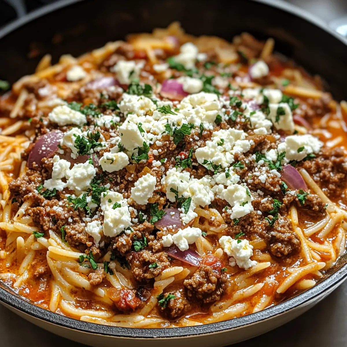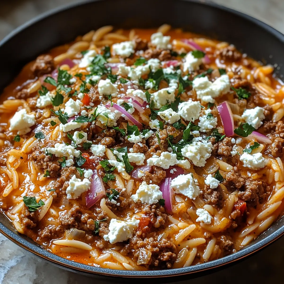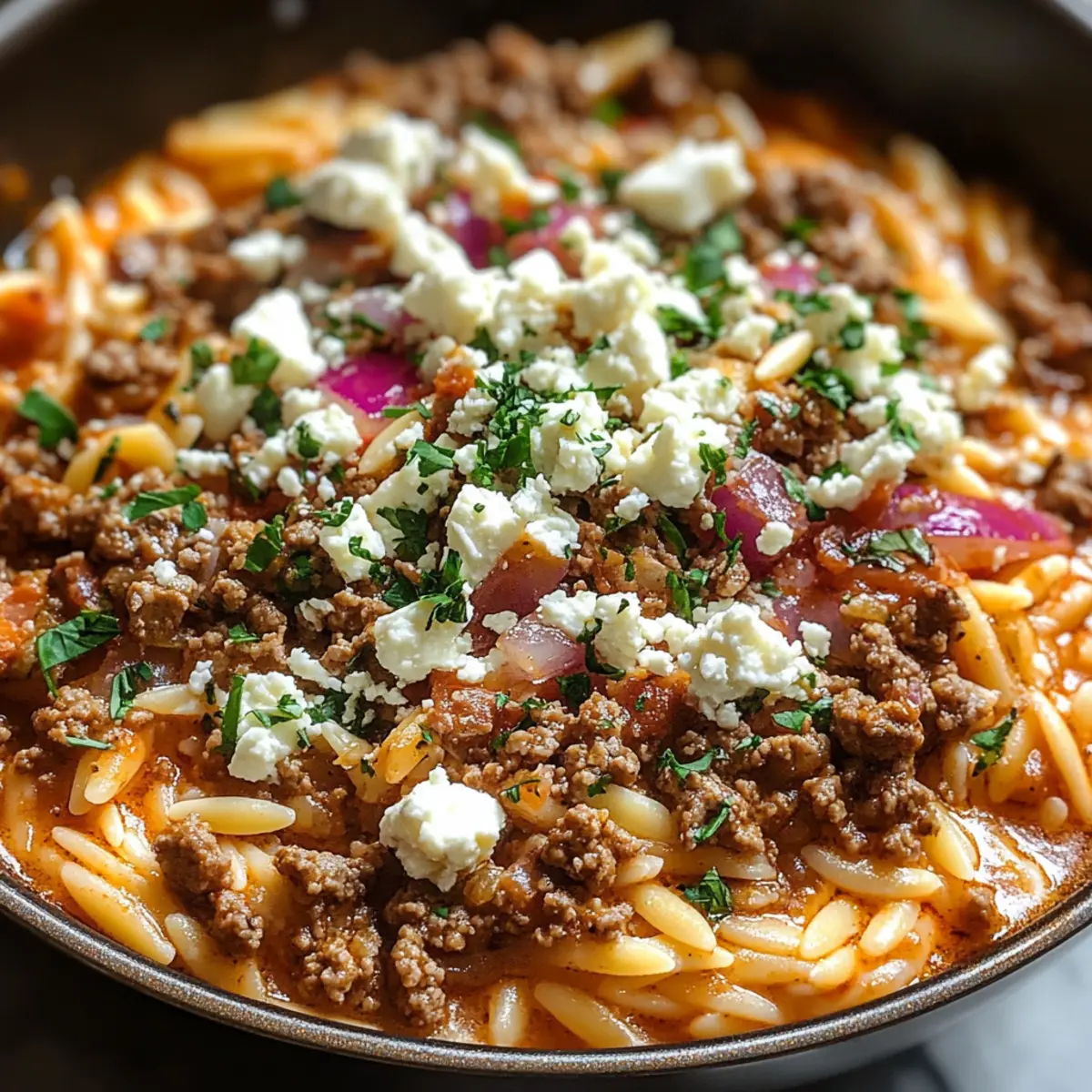 Köstliche Kritharaki-Hackfleischpfanne mit Feta, voller mediterraner Aromen, schnell zubereitet und ideal für jedes Familienessen.