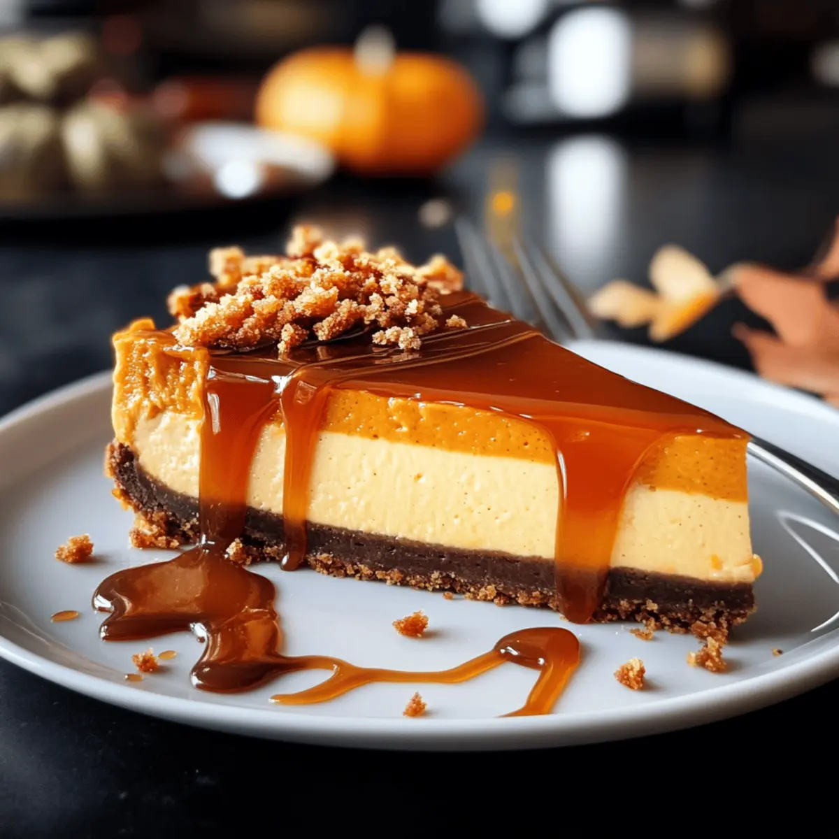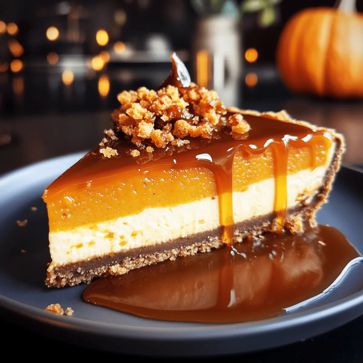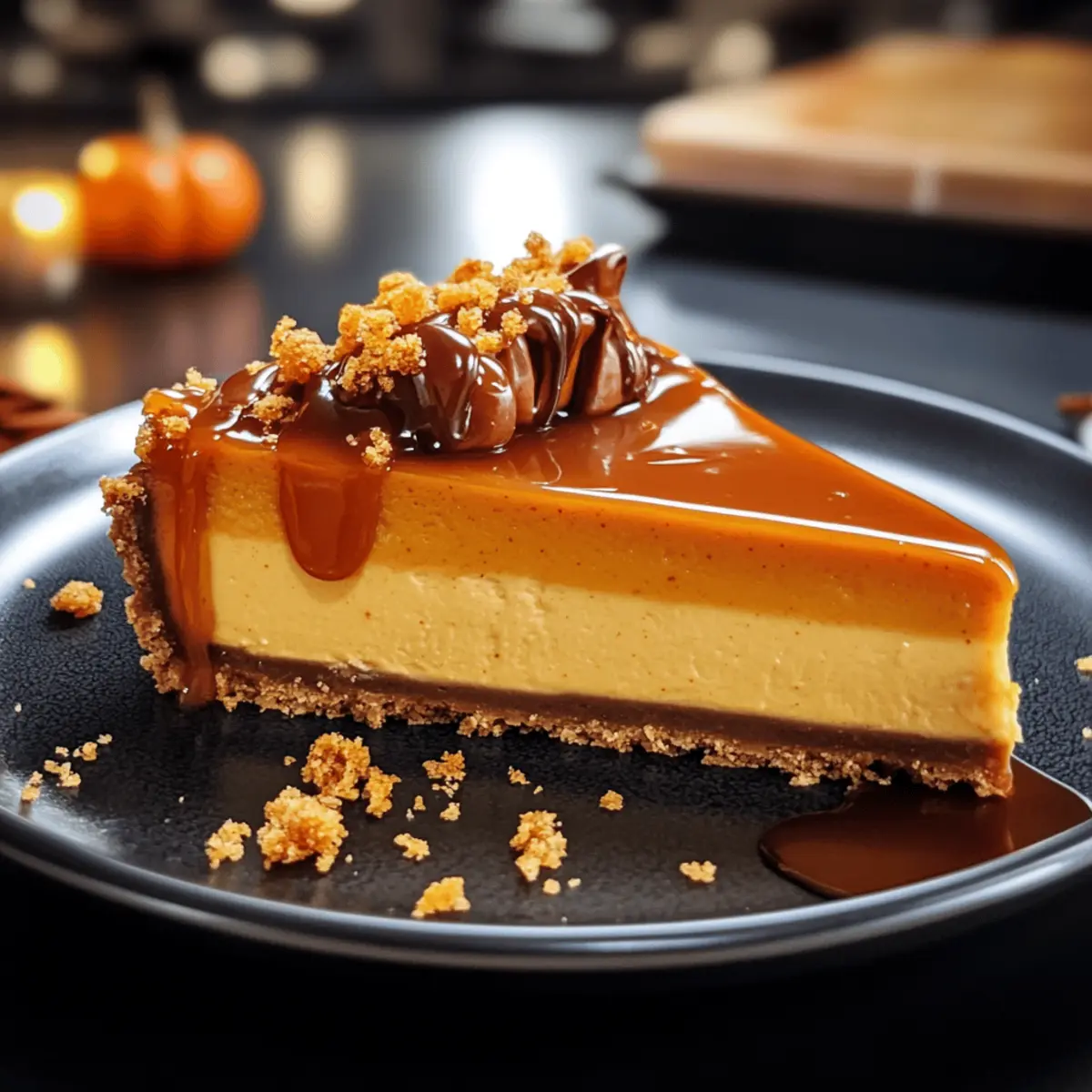 Ein köstliches Aroma zieht durch die Küche, während ich die ersten Kürbisse des Jahres schneide. Der Herbst ist die perfekte Zeit, um sich mit einem Kürbis-Cheesecake mit gesalzenem Karamell verwöhnen zu lassen! Diese herrliche Dessertkreation verbindet die süßen und würzigen Aromen der Saison mit einer samtigen Käsefüllung und einem knusprigen Spekulatiusboden. Was ich an diesem Rezept besonders liebe, ist, dass es nicht nur einfach zuzubereiten ist, sondern auch ein echter Publikumsmagnet ist – perfekt für gemütliche Abende mit Freunden oder Family. Jedes Stück ist ein Hauch von Herbst, den man sich nicht entgehen lassen sollte. Bist du bereit, deiner Küche eine festliche Note zu verleihen? Lass uns gemeinsam in die Welt des Kürbisgenusses eintauchen! Warum du dieses Rezept lieben wirst Einfachheit: Der Kürbis-Cheesecake ist unkompliziert in der Zubereitung und benötigt nur grundlegende Backfähigkeiten, was ihn ideal für Hobbyköche macht. Zauberhafte Aromen: Die Kombination aus Kürbis und gesalzenem Karamell sorgt für ein Geschmackserlebnis, das die Sinne verzaubert und sofort in herbstliche Stimmung bringt. Köstliche Texturen: Der cremige Käsekuchen trifft auf einen knackigen Spekulatiusboden – ein perfekter Kontrast, der jeden Bissen zum Genuss macht. Vielseitigkeit: Serviere ihn warm oder kalt, als Dessert oder zum Kaffee – dieser Kuchen macht zu jeder Gelegenheit eine gute Figur! Warte nicht länger, um deinen Gästen mit diesem herbstlichen Dessert eine Freude zu bereiten! Kürbis-Cheesecake mit Salted Caramel Zutaten • Wenn du die Aromen des Herbstes liebst, wirst du diese Zutaten unbedingt gebrauchen wollen! Für die Kruste: Spekulatius – verleiht der Kruste einen warmen, würzigen Geschmack. Substitution: jeder andere gewürzte Keks oder Keksboden. Butter – bindet die Kruste und sorgt für einen köstlichen Geschmack. Substitution: Margarine für eine butterfreie Option. Für die Füllung: Frischkäse – sorgt für die cremige Textur des Cheesecakes. Substitution: Ricotta für eine leichtere Variante. Sahne – fügt Geschmack und Feuchtigkeit hinzu. Substitution: griechischer Joghurt für eine leichtere Option. Kürbispüree – das Herzstück des Geschmacks – gibt die herbstliche Note. Substitution: Zucchini-Püree in Notfällen. Eier – stabilisieren die Füllung und geben Struktur. Vanille-Extrakt – verstärkt das Aroma und macht die Füllung noch intensiver. Substitution: Vanillepaste. Pumpkin-Pie-Spice – die perfekte Mischung aus Gewürzen für ein herbstliches Aroma. Substitution: Mischung aus Zimt, Muskatnuss und Nelken. Zucker – süßt die Füllung und balanciert die Aromen. Substitution: Honig oder Ahornsirup. Mehl – sorgt dafür, dass die Füllung die perfekte Konsistenz hat. Substitution: Maisstärke für eine glutenfreie Variante. Für das Topping: Gesalzenes Karamell – das i-Tüpfelchen für den ultimativen Genuss. Du kannst es selbst machen oder fertig kaufen! Mit diesen Zutaten bist du bestens gerüstet, um einen unvergesslichen Kürbis-Cheesecake mit gesalzenem Karamell zu kreieren – ein wahres Highlight für jede herbstliche Feier! Schritt-für-Schritt-Anleitung für Kürbis-Cheesecake mit gesalzenem Karamell Step 1: Backofen vorheizen Heize deinen Backofen auf 150 °C Umluft vor. Diese Temperatur sorgt dafür, dass dein Kürbis-Cheesecake gleichmäßig gart und eine perfekte Textur erhält. Während der Ofen aufheizt, kannst du dich vorbereiten, um schnell und effizient zu arbeiten. Step 2: Kruste vorbereiten Zermahle die Spekulatius in einer Küchenmaschine, bis sie fein und krümelig sind. Mische die Keksbrösel anschließend mit der geschmolzenen Butter. Drücke diese Mischung gleichmäßig in eine 24 cm große Springform, sodass ein fester Boden entsteht. Backe die Kruste etwa 10 Minuten lang im vorgeheizten Ofen, bis sie leicht goldbraun ist. Step 3: Füllung herstellen In einer großen Schüssel den Frischkäse mit Zucker glatt rühren, bis keine Klumpen mehr sichtbar sind. Füge nach und nach die Eier hinzu und rühre gut um, bis die Mischung cremig ist. Schließlich rühre vorsichtig das Kürbispüree und die Gewürze ein, um ein harmonisches Aroma für deinen Kürbis-Cheesecake zu erzielen. Step 4: Füllung backen Gieße die vorbereitete Füllung gleichmäßig auf den bereits gebackenen Keksboden. Stelle zudem einen kleinen Wasserbehälter in den Ofen, um die Feuchtigkeit zu regulieren und ein Überbacken zu verhindern. Backe den Cheesecake für etwa 60 bis 70 Minuten, bis die Füllung stabil und die Ränder leicht fest sind. Step 5: Abkühlen lassen Nimm den Kürbis-Cheesecake aus dem Ofen und lasse ihn zunächst auf Raumtemperatur abkühlen. Dies verhindert Risse in der Oberfläche. Anschließend stelle ihn in den Kühlschrank und lasse ihn mindestens 4 Stunden, am besten über Nacht, vollständig auskühlen, damit die Aromen richtig durchziehen. Step 6: Servieren Vor dem Servieren kannst du den Cheesecake nach Belieben mit einem großzügigen Schwung gesalzenem Karamell dekorieren. Füge etwas Schlagsahne hinzu, um die köstlichen Aromen des Kürbis-Cheesecakes mit gesalzenem Karamell zu ergänzen. Dieser herbstliche Genuss wird deine Gäste bestätigen lassen, dass du ein wahrer Küchenzauberer bist! Was passt gut zu Kürbis-Cheesecake mit gesalzenem Karamell? Genieße den vollmundigen Geschmack und die herbstlichen Aromen mit einer köstlichen Begleitung, um dein Dessert-Erlebnis zu vervollständigen. Sahnige Vanilleeis: Diese kühlende Ergänzung harmoniert perfekt mit dem warmen Käsekuchen und verstärkt die Süße des gesalzenen Karamells. Zimtsterne: Die würzigen Aromen dieser traditionellen Plätzchen bringen ein weihnachtliches Flair und ergänzen die herbstlichen Noten des Kürbisses. Karamellisierte Äpfel: Diese fruchtige Option fügt einen zusätzlichen Crunch hinzu und sorgt für eine erfrischende Balance zu der cremigen Füllung. Schwarztee: Ein kräftiger Schuss von eiskaltem od