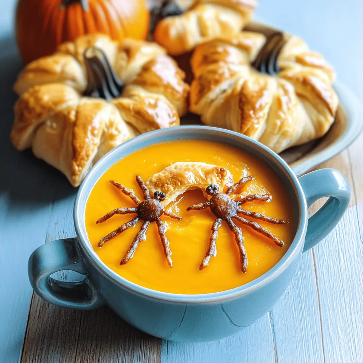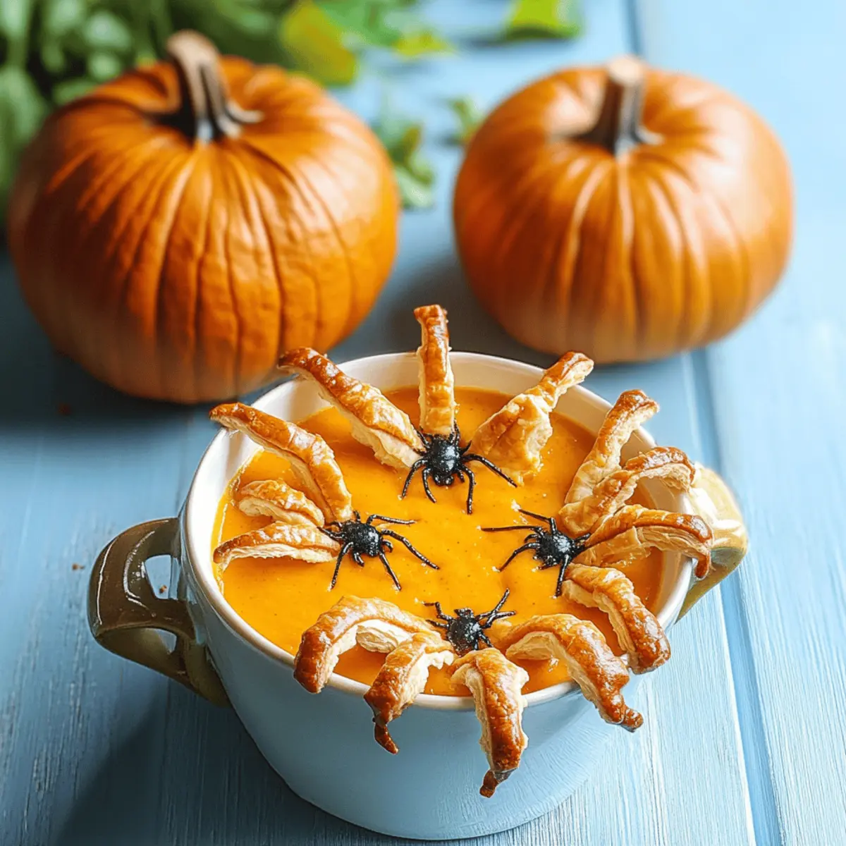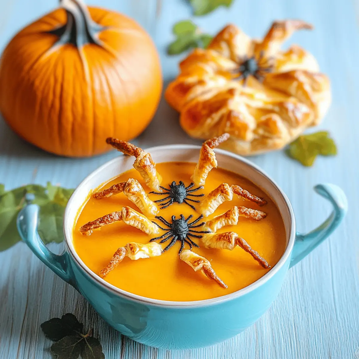 Eine festliche Kürbissuppe zu Halloween, dekoriert mit Blätterteigspinnen, verbindet Komfort und Spaß in einem einfachen Rezept.