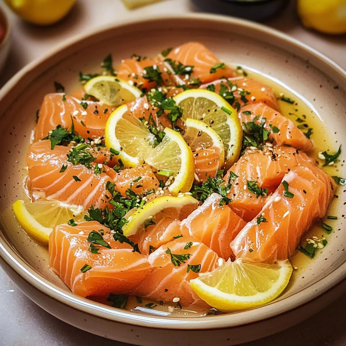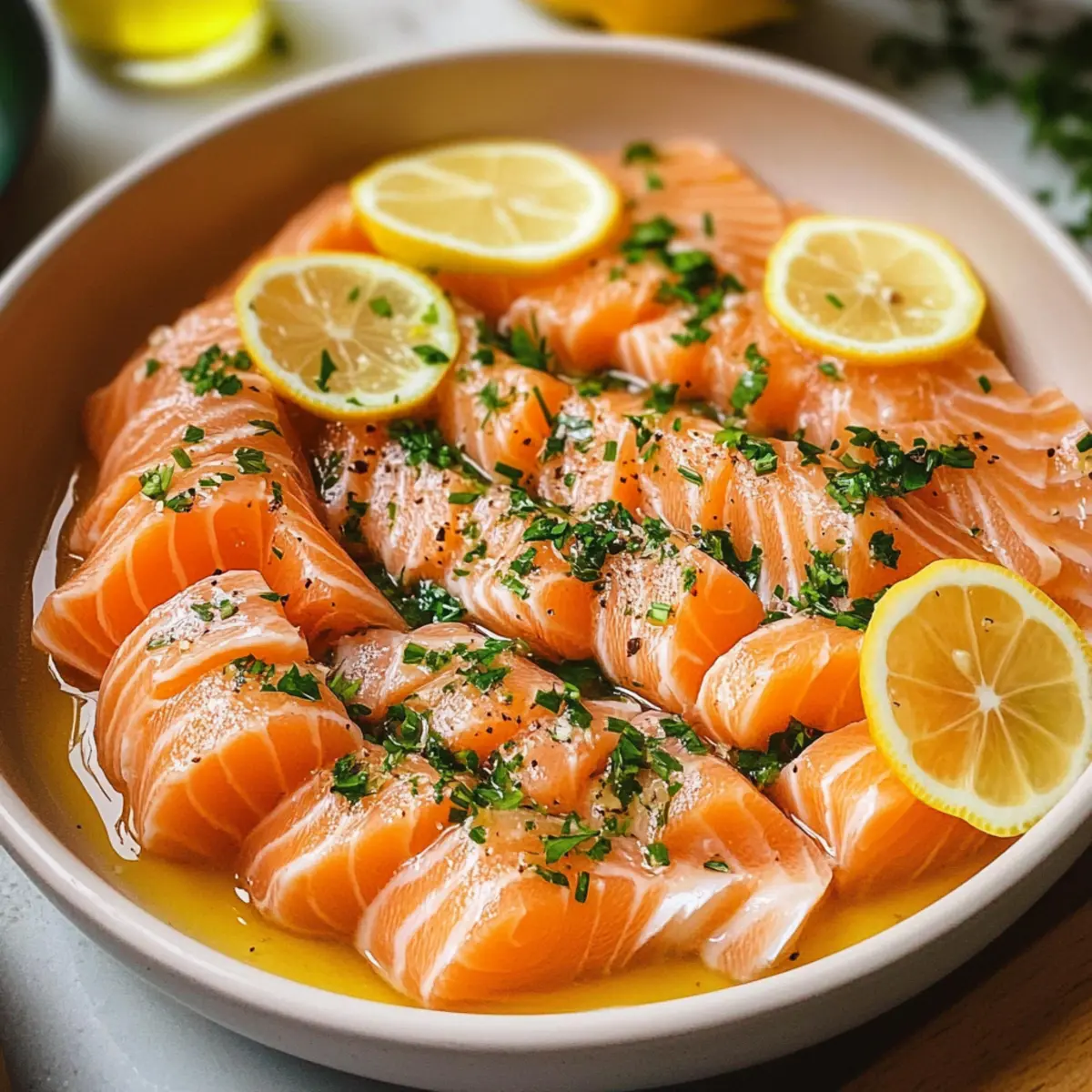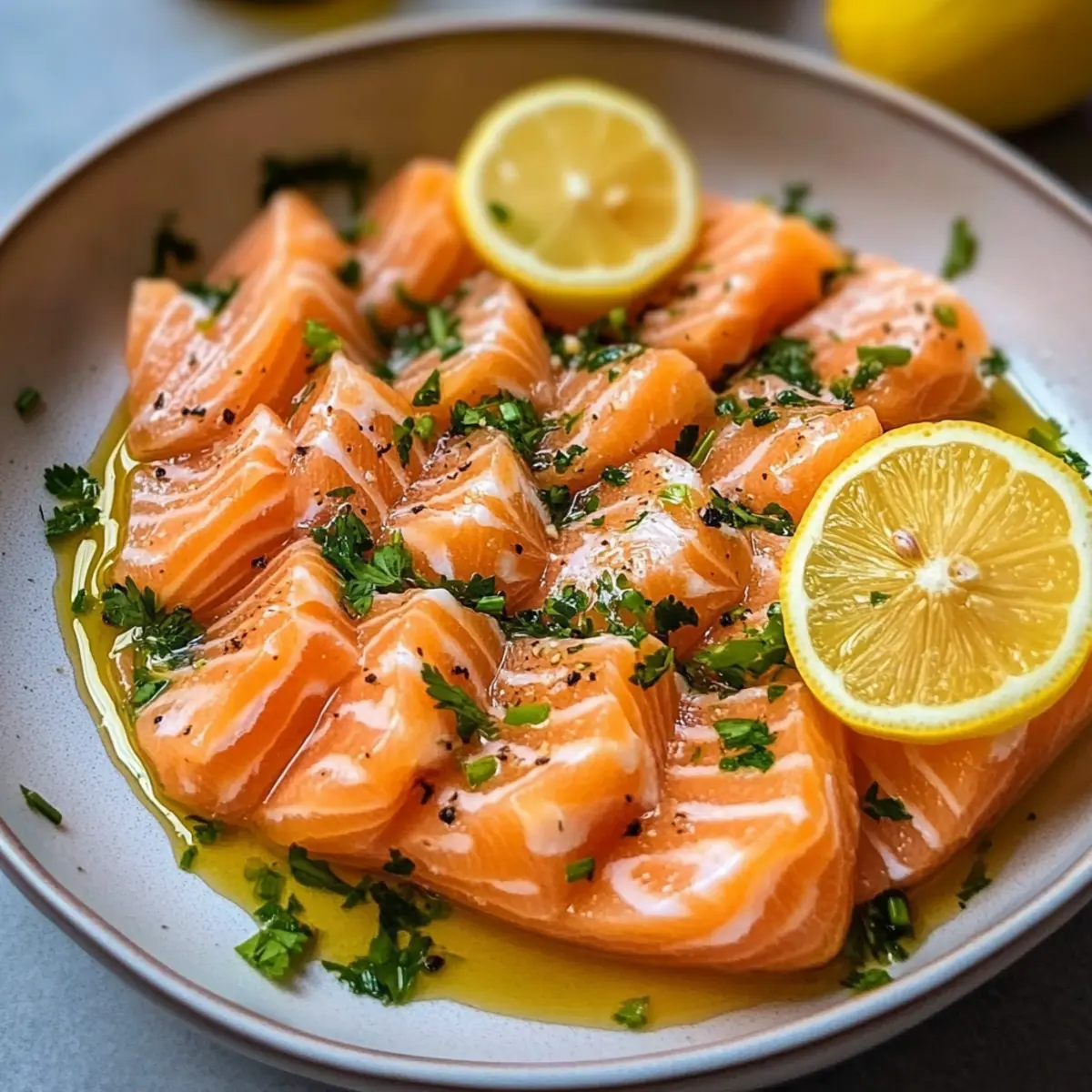 Das erste Mal, als ich Lachs Crudo mit asiatischem Dressing zubereitete, kam ich mir wie ein echter Gourmetkoch vor – und das in nur 10 Minuten! Diese köstliche Vorspeise ist nicht nur blitzschnell zubereitet, sondern auch eine wunderbare Möglichkeit, frischen, qualitativ hochwertigen Lachs zu genießen. Mit seiner Kombination aus zarten Lachsfilets und einem lebhaften Dressing ist dieses Gericht nicht nur glutenfrei, sondern auch kalorienarm, was es zur perfekten Wahl für jeden macht, der auf seine Ernährung achten möchte. Ich kann es kaum erwarten, euch zu zeigen, wie man diese exquisite Speise zubereitet. Glaubt mir, nach diesem Rezept wird jeder Biss eure Geschmacksknospen aktivieren! Seid ihr bereit, in die Welt des Lachs Crudo einzutauchen? Warum lieben alle Lachs Crudo? Einfachheit: Die Zubereitung dauert nur 10 Minuten, was bedeutet, dass du schnell ein leichtes und frisches Gericht zaubern kannst. Zartes Aroma: Das Zusammenspiel von saftigem Lachs und einem würzigen asiatischen Dressing sorgt für ein geschmackliches Erlebnis, das man nicht so schnell vergisst. Gesund und lecker: Mit nur etwa 334 Kalorien pro Portion ist dieses Rezept perfekt für gesundheitsbewusste Genießer. Vielseitig: Du kannst das Rezept leicht anpassen, indem du Zutaten wie Avocado oder Chili hinzufügst, um deinem Gericht eine persönliche Note zu verleihen. Beeindruckend: Ideal für Dinnerpartys oder als erfrischende Vorspeise – dein Publikum wird begeistert sein! Entdecke auch unsere anderen gesunden Rezepte, um deine Kochkünste zu erweitern. Lachs Crudo – Asiatisches Dressing Zutaten • Für die Zubereitung: Lachs – Verwende frischen Sushi-Qualität-Lachs für den besten Geschmack und eine zarte Textur. Knoblauch – Frisch gehackter Knoblauch verleiht dem Gericht ein intensives Aroma. Koriander – Frisch gehackter Koriander bringt ein helles, kräuteriges Element; kann durch Petersilie ersetzt werden. Zitrone – Dünn geschnittenen Zitronen verleihen Frische und Säure. • Für das Dressing: Sojasauce – Hochwertige japanische Sojasauce sorgt für umami Tiefe im Dressing. Sesamöl – Fügt Nussigkeit und Tiefe hinzu; die Menge nach persönlichem Geschmack anpassen. Zitronensaft – Für die nötige Frische und Säure; nach Belieben dosieren. Zucker – Balanciert die Aromen im Dressing; nach Geschmack zugeben, um die Süße anzupassen. Genießt die Frische von Lachs Crudo mit asiatischem Dressing und überzeugt eure Gäste mit diesem köstlichen, glutenfreien und kalorienarmen Rezept! Schritt-für-Schritt-Anleitung für Lachs Crudo mit Asiatischem Dressing Step 1: Zutaten vorbereiten Beginne damit, den frischen Sushi-Qualitätslachs in dünne, gleichmäßige Scheiben zu schneiden. Verwende ein scharfes Messer, um saubere Schnitte zu gewährleisten. Halbiere die Zitrone und schneide sie in dünne Scheiben. Hacke den Knoblauch und den Koriander fein. Lege alles übersichtlich auf einem Schneidebrett bereit, um den nächsten Schritt reibungslos zu gestalten. Step 2: Dressing zubereiten Nehme eine Schüssel und mische die hochwertige Sojasauce, den frisch gepressten Zitronensaft, eine Prise Zucker und das Sesamöl. Rühre die Zutaten gut um, bis sich der Zucker vollständig aufgelöst hat. Schmecke das Dressing ab und passe die Süße und Säure nach deinem persönlichen Geschmack an. Das Dressing sollte eine ausgewogene, würzige Note haben, die das Lachs Crudo optimal ergänzt. Step 3: Lachs und Dressing vermengen In einer großen Schüssel kombinierst du die dünnen Lachsscheiben mit dem gehackten Knoblauch und dem frisch gehackten Koriander. Gieße das vorbereitete Dressing gleichmäßig über die Zutaten und mische vorsichtig, damit der zarte Lachs nicht zerreißt. Diese Kombination sollte gleichmäßig benetzt werden und duftet bereits köstlich. Step 4: Anrichten und servieren Verteile das Lachs Crudo auf hübschen Tellern und garniere es mit den Zitronenscheiben für einen zusätzlichen Frischekick. Achte darauf, dass die Teller ansprechend und einladend aussehen. Serviere das Gericht sofort, um die Frische der Zutaten und die Aromen des asiatischen Dressings optimal zu genießen. Was passt zu Lachs Crudo mit Asiatischem Dressing? Tauche ein in das Erlebnis eines perfekt abgestimmten Menüs, das Lust auf mehr macht! Crisp Gurkensalat: Frische Gurken bringen eine knackige Textur und kühlende Frische, die das Lachs Crudo wunderbar ergänzt. Der zarte Lachs und der knackige Salat harmonieren ideal miteinander und sorgen für einen ausgewogenen Bissen. Jasminreis: Der warme, aromatische Reis bietet eine sanfte Grundlage, die die intensiven Aromen des Lachs Crudo aufgreift. Diese Kombination fördert ein Gefühl von Zufriedenheit, während der Reis die Frische des Lachses wunderbar ausbalanciert. Avocado-Scheiben: Cremige Avocado verleiht dem Gericht eine zusätzliche Dimension, die perfekt zur zarten Textur des Lachses passt. Das Zusammenspiel von Aromen wird jeden Gaumen erfreuen und deine Gäste begeistern. Zitronen-Limetten Spritzer: Ein spritziges Erfrischungsgetränk auf Zitronen- oder Limettenbasis bringt das Gericht auf das nächste Level und passt ideal zu den asiatischen Noten des Dressings. Die frische Säure bietet einen perfekten Kontrast zu den reichhaltigen Aromen. Sesam-Dessert: Ein leichtes Dessert mit Sesam oder Mohn bringt die asiatischen Geschmäcker wieder auf den Tisch und rundet dein Menü ab. Süße und nussige Aromen erzeugen ein befriedigendes Finale nach deinem köstlichen Lachs Crudo. Expertentipps für Lachs Crudo Qualität des Lachses: Verwende ausschließlich frischen Sushi-Qualität-Lachs, um das beste Geschmackserlebnis zu garantieren und gesundheitliche Risiken zu vermeiden. Dressing-Abstimmung: Schmecke das Dressing stets ab, um die Balance zwischen Süße und Säure zu perfektionieren. So bleibt dein Lachs Crudo frisch und geschmackvoll. Sauberkeit beachten: Halte alle Werkzeuge und Arbeitsflächen sauber, um Kontamination zu verhindern, insbes