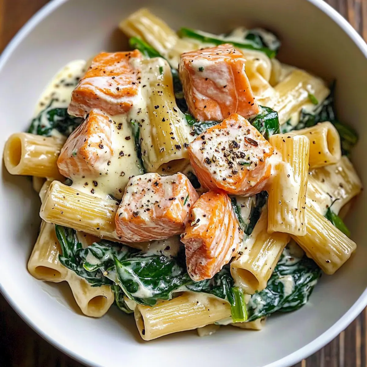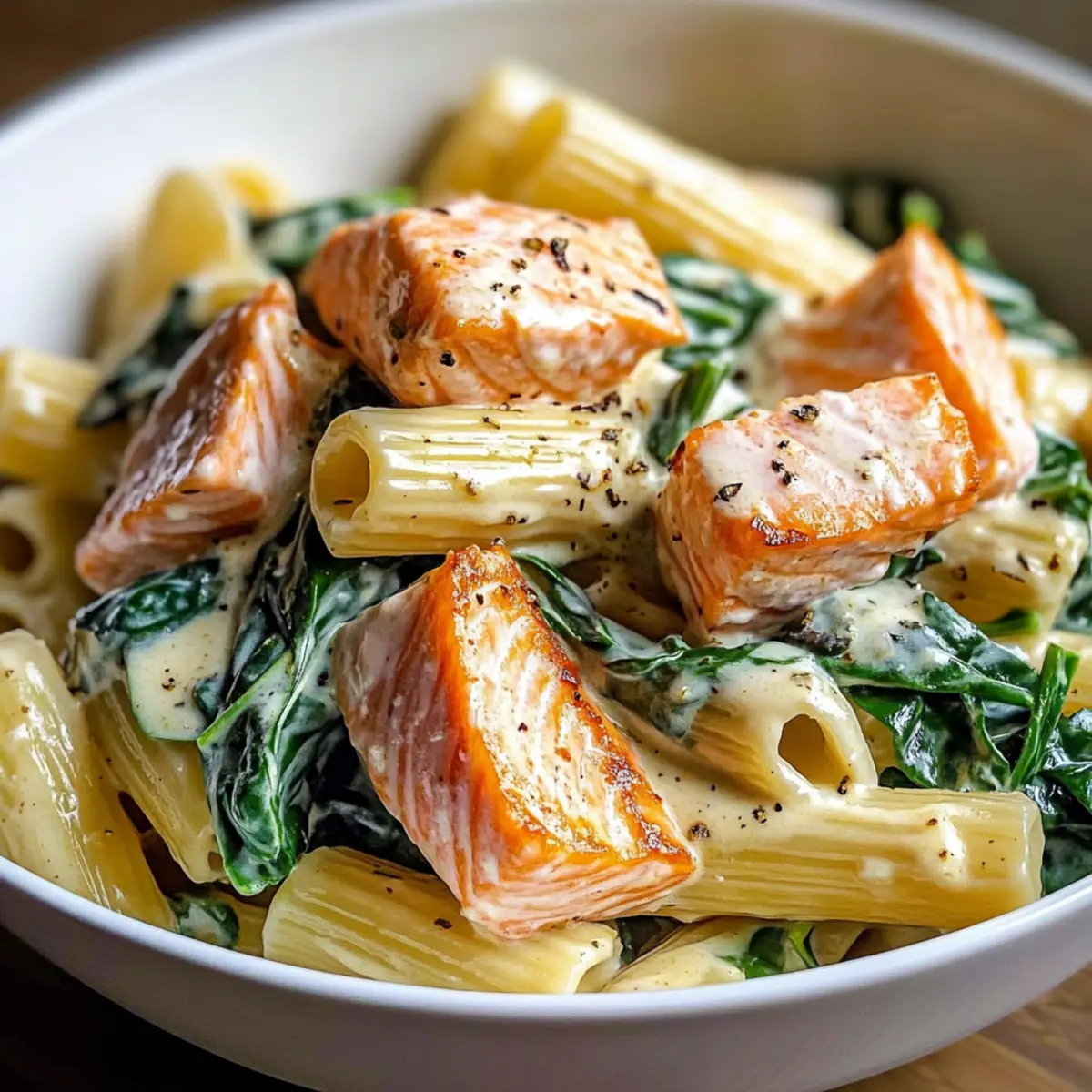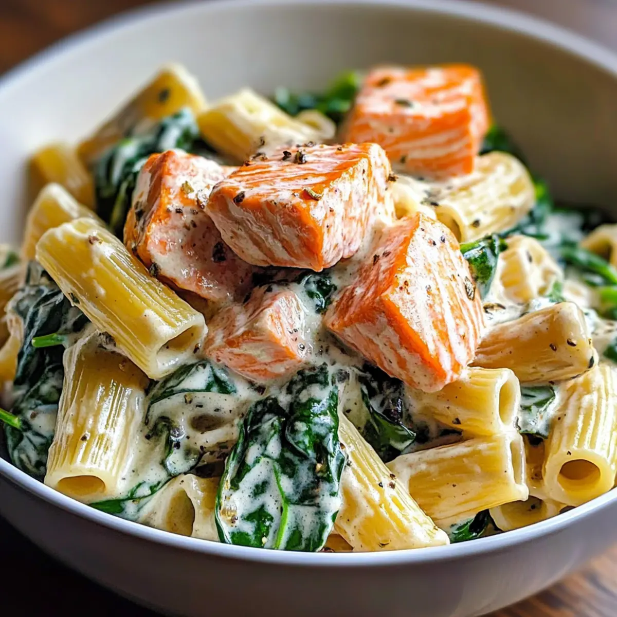 Ein kurzer Blick in meinen Kühlschrank und ich entdecke einen kleinen Schatz: ein paar frische Lachsfilets und einen Bund Babyspinat. Es ist der perfekte Moment, um ein schnelles und gesundes Gericht zu zaubern – meine cremige Lachs Spinat Pasta mit griechischem Joghurt. Diese rundum gelungene Mahlzeit vereint zarten Lachs, nährstoffreichen Spinat und al dente Pasta in einer köstlich leichten Sauce, die ganz ohne schwere Sahne auskommt. Mit nur 20 Minuten Vorbereitungszeit ist sie nicht nur ein Hit bei der Familie, sondern auch ideal für geschäftige Wochentage. Bereit, diesen köstlichen Geheimtipp auszuprobieren? Ich verspreche dir, es wird ein neues Lieblingsrezept! Warum Lachs Spinat Pasta lieben? Einfachheit: Die Zubereitung ist kinderleicht und benötigt keine besonderen Kochkünste – ideal nach einem langen Tag. Gesund und lecker: Mit frischem Lachs und nährstoffreichem Spinat bietet dieses Gericht nicht nur Geschmack, sondern auch wertvolle Nährstoffe, ohne auf Gewicht zu achten. Schnell zubereitet: In nur 20 Minuten zauberst du eine köstliche Mahlzeit, die jeden Abend rettet. Vielseitig kombinierbar: Variiere mit verschiedenen Pasta oder ersetze den Lachs durch Garnelen für einen anderen Genuss! Familienfreundlich: Kinder und Erwachsene werden die cremige Joghurtsauce und den leichten Geschmack lieben – perfekt für alle! Wenn du nach weiteren gesunden Ideen suchst, schau dir auch meine Pfifferlinge mit Spinat oder die Kartoffelpizza mit geräuchertem Lachs an. Lachs Spinat Pasta Zutaten • Erfahre, was du für diese köstliche Lachs Spinat Pasta benötigst, die dich in nur 20 Minuten zu einem gesunden Feierabendessen verhilft! Für die Pasta • Lachsfilet (1 Pfund) – Hauptproteinquelle, die für eine wunderbare Reichhaltigkeit sorgt. Substitution: Kann durch Dosen-Thunfisch oder gegrilltes Hähnchen ersetzt werden. • Rigatoni oder Lieblingspasta (12 oz) – Sorgt für Struktur und Herzhaftigkeit. Vorbereitungshinweis: Al dente kochen, da die Pasta beim Mischen mit der Sauce noch leicht nachgart. • Babyspinat (4 Tassen) – Fügt Nährstoffe und Farbe hinzu. Substitution: Kann auch durch Grünkohl oder Rucola ersetzt werden. Für die Sauce • Griechischer Joghurt (1/2 Tasse) – Stellt eine cremige Sauce ganz ohne schwere Sahne her. Substitution: Kann durch fettarmen Sauerrahm für einen würzigen Geschmack ersetzt werden. • Getrockneter Dill (2 Teelöffel oder 1 Esslöffel frisch) – Gibt der Sauce eine herzhafte Note. Vorbereitungshinweis: Frischer Dill sorgt für intensiveren Geschmack. • Salz (1/2 Teelöffel) – Verstärkt die Aromen des Gerichts. Substitution: Verwende natriumarme Alternativen, wenn gewünscht. • Schwarzer Pfeffer (1/4 Teelöffel) – Fügt eine milde Schärfe hinzu. Substitution: Weißer Pfeffer kann für einen subtileren Geschmack verwendet werden. • Zesten von 1 Zitrone – Bringt Frische in das Gericht. Vorbereitungshinweis: Achte darauf, dass die Zesten von einer unwachsten Zitrone stammen, um den besten Geschmack zu erhalten. • Frischer Zitronensaft – Zusatz von Frische in die Sauce; nach Geschmack anpassen. • Rote Pfefferflocken (1/4 Teelöffel) – Verleiht einen feinen Kick. Substitution: Kann weggelassen werden, um das Gericht milder zu gestalten. Schritt-für-Schritt-Anleitung für Lachs Spinat Pasta mit cremiger Joghurtsauce Schritt 1: Ofen vorheizen und Lachs vorbereiten Heiz den Ofen auf 200 °C vor. Lege das Lachsfilet mit der Hautseite nach unten auf ein mit Backpapier belegtes Blech. Würze den Lachs großzügig mit Dill, Zitronenzesten, Salz und Pfeffer. Diese Gewürze verleihen dem Lachs eine köstliche aromatische Note. Schritt 2: Lachs backen Backe den Lachs im vorgeheizten Ofen für 7-10 Minuten, bis er leicht opak ist und sich leicht mit einer Gabel zerteilen lässt. Achte darauf, dass er nicht übergart, damit er zart und saftig bleibt. Nach dem Backen die Haut entfernen und den Lachs in mundgerechte Stücke zerteilen. Schritt 3: Pasta kochen Koche die Rigatoni in einem großen Topf mit leicht gesalzenem Wasser für 8-10 Minuten, bis sie schön al dente sind. Achte darauf, vor dem Abgießen eine Tasse vom Kochwasser aufzuheben, um die Sauce später cremiger zu machen. Die Pasta sollte innen noch einen leichten Biss haben, da sie beim Mischen mit der Sauce weitergart. Schritt 4: Spinat hinzufügen Gib die abgetropfte Pasta zurück in den Topf und stelle diesen bei niedriger Hitze auf den Herd. Füge den Babyspinat hinzu und rühre um, bis er anfängt zu welken. Das dauert nur etwa 1-2 Minuten. Diese Kombination sorgt für eine gesunde Komponente in deiner Lachs Spinat Pasta. Schritt 5: Sauce anrühren Rühre den griechischen Joghurt, den frischen Zitronensaft und die roten Pfefferflocken vorsichtig unter die Pasta und den Spinat. Füge nach Bedarf etwas vom aufgehobenen Pastawasser hinzu, um die Sauce schön cremig zu machen. Die Konsistenz sollte angenehm sämig sein und die Pasta gleichmäßig umhüllen. Schritt 6: Lachs untermischen Falte die Stücke des gebackenen Lachses sanft unter die Pasta und die Sauce, bis alles gut vermischt ist. Nimm die Pfanne vom Herd, um die zarte Textur des Lachses zu bewahren. Jetzt ist deine Lachs Spinat Pasta bereit, serviert zu werden. Schritt 7: Servieren und genießen Serviere die Lachs Spinat Pasta sofort auf warmen Tellern. Verziere sie nach Belieben mit frischem Dill oder einer Prise frisch geriebenem Parmesan. Die Kombination aus cremiger Joghurtsauce und frischen Zutaten wird deine Familie begeistern! Lagerungstipps für Lachs Spinat Pasta Kühlschrank: Bewahre die Lachs Spinat Pasta in einem luftdichten Behälter im Kühlschrank auf. So hält sie bis zu 3 Tage frisch und genießbar. Einzelne Komponenten: Für längere Haltbarkeit koche den Lachs und die Pasta getrennt, sodass sie bis zu 3 Tage frisch bleiben. Spinat sollte frisch zubereitet werden. Aufwärmen: Zum Aufwärmen die Pasta sanft in der Mikrowelle oder in einer Pfanne mit etwas Wasser erhitz