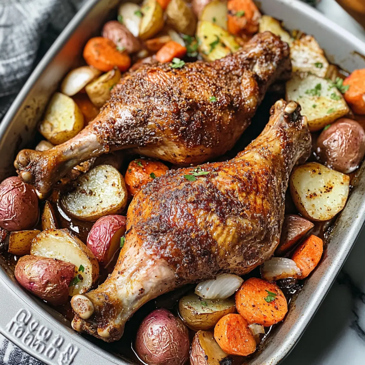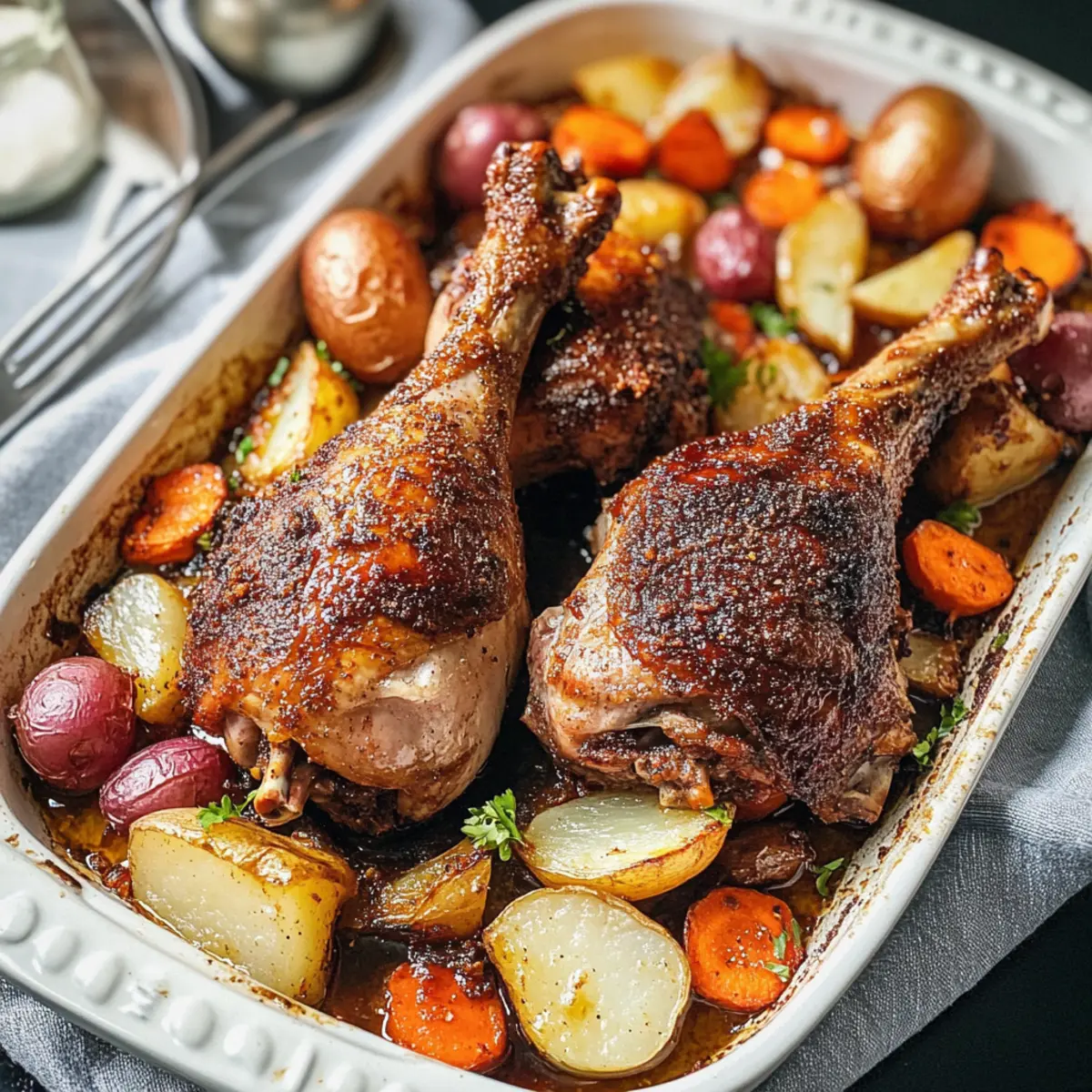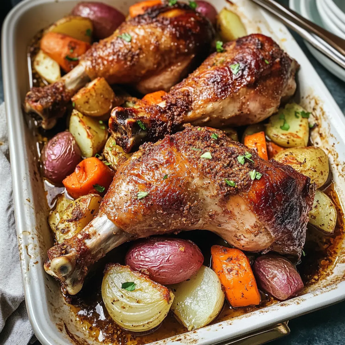 Es war einmal an einem kühlen Winterabend, als ich auf der Suche nach einem herzlichen Rezept war, das nicht nur meine Familie warmhalten, sondern auch den festlichen Spirit auf den Tisch bringen würde. So entstand die Idee für meine langsam gerösteten Truthahnbeine, die mit einer aufregenden chinesisch inspirierten Gewürzmischung verfeinert werden. Diese köstliche Kombination aus Cumin, Sichuan-Pfeffer und Chili sorgt für eine unvergessliche Geschmacksexplosion und verwandelt ein einfaches Gericht in ein Festmahl. Mit nur 15 Minuten Vorbereitungszeit und der Möglichkeit, alles in einer einzigen Pfanne zuzubereiten, sind diese Truthahnbeine nicht nur ideal für Feierlichkeiten, sondern auch eine wunderbare Option für entspannte Familiendinner. Neugierig, wie du dieses zarte, aromatische Gericht auf deinem Tisch zaubern kannst? Lass uns gemeinsam ins Kochen eintauchen! Warum diese Truthahnbeine unwiderstehlich sind Einfachheit: Mit nur 15 Minuten Vorbereitung und einer einzigen Pfanne ist dieses Rezept perfekt für Kochanfänger und vielbeschäftigte Köche. Herzhafter Geschmack: Die Kombination aus Cumin, Sichuan-Pfeffer und Chili verleiht den Truthahnbeinen eine aromatische Tiefe, die jedem Bissen Geschmack verleiht. Vielseitigkeit: Du kannst Gemüse je nach Saison austauschen oder sogar Hähnchenkeulen für eine schnellere Zubereitung verwenden. Crowd-Pleaser: Diese langsam gerösteten Truthahnbeine sind ideal für festliche Anlässe oder entspannte Familienessen. Jeder wird nach mehr verlangen! Zeitersparnis: Das langsame Rösten erfordert kein ständiges Überwachen, sodass du Zeit für andere Dinge hast. Genieße auch passende Beilagen wie eine erfrischende Gurkensalat oder einen bunten Gemüse-Wok. Langsam geröstete Truthahnbeine Zutaten Für die Gewürzmischung Kreuzkümmel – verleiht einen erdigen Wärme. Substitution: Koriander kann für ein andersartiges Geschmacksprofil verwendet werden. Knoblauchpulver – verstärkt die herzhafte Tiefe. Substitution: Frisch gehackter Knoblauch (1-2 Zehen) kann das Pulver ersetzen. Ingwerpulver – garantiert einen würzigen Kick. Substitution: Frischer geriebener Ingwer kann für intensiveren Geschmack sorgen. Chinesische Chiliflocken – sorgen für Schärfe und Geschmack. Substitution: Rote Paprikaflocken oder Cayenne können ebenfalls für Schärfe sorgen. Sichuan-Pfeffer – bietet eine einzigartige betäubende Schärfe. Substitution: Schwarzer Pfeffer kann für einen vertrauteren Geschmack verwendet werden. Zimt – fügt eine süße und warme Note hinzu. Keine direkte Substitution empfohlen. Nelken – bringt ein komplexes Aroma. Substitution: Muskatnuss kann eine mildere Alternative sein. Für die Truthahnbeine Truthahnbeine (2) – Die Hauptzutat, insgesamt etwa 2,3 kg. Wähle Beine mit Haut für eine knusprige Textur. Salz – hebt den Gesamtgeschmack. Stelle nach persönlichem Geschmack ein. Olivenöl – fördert das Rösten und die Geschmackseinbringung. Substitution: Jedes neutrale Öl wie Rapsöl kann verwendet werden. Für die Beilagen Rote Kartoffeln (4) – dienen als herzhafte Gemüsesorten. Substitution: Süßkartoffeln bieten einen anderen Geschmack. Gelbe Zwiebel (1) – fügt beim Karamellisieren eine Süße hinzu. Substitution: Schalotten können einen milderen Geschmack liefern. Karotten (4) – sorgen für Süße und Farbkontrast. Substitution: Pastinaken könnten für eine andere Textur verwendet werden. Schritt-für-Schritt-Anleitung für Langsam geröstete Truthahnbeine mit asiatischen Gewürzen Step 1: Gewürzmischung herstellen In einer kleinen Schüssel vermischst du Kreuzkümmel, Knoblauchpulver, Ingwerpulver, chinesische Chiliflocken, Sichuan-Pfeffer, Zimt und Nelken. Diese aromatische Gewürzmischung wird deinen langsam gerösteten Truthahnbeinen eine wunderbare Tiefe verleihen. Stelle sicher, dass du alles gleichmäßig vermengst, damit die Aromen gut verteilt sind. Step 2: Gemüse vorbereiten Schneide die roten Kartoffeln, die gelbe Zwiebel und die Karotten in gleichmäßige Stücke. Gib das Gemüse in eine große Schüssel und füge 1 Teelöffel der vorbereiteten Gewürzmischung sowie eine Prise Salz und etwas Olivenöl hinzu. Mische alles gut durch, bis das Gemüse gleichmäßig beschichtet ist und die Farben frisch leuchten. Step 3: Gemüse anrichten Lege das vorbereitete, gewürzte Gemüse gleichmäßig auf ein mit Alufolie ausgelegtes Backblech. Achte darauf, dass mehr Platz zwischen den Gemüsestücken bleibt, um eine gleichmäßige Röstung zu ermöglichen. Das Gemüse wird eine köstliche Basis für deine langsam gerösteten Truthahnbeine bilden und während des Garens die Aromen aufnehmen. Step 4: Truthahn würzen Patte die Truthahnbeine mit einem Küchentuch trocken, um überschüssige Feuchtigkeit zu entfernen. Bestreiche die Beine mit Olivenöl und reibe dann 2 Teelöffel der Gewürzmischung pro Bein ein. Lege die vorbehandelten Truthahnbeine auf das Gemüse im Blech und lasse sie 15 Minuten marinieren, damit sie die Gewürze gut aufnehmen können. Step 5: Abdecken und garen Heize deinen Ofen auf 350°F (176°C) vor. Decke das Blech mit Alufolie ab und brate die langsam gerösteten Truthahnbeine mit dem Gemüse für etwa 2 Stunden. Verwende ein Fleischthermometer, um sicherzustellen, dass das Fleisch eine Innentemperatur von 160°F (71°C) erreicht hat, bevor du die Folie abnimmst. Step 6: Haut knusprig machen Nach dem Braten der Truthahnbeine bei 350°F (176°C) erhöhe die Ofentemperatur auf 400°F (200°C). Entferne die Alufolie und backe die Beine für 15 Minuten weiter, damit die Haut knusprig und goldbraun wird. Achte darauf, dass die Haut schön spröde ist, während das Gemüse daneben weiter gart. Step 7: Ruhen lassen und servieren Nimm die langsam gerösteten Truthahnbeine aus dem Ofen und lasse sie 10 Minuten ruhen. Dies hilft, die Säfte im Fleisch zu halten und sorgt für zartes, aromatisches Fleisch. Serviere die Truthahnbeine zusammen mit dem würzigen Gemüse direkt 