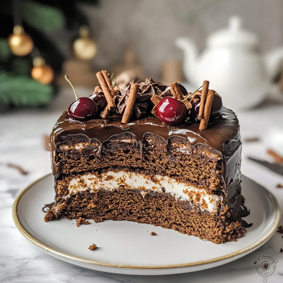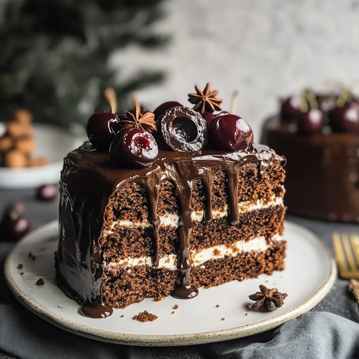 Es war einmal ein kalter Winterabend, als der Duft von frisch gebackenem Lebkuchen durch meine Wohnung zog und Erinnerungen an fröhliche Feiertage hervorrief. Diese Festliche Lebkuchen Torte mit Kirschen ist nicht nur ein unkomplizierter Genuss – sie vereint saftige Schichten mit samtiger Vanille-Mascarpone-Creme und süßen, gewürzten Zimt-Kirschen. Die Krönung bildet eine luxuriöse dunkle Schokoladenganache, die das Ganze perfekt abrundet. Warum solltest du dich für diese Torte entscheiden? Erstens, sie ist ein echter Hingucker und ein herzlicher Publikumsliebling, ideal für festliche Zusammenkünfte. Und zweitens, sie lässt sich wunderbar vorbereiten, so dass du mehr Zeit mit deinen Liebsten verbringen kannst! Bist du bereit, ein Stück dieses himmlischen Feiertagsgenusses zu kreieren? Warum wirst du diese Lebkuchen Torte lieben? Einfachheit: Die Zubereitung dieser Lebkuchen Torte ist unkompliziert und erfordert nur grundlegende Backfähigkeiten – perfekt für jeden, der gerne frisch gebackenes Gebäck genießt. Reiche Aromen: Die harmonische Kombination aus Vanille-Mascarpone-Creme und würzigen Zimt-Kirschen sorgt für einen wahren Geschmacksrausch, der die Festtage zum Leuchten bringt. Wohlfühl-Gefühl: Diese Torte vereint Tradition und Moderne und wird zum Highlight jeder Weihnachtsfeier – deine Gäste werden begeistert sein! Vorbereitungsmöglichkeit: Du kannst die Torte im Voraus zubereiten, sodass du am Festtag mehr Zeit mit deinen Liebsten verbringen kannst. Vielseitigkeit: Mit einfachen Variationen wie anderen Früchten oder Geschmacksrichtungen kannst du diese Torte jedes Mal neu gestalten und anpassen – für unbegrenzte Möglichkeiten! Lebkuchen Torte Zutaten • Mit diesen Zutaten gelingt dir die perfekte Lebkuchen Torte mit Kirschen! Für den Teig Eier – sorgen für Struktur und Feuchtigkeit; am besten Zimmertemperatur verwenden. Zucker – verleiht Süße; kann mit Kokoszucker für eine weniger raffinierte Option ersetzt werden. Mehl – gibt Stabilität; Allzweckmehl oder eine glutenfreie Mischung sind ideal. Gemahlene Mandeln bzw. Haselnüsse – fügt Geschmack und Feuchtigkeit hinzu; kann durch gemahlene Walnüsse ersetzt werden. Backpulver – als Treibmittel wichtig; auf Frische achten für besten Auftrieb. Neutrales Pflanzenöl – sorgt für Feuchtigkeit; auch geschmolzenes Kokosöl eignet sich gut. Naturjoghurt – sorgt für Cremigkeit; griechischer Joghurt gibt eine dickere Konsistenz. Zimt – würzt den Teig; nach Belieben anpassen. Abrieb einer unbehandelten Orange – bringt zitronige Frische. Lebkuchengewürz – verleiht den traditionellen Lebkuchen-Geschmack. Für die Füllung und Garnierung Milch – sorgt für Eleganz in der Creme; Mandel- oder Hafermilch für eine milchfreie Option verwenden. Eigelb – verdickt die Creme. Speisestärke – stabilisiert und verdickt die Creme. Vanilleextrakt – sorgt für intensivsten Vanillegeschmack. Mascarpone – gibt eine cremige Textur; Frischkäse ist eine gute Alternative. Kirschen – sorgen für Süße und Säure; frische oder gefrorene Kirschen verwenden, wenn sie Saison haben. Sahne – für die Ganache und Dekoration; darauf achten, dass sie einen hohen Fettgehalt hat. Zartbitterkuvertüre – für Geschmack und Überzug; Milchschokolade kann für eine süßere Variante verwendet werden. Lebkuchen und Haselnüsse – zur Dekoration für einen festlichen Look. Diese Zutaten werden diese festliche Lebkuchen Torte mit Kirschen zu einem unvergesslichen Erlebnis machen! Schritt-für-Schritt-Anleitung zur Lebkuchen Torte mit Kirschen Schritt 1: Ganache vorbereiten Schneide die Zartbitterkuvertüre klein und gib sie in eine Schüssel. Erhitze die Sahne in einem kleinen Topf, bis sie fast kocht, und gieße sie dann über die Schokolade. Rühre die Mischung gut um, bis sie eine glatte Ganache ergibt, und lasse sie über Nacht bei Raumtemperatur abkühlen und eindicken. Schritt 2: Pudding zubereiten Vermische in einer Schüssel die Speisestärke mit dem Eigelb und einem Spritzer Milch. In einem anderen Topf erhitze die restliche Milch mit dem Zucker und Vanilleextrakt, bis sie leicht dampft. Gieße die Stärkemischung langsam hinzu und rühre ständig, bis der Pudding eindickt. Lass den Pudding ganz abkühlen und stelle ihn über Nacht in den Kühlschrank. Schritt 3: Kuchenschichten vorbereiten Heize den Ofen auf 175°C vor und fette eine 20 cm runde Backform ein. Schlage die Eier mit dem Zucker und einer Prise Salz in einer Schüssel schaumig. Mische das Mehl, die gemahlenen Mandeln, das Backpulver und die Gewürze in einer separaten Schüssel und falte sie vorsichtig unter die Eiermasse. Gib das neutrale Öl und den Naturjoghurt hinzu und vermenge alles gut. Schritt 4: Backen Gieße den Teig in die vorbereitete Backform und backe ihn etwa 120 Minuten, oder bis ein Zahnstocher sauber herauskommt. Lass den Kuchen nach dem Backen in der Form abkühlen, bevor du ihn vorsichtig auf einem Kuchengitter vollständig abkühlen lässt. Schneide den abgekühlten Kuchen horizontal in drei gleich dicke Schichten. Schritt 5: Füllung vorbereiten Mische die abgekühlte Puddingmasse mit dem Mascarpone in einer Schüssel und schlage die Mischung, bis sie glatt und cremig ist. Diese köstliche Vanille-Mascarpone-Creme wird die lebendigen Schichten deiner Lebkuchen Torte mit Kirschen perfekt ergänzen. Schritt 6: Zimt-Kirschen machen Gebe die Kirschen zusammen mit ein wenig Saft, Zucker und einem Teelöffel Speisestärke in einen kleinen Topf. Erwärme die Mischung und lasse sie unter ständigem Rühren köcheln, bis sie beginnt einzudicken. Lass die Zimt-Kirschen dann etwas abkühlen, bevor du sie für die Torte verwendest. Schritt 7: Torte zusammenstellen Lege die erste Kuchenschicht auf einen servierfähigen Teller. Verteile die Hälfte der Vanille-Mascarpone-Creme gleichmäßig darauf und füge die Hälfte der Zimt-Kirschen hinzu. Setze die zweite Kuchenschicht darauf und wiederhole diesen Vorgang. Schließl