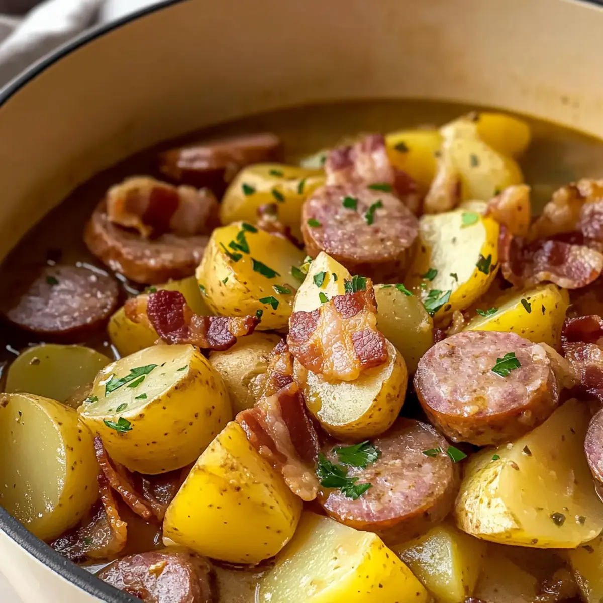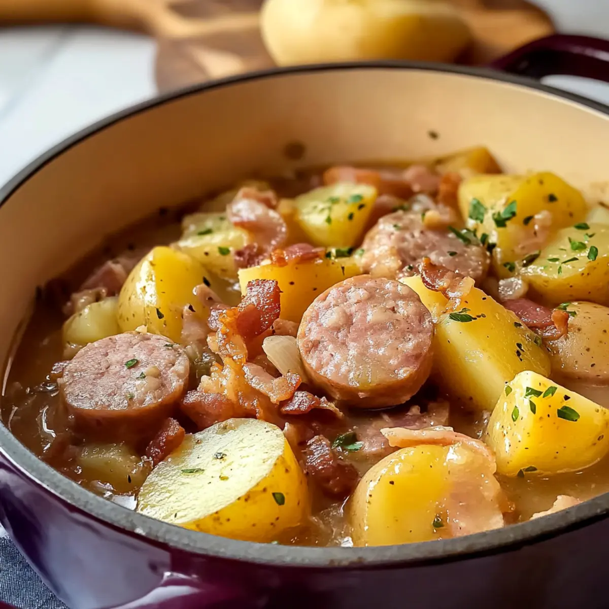 In der Kälte eines tristen Abends, während der Wind gegen die Fenster peitscht, gibt es nichts Besseres als eine köstliche, warme Suppe. Mein herzhaftes Rezept für leckeren irischen Würstchen und Kartoffeleintopf bringt Gemütlichkeit in dein Zuhause und sorgt für zufriedene Gesichter am Familientisch. Mit einfachen Zutaten wie saftigem Schweinefleisch und zarten Kartoffeln ist dieses Gericht nicht nur ein kinderleichtes, sondern auch ein echtes Seelenwärmer-Erlebnis. Außerdem wird das Ganze in einem einzigen Topf zubereitet – so hast du in kürzester Zeit ein unwiderstehliches, sättigendes Abendessen. Neugierig, wie du dieses traditionelle Rezept ganz einfach nachkochen kannst? Lass uns gemeinsam in die Welt des irischen Comfort Foods eintauchen! Warum wirst du dieses Rezept lieben? Herzhaft und nahrhaft: Dieser irische Würstchen und Kartoffeleintopf ist der Inbegriff von Comfort Food, das Herz und Bauch gleichermaßen wärmt. Einfache Zubereitung: Mit nur wenigen Grundzutaten schmeckst du die Tradition Irlands in jedem Bissen. Perfekte Konsistenz: Die zarten Würstchen und Kartoffeln verschmelzen harmonisch mit der aromatischen Brühe. Zeitloser Geschmack: Ideal für kalte Abende und gesellige Familienessen, wird dieser Eintopf zum Favoriten für jeden Anlass. Eine Topf-Lösung: Mit minimalem Aufräumaufwand kannst du dich ganz auf den Genuss konzentrieren. Für eine köstliche Beilage empfehle ich dieses Rezept für Schnell Und Einfach. Klassisch und doch kreativ: Probiere Variationen mit verschiedenen Gemüse oder substituiere die Würstchen je nach Vorliebe. Schauen auch bei unserem leckeren Birnen Bohnen Und vorbei! Leckeres irisches Würstchen und Kartoffeleintopf Zutaten • Für alle, die sich nach einem herzhaften Gericht sehnen, ist dieses Rezept perfekt! Für den Eintopf Schweinewürstchen – Sie liefern das Hauptprotein und die reichhaltige Würze; wähle eine hochwertige Wurst für den besten Geschmack. Bacon (8 oz) – Sorgt für eine tiefe Geschmacksebene mit knuspriger Textur; dick geschnittener Bacon bringt mehr Biss. Hühnerbrühe (1,5 Tassen) – Bildet die Basis des Eintopfs und verleiht Feuchtigkeit und Reichtum; für eine leichtere Version kann Gemüsebrühe verwendet werden. Kartoffeln (7) – Unverzichtbar für Fülle und Konsistenz; diese sollten 1,5 cm dick geschnitten werden, damit sie beim Kochen ihre Form behalten. Yukon Gold sind eine beliebte Wahl. Zwiebeln (3) – Sorgen für eine süßliche Note und Tiefe; dünn in Ringe geschnitten, damit sie gleichmäßig garen. Salz – Hebt den Gesamtgeschmack hervor; bitte je nach Salzgehalt der Wurst anpassen. Frisch gemahlener schwarzer Pfeffer – Fügt Wärme und Komplexität hinzu; frisch gemahlen sorgt für das beste Aroma. Frische Petersilie (2 Esslöffel, gehackt) – Dient als frische Garnitur; alternativ können Schnittlauch oder Frühlingszwiebeln verwendet werden. Getrockneter Thymian (1/2 Teelöffel) – Perfekte Ergänzung, die die Fleischaromen hervorhebt; für Abwechslung kann auch getrockneter Rosmarin genutzt werden. Koche dieses leckere irische Würstchen und Kartoffeleintopf und genieße einen warmen, herzlichen Abend! Schritt-für-Schritt-Anleitung für leckeres irisches Würstchen und Kartoffeleintopf Step 1: Zutaten vorbereiten Die Kartoffeln schälen und in 1,5 cm dicke Scheiben schneiden. Die Zwiebeln in Ringe schneiden und den Bacon würfeln. All diese Zutaten bereitstellen, damit du in der nächsten Phase schnell mit dem Kochen beginnen kannst. Step 2: Würstchen und Bacon anbraten In einem schweren Topf bei mittlerer bis hoher Hitze die ganzen Schweinewürstchen und den gewürfelten Bacon für etwa 8-10 Minuten braten, bis sie schön gebräunt sind. Das gebratene Fleisch dann beiseitelegen, um die Aromen für den Eintopf zu bewahren. Step 3: Brühenbasis herstellen Die Hühnerbrühe in den selben Topf gießen und mit einem Holzlöffel die angebratenen Bratreste vom Boden kratzen, um zusätzlichen Geschmack zu gewinnen. Den getrockneten Thymian hinzufügen und die Gewürze nach Bedarf anpassen, bevor es weitergeht. Step 4: Zutaten schichten Einen Drittel der Kartoffelscheiben gleichmäßig in den Topf legen, gefolgt von der Hälfte der Zwiebelringe und der Hälfte der angebratenen Würstchen und des Bacons. Dieser Schichtvorgang wiederholen und mit einer letzten Schicht Kartoffeln abschließen, um alles gut zu lagern. Step 5: Simmern lassen Den Eintopf zum sanften Köcheln bringen, den Topf abdecken und für etwa 1 Stunde kochen lassen, bis die Kartoffeln zart sind. Achte darauf, während des Kochens nicht zu rühren, um die Schichten zu erhalten und die reichhaltigen Aromen zu bewahren. Step 6: Fertigstellen und Servieren Nachdem die Kochzeit abgeschlossen ist, nach Belieben die Gewürze anpassen und die frisch gehackte Petersilie unter den Eintopf rühren. Den heißen Eintopf in Schalen löffeln und frisch servieren, um den größtmöglichen Genuss des leckeren irischen Würstchen und Kartoffeleintopfs zu erleben. Meal Prep für leckeres irisches Würstchen und Kartoffeleintopf Dieser leckere irische Würstchen und Kartoffeleintopf eignet sich hervorragend für die Vorbereitung im Voraus! Du kannst die Kartoffeln (bis zu 24 Stunden) im Voraus schälen und in Wasser lagern, um ein Braunwerden zu verhindern. Darüber hinaus können die Zwiebeln bereits geschnitten und der Bacon gewürfelt werden; beides bleibt im Kühlschrank für bis zu 3 Tage frisch. Achte darauf, alle Zutaten in luftdichten Behältern aufzubewahren, damit die Aromen erhalten bleiben. Wenn du bereit bist, den Eintopf zuzubereiten, erhitze einfach die Brühe, brate die Wurst und den Bacon an und schichte die vorbereiteten Zutaten wie beschrieben. So gelingt dir eine köstliche Mahlzeit an einem stressigen Abend mit minimalem Aufwand! Variationen des leckeren irischen Würstchen und Kartoffeleintopfs Entdecke, wie du dieses köstliche Gericht nach deinem Geschmack anpassen kannst! Leicht und gesund: Tausche di