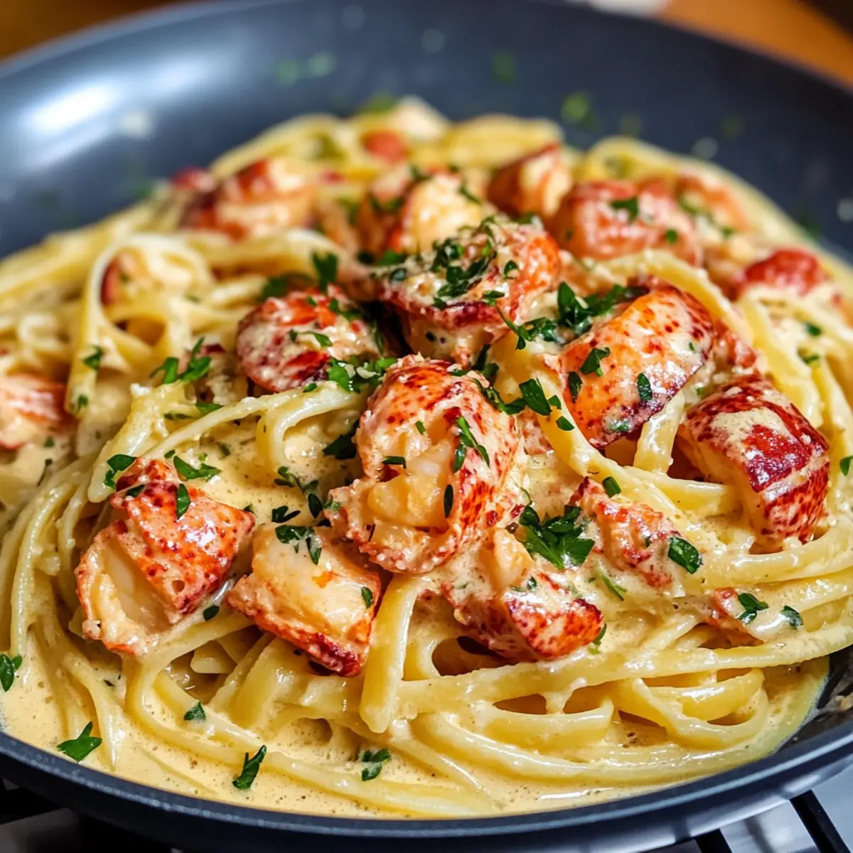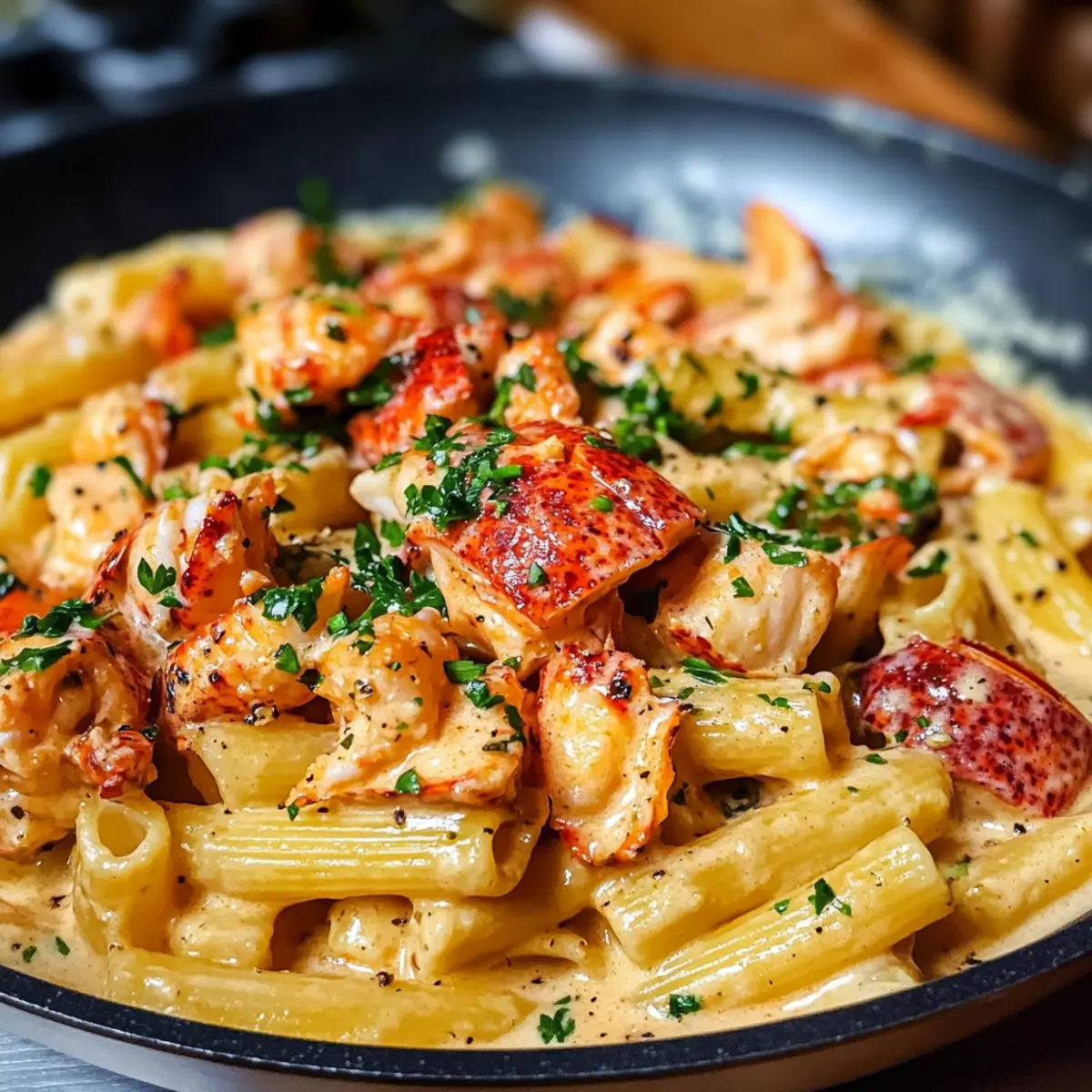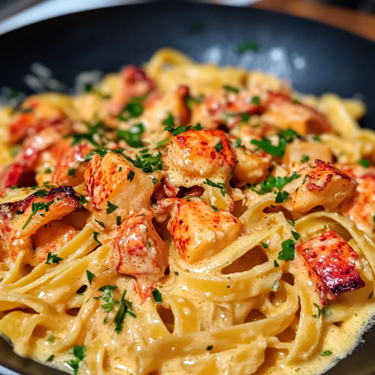 Far away, in einem kleinen Küstendorf, verbrachte ich einen unvergesslichen Abend, als ich mit frischen Hummern beladen in eine einladende kleine Trattoria trat. Das Aroma von würzigem Knoblauch und cremiger Sauce erfüllte den Raum und ließ mein Herz höherschlagen. Heute teile ich mit euch mein Lieblingsrezept: das Lobster Pasta Rezept, das nicht nur in nur 30 Minuten zubereitet ist, sondern auch garantiert alle Gäste begeistert, egal ob beim romantischen Dinner oder beim gemütlichen Abendessen mit Freunden. Diese himmlische Kombination aus zartem Hummer, al dente Pasta und reichhaltiger Sauce wird eure Geschmacksnerven verwöhnen. Seid ihr bereit, euer Kühlschrankabenteuer in eine köstliche Reise zu verwandeln? Warum ist dieses Lobster Pasta Rezept einzigartig? Schnelligkeit: In nur 30 Minuten bereitet ihr ein Festmahl zu, das den perfekten Eindruck hinterlässt. Leckere Aromen: Die Kombination aus frischem Hummer, würzigem Knoblauch und einer cremigen Sauce sorgt für ein Geschmackserlebnis, das jeder lieben wird. Einfachheit: Das Rezept erfordert keine komplizierten Kochtechniken, somit ist es ideal für jeden Küchenchef, egal ob Anfänger oder Profi. Vielseitigkeit: Verfeinert das Gericht nach eurem Geschmack mit Gemüse oder einem Hauch von Schärfe; für jeden Gaumen ist etwas dabei! Küchenabenteuer: Lasst euch inspirieren, ein köstliches Gericht zu kreieren, das eure Liebsten begeistert, wie zum Beispiel mit einem frischen Salat als Beilage! Lobster Pasta Rezept Zutaten Für die Pasta • Pasta – Wählt eure Lieblingssorte wie Spaghetti oder Linguini für die beste Textur. • Salz – Zum Würzen des Kochwassers; es verstärkt den Geschmack der Pasta. Für die Sauce • Unsalted Butter – Fügt reichhaltigen Geschmack hinzu, wenn ihr den Hummer anbratet. • Knoblauchzehen – Verleihen der Sauce Tiefe und eine verführerische Aromatik. • Weißwein – Bringt Frische und hilft, die Aromen im Gericht zu intensivieren. • Sahne – Schlüssel für die cremige Sauce; sorgt für ein luxuriöses Mundgefühl. • Pfeffer – Frisch geknackt für zusätzlichen Geschmack; passt gut zu den anderen Aromen. Für die Garnitur • Hummerfleisch – Die Hauptzutat; nutzt eine Mischung aus Klauen- und Schwanzfleisch für Texturvielfalt. • Petersilie – Für Frische und Farbe; verleiht dem Gericht einen hübschen Abschluss. Jedes Element in diesem Lobster Pasta Rezept trägt zu einem unvergesslichen Geschmackserlebnis bei, das perfekt für besondere Anlässe ist! Schritt-für-Schritt-Anleitung für Lobster Pasta Rezept Step 1: Hummer kochen Die zwei Hummer in einem großen Topf mit sprudelndem, salzigem Wasser für etwa 8–10 Minuten kochen, bis sie eine leuchtend rote Farbe annehmen. Anschließend die Hummer vorsichtig herausnehmen, abkühlen lassen und das Fleisch mit einer Schere oder einem Messer herauslösen. Behalte das Hummerfleisch bereit, um es später in die Lobster Pasta einzufügen. Step 2: Pasta zubereiten Setze einen weiteren großen Topf mit Wasser auf und bringe es zum Kochen. Sobald das Wasser sprudelnd kocht, 400 g Pasta hinzufügen und nach den Packungsanweisungen bis zur perfekten al dente-Konsistenz zubereiten, ungefähr 8-10 Minuten. Vergiss nicht, ⅓ Tasse des Nudelwassers aufzuheben, bevor du die Pasta abgießt. Step 3: Zwiebel und Knoblauch anbraten In einer großen Pfanne erhitze bei mittlerer Hitze 2–3 Esslöffel Olivenöl. Füge eine fein gehackte Zwiebel und zwei gehackte Knoblauchzehen hinzu und brate beides für etwa 2–3 Minuten, bis die Zwiebel glasig und der Knoblauch aromatisch ist. Diese aromatische Basis wird die Grundlage für deine köstliche Lobster Pasta schaffen. Step 4: Hummerfleisch hinzufügen Füge das vorbereitete Hummerfleisch in die Pfanne hinzu und brate es für weitere 2 Minuten an, damit es warm wird und die Aromen der Zwiebel und des Knoblauchs aufnimmt. Stelle sicher, dass das Hummerfleisch nicht übergart wird, um seine zarte Textur zu bewahren, denn es wird gleich in die cremige Sauce eingearbeitet. Step 5: Weißwein hinzufügen Gieße 100 ml Weißwein in die Pfanne und lasse es bei mittlerer Hitze für etwa 2–3 Minuten reduzieren. Achte darauf, dabei gelegentlich zu rühren, bis der Alkohol verdampft ist und der Wein die Aromen der anderen Zutaten intensiviert. Dies wird dem Gericht ein frisches, raffiniertes Aroma verleihen. Step 6: Sahne und Gewürze hinzufügen Reduziere die Hitze auf niedrig und gieße 200 ml Sahne in die Pfanne. Mit Salz und frisch gemahlenem Pfeffer abschmecken und gut umrühren, sodass sich die Aromen verbinden. Lass die Sauce etwa 3–4 Minuten köcheln, bis sie leicht eindickt und eine cremige Konsistenz erreicht. Diese reichhaltige Sauce ist das Herzstück deiner Lobster Pasta. Step 7: Pasta unterrühren und anrichten Gebe die abgeseihte Pasta direkt in die Pfanne zur Sauce und verwende eine Zange oder einen Löffel, um alles gut zu vermengen. Wenn die Sauce zu dick ist, füge nach Bedarf etwas von dem aufbewahrten Nudelwasser hinzu, um die gewünschte Konsistenz zu erreichen. Vor dem Servieren mit frischer, gehackter Petersilie garnieren, um dem Gericht eine frische Note zu verleihen. Was serviert man zu Lobster Pasta? Ein köstliches Festmahl lädt ein, den Gaumen mit weiteren geschmacklichen Genüssen zu verwöhnen. Frischer Blattsalat: Dieser leichte Salat mit einer erfrischenden Vinaigrette bietet einen perfekten Kontrast zur cremigen Pasta und hilft, die Aromen auszugleichen. Geröstetes Knoblauchbrot: Weiches, aber knuspriges Brot passt ideal zu diesem Gericht! Es ist perfekt, um die köstliche Sauce aufzusaugen und jedem Bissen zusätzliche Tiefe zu verleihen. Zucchini-Nudeln: Eine gesunde und glutenfreie Alternative! Diese ergänzen nicht nur den Geschmack, sondern sorgen auch für eine schöne Textur und Farbe auf dem Teller. Sie sind eine großartige Möglichkeit, das Gemüse in die Mahlzeit zu integrieren. Chardonnay: Ein leicht gekühlter Chardonnay harmoniert hervorragen