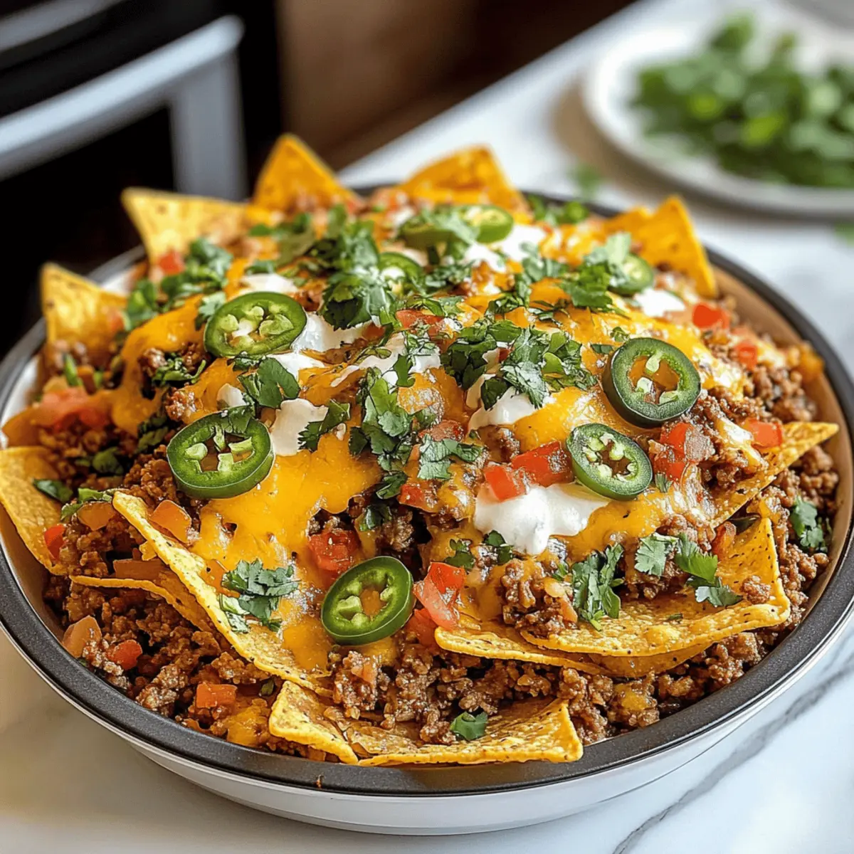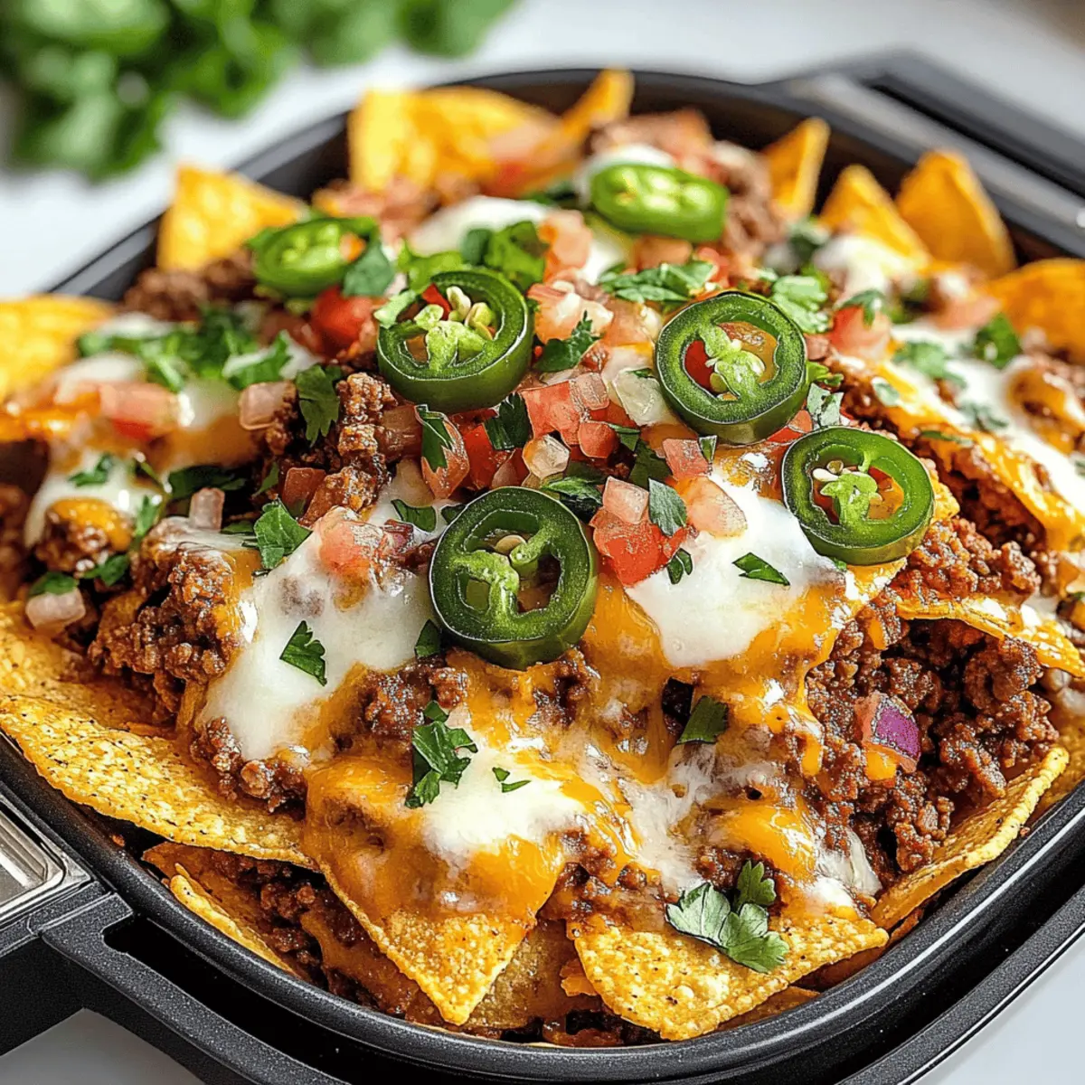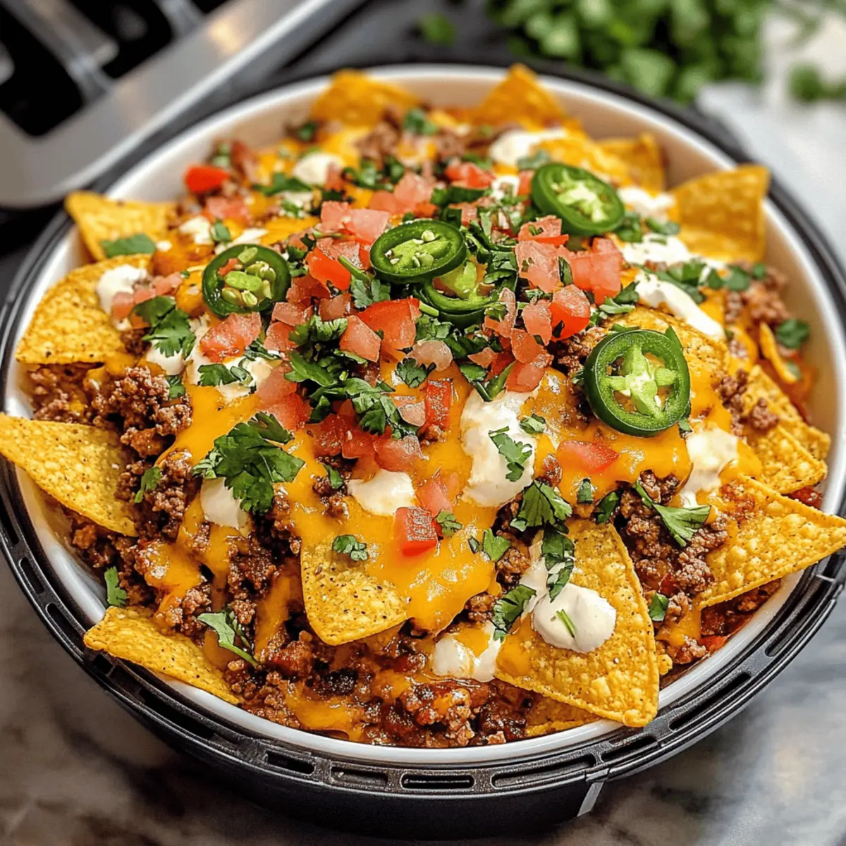 Als ich das erste Mal Luftfritteuse Nachos zubereitete, war ich einfach überwältigt von der knusprigen Perfektion, die ich selbst kreieren konnte. Dieser köstliche Snack ist nicht nur schnell und einfach zuzubereiten, sondern bietet auch unzählige Möglichkeiten zur Personalisierung – perfekt für jedes Treffen oder einen gemütlichen Filmabend. Mit ihren goldenen Chips und dem würzigen, geschmolzenen Käse sind diese Nachos nicht nur ein Gaumenschmaus, sondern auch eine leicht gesündere Alternative zu den klassischen frittierten Varianten. Wer kann da schon widerstehen? Ich kann es kaum erwarten, euch meine liebsten Variationen vorzustellen! Welche wird euer Favorit? Warum werden diese Luftfritteuse Nachos geliebt? Einfachheit: Die Zubereitung dieser Nachos erfordert nur grundlegende Kochkenntnisse und dauert nur wenige Minuten. Vielfalt: Ihr könnt sie nach Belieben anpassen! Vom würzigen Fiesta über mediterrane Aromen bis hin zu süßen Dessertnachos – der Kreativität sind keine Grenzen gesetzt. Gesünder: Durch das Luftfrittieren sind diese Nachos eine leicht gesündere Alternative zu herkömmlich frittierten Snacks. Beliebtheit: Sie sind der perfekte Snack für Partys oder gemütliche Abende zu Hause – sie werden bei euren Gästen garantiert gut ankommen! Probiert sie zusammen mit frischem Guacamole und Salsa für noch mehr Geschmack Salsa-Rezept! Luftfritteuse Nachos Zutaten • Entdecke, wie einfach es ist, deine eigenen Luftfritteuse Nachos zuzubereiten! Für die Chips Tortilla Chips – sie bilden die knusprige Grundlage; dicke Chips sind empfehlenswert für bessere Textur. Für die Füllung Gemahlenes Rindfleisch – sorgt für Proteine und herzhaften Geschmack; du kannst auch mit Putenhack oder einer pflanzlichen Variante austauschen. Taco Gewürz – verleiht dem Fleisch eine würzige Note; selbstgemachtes macht es gesünder. Wasser – bindet die Aromen im Fleisch; benutze Rinderbrühe für mehr Geschmack. Refried Beans – bieten eine cremige Schicht, die die Textur verbessert; black beans sind eine gesunde Alternative. Für den Käse Geriebener Cheddar-Käse – schmilzt und sorgt für eine leckere, käsige Schicht; Monterey Jack oder Pepper Jack sind ebenfalls großartige Optionen. Geriebener Monterey Jack-Käse – sorgt für milde Cremigkeit; Mozzarella ist ebenfalls eine passende Wahl. Für die Toppings Eingelegte Jalapeño-Scheiben – bringen Schärfe und Würze; frische Jalapeños geben einen frischeren Geschmack. Hacker Rote Zwiebel – sorgt für Knusprigkeit und Schärfe; Frühlingszwiebeln sind eine mildere Variante. Frisch gehackter Koriander – als Garnierung steuert er einen frischen Geschmack bei; einfach weglassen oder durch Petersilie ersetzen, wenn gewünscht. Optionale Toppings – saure Sahne, Guacamole, Salsa, Pico de Gallo; passe sie deinen Vorlieben an und füge eventuell fruchtige Salsas für Süße hinzu! Step-by-Step Instructions for Luftfritteuse Nachos Step 1: Rindfleisch zubereiten In einer Pfanne die gemahlenen Rindfleisch bei mittlerer bis hoher Hitze braten, bis es gleichmäßig gebräunt ist. Das überschüssige Fett abgießen und dann das Taco-Gewürz sowie das Wasser hinzufügen. Alles gut vermengen und bei schwacher Hitze köcheln lassen, bis die Mischung dick wird und die Aromen sich entfalten. Step 2: Refried Beans erhitzen Die Refried Beans in einer Mikrowelle oder einem kleinen Topf erhitzen, bis sie gleichmäßig warm sind. Dies dauert etwa 2-3 Minuten in der Mikrowelle. Rühre gelegentlich um, um sicherzustellen, dass sie nicht anbrennen und eine cremige Konsistenz erreichen. Diese Schicht wird den Luftfritteuse Nachos zusätzlichen Geschmack und Textur verleihen. Step 3: Nachos zusammenstellen Den Korb der Luftfritteuse leicht mit Kochspray einsprühen, um ein Ankleben zu vermeiden. Eine Schicht Tortilla Chips gleichmäßig im Korb verteilen. Darauf die erwärmten Refried Beans, die Rindfleischmischung, geriebenen Cheddar und Monterey Jack-Käse, eingelegte Jalapeños sowie gehackte rote Zwiebeln schichten, um Geschmack und Textur zu vereinen. Step 4: Luftfrittieren Die Luftfritteuse auf 175 °C (350 °F) vorheizen. Die vorbereiteten Nachos etwa 3-5 Minuten frittieren, bis der Käse schmilzt und die Chips heiß sind. Achte darauf, den Garvorgang im Auge zu behalten, damit die Nachos nicht verbrennen. Die geschmolzenen Käsebläschen sind ein gutes Zeichen für die perfekte Konsistenz. Step 5: Garnieren und servieren Die fertigen Luftfritteuse Nachos vorsichtig auf eine große Servierplatte geben. Mit frisch gehacktem Koriander garnieren und nach Belieben mit weiteren Toppings wie saurer Sahne, Guacamole und Salsa servieren. Diese köstlichen Nachos sind sofort bereit, genossen zu werden – der perfekte Snack für jeden Anlass! Vorbereiten der Luftfritteuse Nachos für eine stressfreie Zubereitung Diese Luftfritteuse Nachos sind ideal für die Vorbereitung im Voraus, wodurch Sie Zeit in der Küche sparen! Sie können die Rindfleischmischung und die Refried Beans bis zu 24 Stunden im Voraus zubereiten: braten Sie das Rindfleisch mit Taco-Gewürz und kühlen Sie es nach dem Kochen ab, um eine kräftige Aromenentwicklung zu gewährleisten. Die Refried Beans lassen sich einfach erwärmen. Platzieren Sie die vorbereiteten Komponenten in luftdichten Behältern im Kühlschrank für die beste Frische. Bei Bedarf einfach die Tortilla Chips mit den vorgegarten Zutaten belegen und in der Luftfritteuse für 3-5 Minuten auf 175 °C (350 °F) erhitzen, bis der Käse schmilzt und die Chips knusprig sind. So genießen Sie leckere und stressfreie Luftfritteuse Nachos ohne Hektik! Lagerungshinweise für Luftfritteuse Nachos Zimmertemperatur: Die besten Nachos sollte frisch serviert werden. Bei Raumtemperatur sind sie jedoch für etwa 1 Stunde genießbar, bevor die Chips weich werden. Kühlschrank: Reste können in einem luftdichten Behälter bis zu 2 Tage im Kühlschrank aufbewahrt werden. Beachte, dass die Chips dabei möglicherwei