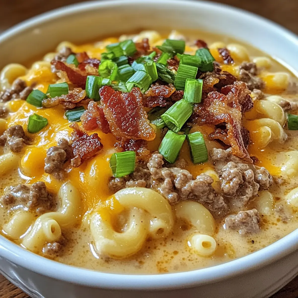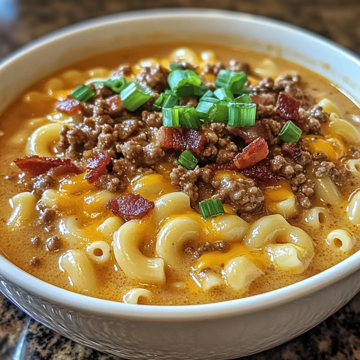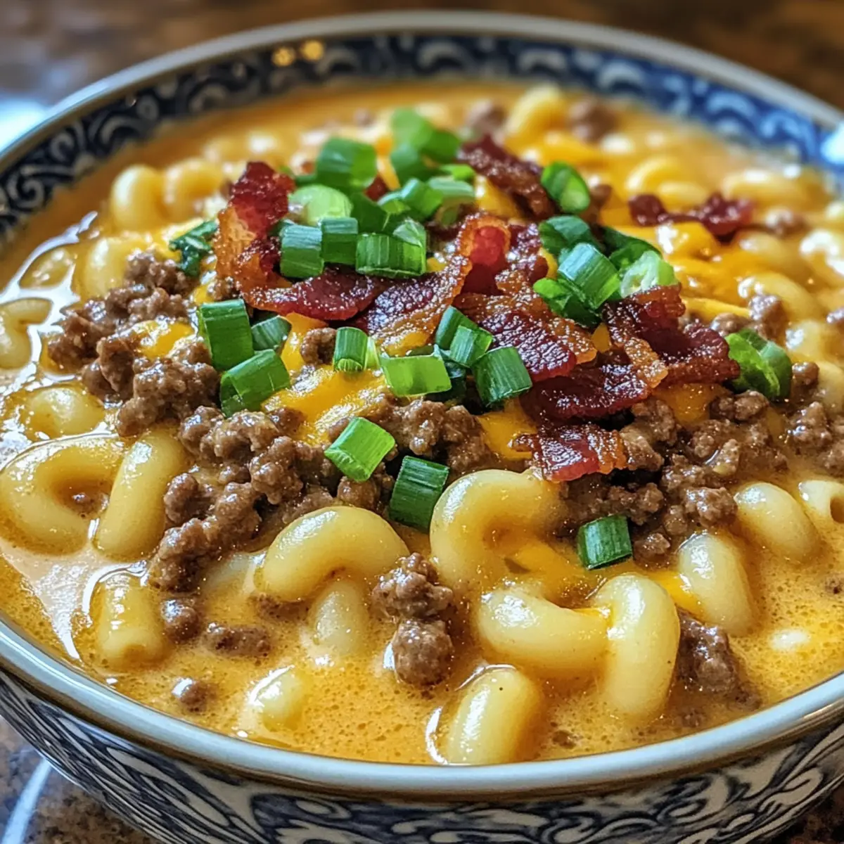 Diese Mac & Cheese Burger Suppe vereint cremigen Käse und würziges Hackfleisch und ist perfekt für kalte Winterabende.