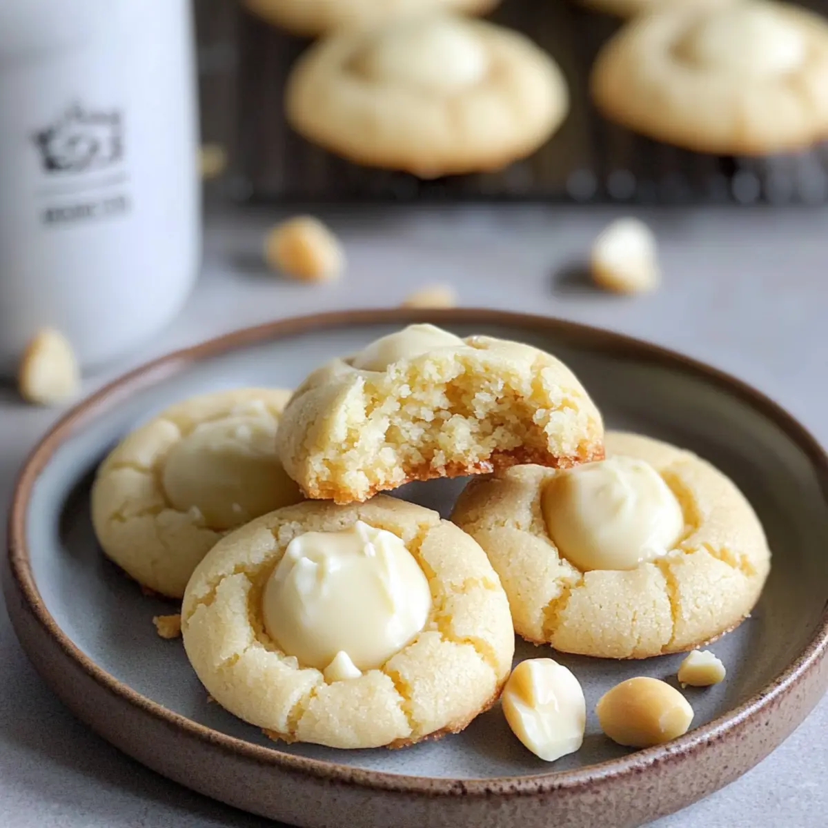 Die Macadamia-Weiße-Schokolade-Küsse eignen sich hervorragend für die Vorbereitung im Voraus! Du kannst den Teig bis zu 24 Stunden im Kühlschrank aufbewahren, um die Aromen zu intensivieren. Forme einfach die Kekse und lagere sie auf einem Backblech im Kühlschrank, bis du bereit bist, sie zu backen. Ebenso kannst du die Kekse nach dem Formen einfrieren und bis zu 3 Monate aufbewahren; einfach direkt aus dem Gefrierfach in den vorgeheizten Ofen schieben. Achte darauf, die Kekse in einem luftdichten Behälter aufzubewahren, um ihre frische Konsistenz zu erhalten. Zum Schluss, wenn die Kekse gebacken und abgekühlt sind, fülle die Vertiefungen mit der geschmolzenen weißen Schokolade und lasse sie in Ruhe fest werden. So hast du im Handumdrehen köstliche Kekse, die genauso lecker sind wie frisch gebacken!