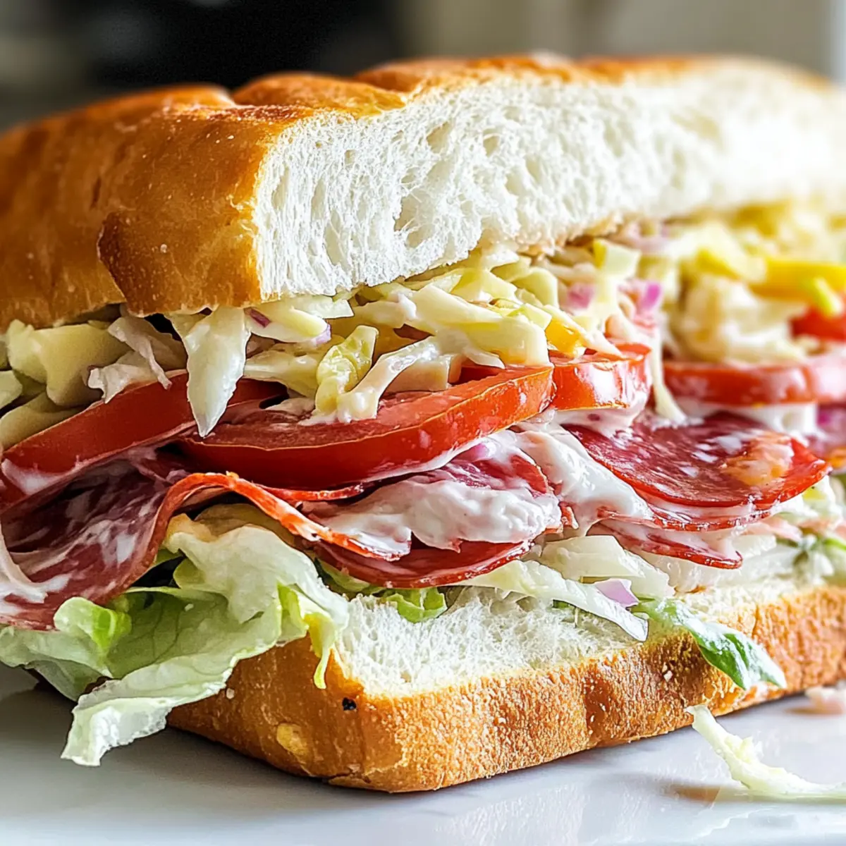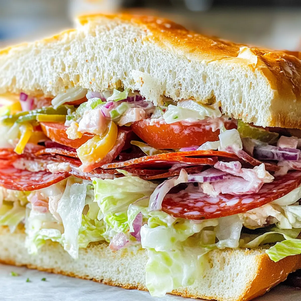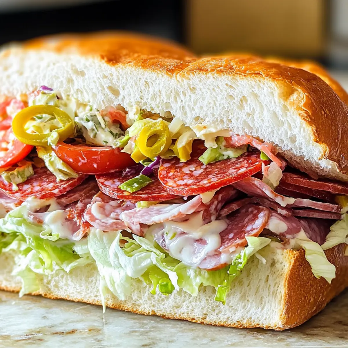 „Hast du schon einmal über die Kombination von frischen Zutaten und herzhaftem Geschmack nachgedacht?“ Bei meinem italienischen Mahlzeit Salat Sandwich wird genau das zum Leben erweckt. Diese herrliche Kreation bietet nicht nur einen köstlichen Genuss, sondern ist zudem auch besonders anpassbar – perfekt für die ganze Familie! Das Rezept vereint knackigen Eisbergsalat, würzige Bananenpfeffer und scharfe rote Zwiebeln in einer cremigen, würzigen Mayonnaise-Dressing, die jeden Bissen zu einem Erlebnis macht. Egal, ob du ein schnelles Mittagessen oder ein Highlight bei einem Treffen kreierst, dieses Sandwich ist ein wahrer Publikumsmagnet und bringt Freude auf den Tisch. Welche aufregenden Variationen wirst du ausprobieren? Lass uns gemeinsam herausfinden, wie du dein eigenes Italian Grinder Sandwich zubereiten kannst! Warum ist dieses Sandwich ein Hit? Vielfalt: Diese Mahlzeit Salat Sandwich bietet unendliche Anpassungsmöglichkeiten, sodass du deine Lieblingszutaten kombinieren kannst, sei es mit Fleisch oder als vegetarische Variante! Frische Zutaten: Mit knackigem Eisbergsalat, würzigen Bananenpeppers und zarten Tomatenscheiben sorgst du für einen erfrischenden Crunch in jedem Bissen. Einfachheit: Die Zubereitung ist kinderleicht und erfordert keine besonderen Kochkünste – perfekt für alle, die sich nach hausgemachtem Essen sehnen. Familienfreundlich: Ein Gericht, das Groß und Klein begeistert, ideal für ein schnelles Mittagessen oder als Highlight beim nächsten Familienessen! Zeitersparnis: Schnell zubereitet und einfach vorzubereiten: mach deine Sandwiches im Voraus und bewahre die Salatzutaten getrennt auf, um die Frische zu erhalten. Entdecke die köstlichen Variationen, die dir zur Verfügung stehen, und bringe mit diesem Rezept frischen Schwung auf deinen Tisch! Mahlzeit Salat Sandwich Zutaten Hinweis: Mit diesen Zutaten wirst du dein eigenes köstliches Mahlzeit Salat Sandwich kreieren! Für das Dressing Mayonnaise – sorgt für Cremigkeit und sollte als Basis für das Dressing verwendet werden; du kannst griechischen Joghurt für eine leichtere Version substituieren. Rotweinessig – fügt Säure hinzu, um die Aromen auszubalancieren; Äpfelessig ist eine gute Alternative. Knoblauchpulver – verstärkt die herzhaften Noten; frischer, gehackter Knoblauch kann ebenfalls verwendet werden. Getrockneter Oregano – sorgt für ein aromatisches Kräuteraroma; frischer Oregano eignet sich auch gut als Ersatz. Salz und Pfeffer – unverzichtbar, um nach Geschmack zu würzen; passe die Menge nach Belieben an. Für den Salat Eisbergsalat – bringt Crunch und Frische; andere Sorten wie Römersalat sind ebenfalls verwendbar. Rote Zwiebel – bietet einen scharfen Geschmack; süße Zwiebel oder Frühlingszwiebeln sind gute Alternativen. Bananenpfeffer – sorgt für einen milden, würzigen Kick; du kannst auch eingelegte Jalapeños oder geröstete Paprika verwenden. Tomate – bringt Frische und Saftigkeit; nutze heirloom oder Fleischtomaten für einen intensiveren Geschmack. Für das Sandwich Sub Rolls – dienen als Basis für das Sandwich; du kannst auch Hoagie-Brötchen oder Ciabatta verwenden. Salami, Pepperoni, Pute – sorgen für eine geschmackliche Vielfalt; ersetze sie durch Schinken oder gegrilltes Gemüse für eine vegetarische Version. Provolone-Käse – schmilzt wunderschön und fügt Reichhaltigkeit hinzu; Mozzarella oder Cheddar sind ebenfalls gut geeignet. Parmesan-Käse – vollendet das Sandwich mit einer salzigen Note; geriebener Pecorino Romano kann hier auch verwendet werden. Entdecke die Möglichkeiten und genieße dein eigenes Mahlzeit Salat Sandwich mit diesen köstlichen Zutaten! Step-by-Step Instructions für das Mahlzeit Salat Sandwich Step 1: Dressing zubereiten In einer großen Schüssel die Mayonnaise, den Rotweinessig, das Knoblauchpulver, den getrockneten Oregano, Salz und Pfeffer gut verrühren, bis die Mischung glatt und cremig ist. Achte darauf, alle Zutaten gleichmäßig zu kombinieren, um ein leckeres Dressing für dein Mahlzeit Salat Sandwich zu erhalten. Dieser Schritt sollte etwa 5 Minuten in Anspruch nehmen. Step 2: Salat mischen Füge den zerkleinerten Eisbergsalat, die geschnittene rote Zwiebel und die Bananenpfeffer zur Dressing-Mischung hinzu. Verwende eine große Zange oder einen Löffel, um die Zutaten vorsichtig zu vermengen, sodass sie gut mit dem Dressing überzogen sind. Mische dies etwa 2-3 Minuten lang, bis alle Komponenten gleichmäßig verteilt und ansprechend bunt sind. Step 3: Sandwich zusammenstellen Halbiere die Sub Rolls längs und lege sie auf ein mit Backpapier ausgelegtes Blech. Beginne mit einer Schicht aus Salami, gefolgt von Pepperoni und Putenbrust. Die Reihenfolge der Fleischsorten ist variabel, achte jedoch darauf, großzügig zu schichten, um den herzhaften Geschmack des Mahlzeit Salat Sandwich zu maximieren. Step 4: Sandwich grillen Lege eine Scheibe Provolone-Käse auf jedes Sandwich und platziere die Blech mit den Sandwiches unter den Grill im Ofen. Lasse sie für 2-3 Minuten grillen, bis der Käse geschmolzen ist und die Ränder der Brötchen schön knusprig sind. Überwache diese Zeit genau, um ein Verbrennen zu vermeiden. Step 5: Sandwich fertigstellen Nehme die Sandwiches vorsichtig aus dem Ofen und füge frische Tomatenscheiben hinzu. Würze mit etwas Salz und Pfeffer und lade dann großzügig die vorbereitete Salatmischung auf jedes Sandwich. Bestreue alles mit geriebenem Parmesan, um den Geschmack des Mahlzeit Salat Sandwich zu intensivieren, bevor du weitermachst. Step 6: Servieren Klappe die Sandwiches zu und schneide sie in der Mitte durch, wenn gewünscht. Serviere dein herzhaftes Mahlzeit Salat Sandwich sofort, um die Frische und den Geschmack voll auszukosten. Dieses Sandwich ist perfekt für ein gemütliches Mittagessen oder als herzhaftes Gericht bei einem gemeinsamen Treffen mit Freunden und Familie. Variationen zum Mahlzeit Salat Sandwich Entdecke die unzähligen Möglichkeiten, 