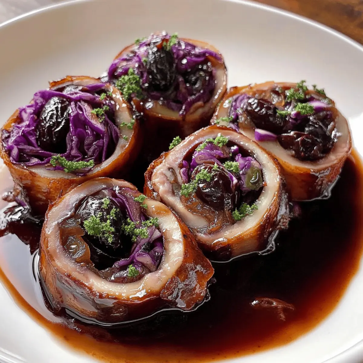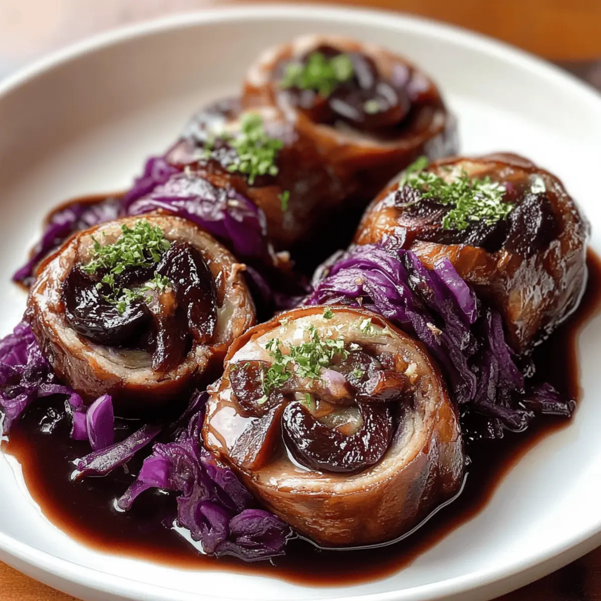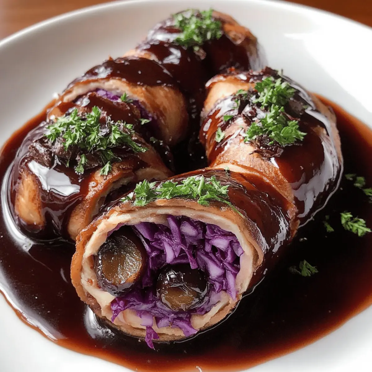 In einem kleinen, gemütlichen Restaurant in den deutschen Alpen stieß ich auf ein Gericht, das mich sofort verzaubert hat: Mini-Schweinerouladen mit Rotkohl und Pflaumen, ummantelt von einer unwiderstehlichen Glühwein-Schokoladensauce. Diese elegante Speise vereint nicht nur die Aromen des Winters, sondern weckt auch die Vorfreude auf gesellige Abende mit Familie und Freunden. Die Vorzüge? Die Zubereitung ist ein Kinderspiel und die Rouladen lassen sich wunderbar im Voraus herstellen, sodass du mehr Zeit mit deinen Liebsten verbringen kannst. Wenn du ein Rezept suchst, das Tradition mit modernem Flair verbindet, dann wirst du die Mini-Schweinerouladen lieben! Was sagst du? Bereit, dein Zuhause in ein winterliches Schlemmerparadies zu verwandeln? Warum wirst du dieses Rezept lieben? Einfachheit: Die Zubereitung der Mini-Schweinerouladen ist unkompliziert, sodass sogar Anfänger problemlos mitmachen können. Wunderbare Aromen: Die Kombination aus Rotkohl und süßen Pflaumen verleiht den Rouladen einen einzigartigen, herzhaften Geschmack, der perfekt zu kalten Winterabenden passt. Vielfältige Variationen: Du kannst ganz einfach mit verschiedenen Füllungen experimentieren, wie zum Beispiel Spinat und Feta für eine leichtere Version. Festliches Erscheinungsbild: Diese elegant angerichteten Rouladen beeindrucken bei jedem Dinner und bringen einen Hauch von Gourmetküche in dein Zuhause. Vorbereitung wird belohnt: Du kannst die Rouladen einen Tag im Voraus zubereiten; so bleibt dir mehr Zeit für deine Gäste, um das Fest in vollen Zügen zu genießen. Wenn du mehr über die passende Beilage erfahren möchtest, schau dir wie wäre es mit butterigen Spätzle an, die das Gesamterlebnis deiner Mahlzeit abrunden! Mini-Schweinerouladen Zutaten Für die Rouladen • Schweineschnitzel – Zartes Fleisch, das die Basis für die Rouladen bildet. Substitution: Dünn geschnittenes Rind- oder Hühnerfleisch kann ebenfalls verwendet werden. • Rotkohl – Verleiht dem Gericht eine fruchtige Note; kann selbstgemacht oder aus dem Handel kommen. Alternativ können gewürzte Äpfel oder Birnen verwendet werden. • Backpflaumen – Süße Akzente, die das Gericht bereichern; bei Bedarf können auch Trockenpflaumen genutzt werden. • Süßer Senf – Fügt Tiefe im Geschmack hinzu. Kann weggelassen werden, wenn nicht verfügbar, beeinflusst jedoch den Geschmack. Für die Sauce • Rotwein – Sorgt für Säure und Reichtum; als alkoholfreie Alternative kann Traubensaft mit einem Spritzer Essig gemischt werden. • Zimtstange, Nelken, Orangenschale – Aromatische Gewürze, die der Sauce Wärme verleihen; essenziell für das Geschmacksprofil. • Brauner Zucker – Balanciert die Säure und fügt Süße hinzu; Honig oder Ahornsirup sind mögliche Alternativen. • Geflügelfond – Gibt der Sauce Tiefe; sowohl selbstgemachte als auch gekaufte Hühnerbrühe sind geeignet. • Dunkle Schokolade – Sorgt für eine seidige Textur in der Sauce; achte darauf, dass sie mindestens 70% Kakao hat für den besten Geschmack. Für das Anbraten • Pflanzenöl – Wird zum Braten der Rouladen verwendet, um eine goldene Kruste zu erreichen. Alternativ kann jedes neutrale Öl eingesetzt werden. Diese Mini-Schweinerouladen mit Rotkohl und Pflaumen sind nicht nur geschmacklich ein Hochgenuss, sondern auch eine wahre Augenweide auf jedem festlichen Tisch! Schritt-für-Schritt-Anleitung für Mini-Schweinerouladen mit Rotkohl und Pflaumen Step 1: Rouladen vorbereiten Die Schweineschnitzel auf etwa 5 mm Dicke klopfen und gleichmäßig mit Salz, Pfeffer und süßem Senf würzen. In die Mitte jedes Schnitzels etwas Rotkohl und eine Backpflaume legen. Die Schnitzel eng aufrollen und mit Küchengarn oder Zahnstocher fixieren, damit die Füllung beim Braten nicht herausfällt. Step 2: Rouladen anbraten In einem großen Topf Pflanzenöl bei mittlerer Hitze erhitzen. Die Rouladen rundherum goldbraun anbraten, was etwa 8-10 Minuten dauert. Die Rouladen sorgfältig herausnehmen und beiseitelegen, um sie im nächsten Schritt wiederverwendet zu können. Step 3: Sauce zubereiten Im gleichen Topf den Rotwein hinzufügen, um den Bratensatz zu lösen, und dabei die Temperatur erhöhen. Die Zimtstange, Nelken, Orangenschale und den braunen Zucker hinzufügen. Die Flüssigkeit für ca. 5 Minuten köcheln lassen, bis sie um die Hälfte eingekocht ist, und dann den Geflügelfond dazugießen. Step 4: Rouladen schmoren Die Rouladen zurück in den Topf geben und alles zum Kochen bringen. Dann die Hitze reduzieren, den Deckel auflegen und die Rouladen bei niedriger Temperatur für etwa 50 Minuten schmoren lassen, bis sie zart sind und sich leicht aufschneiden lassen. Step 5: Sauce vollenden Nach dem Schmoren die Rouladen vorsichtig herausnehmen und warmhalten. Die Sauce durch ein feines Sieb gießen, um die Gewürze zu entfernen, und dann die dunkle Schokolade in die heiße Sauce einrühren, bis sie vollkommen geschmolzen und die Sauce samtig ist. Step 6: Anrichten Die Mini-Schweinerouladen in Scheiben schneiden und großzügig mit der Glühwein-Schokoladensauce überziehen. Diese köstlichen Rouladen werden idealerweise mit Beilagen wie Spätzle oder Selleriepüree serviert, um das festliche Abendessen abzurunden. So bereitest du Mini-Schweinerouladen im Voraus perfekt vor! Die Mini-Schweinerouladen mit Rotkohl und Pflaumen sind ideal für die Vorbereitung und helfen dir, wertvolle Zeit zu sparen! Du kannst die Rouladen bereits bis zu 24 Stunden im Voraus zubereiten. Bereite die Rouladen vor, indem du die Schnitzel klopfst, würzt und mit Rotkohl und Backpflaumen füllst. Rolle sie fest ein und bewahre sie im Kühlschrank auf. Die Sauce lässt sich ebenfalls bis zu 3 Tage vor dem Servieren vorbereiten; einfach zubereiten und im Kühlschrank aufbewahren. Achte darauf, die Rouladen vor dem Braten aus dem Kühlschrank zu nehmen, damit sie Zimmertemperatur erreichen, und warm halte die Sauce beim Wiedererhitzen auf niedriger Stufe, um ihre Qualität