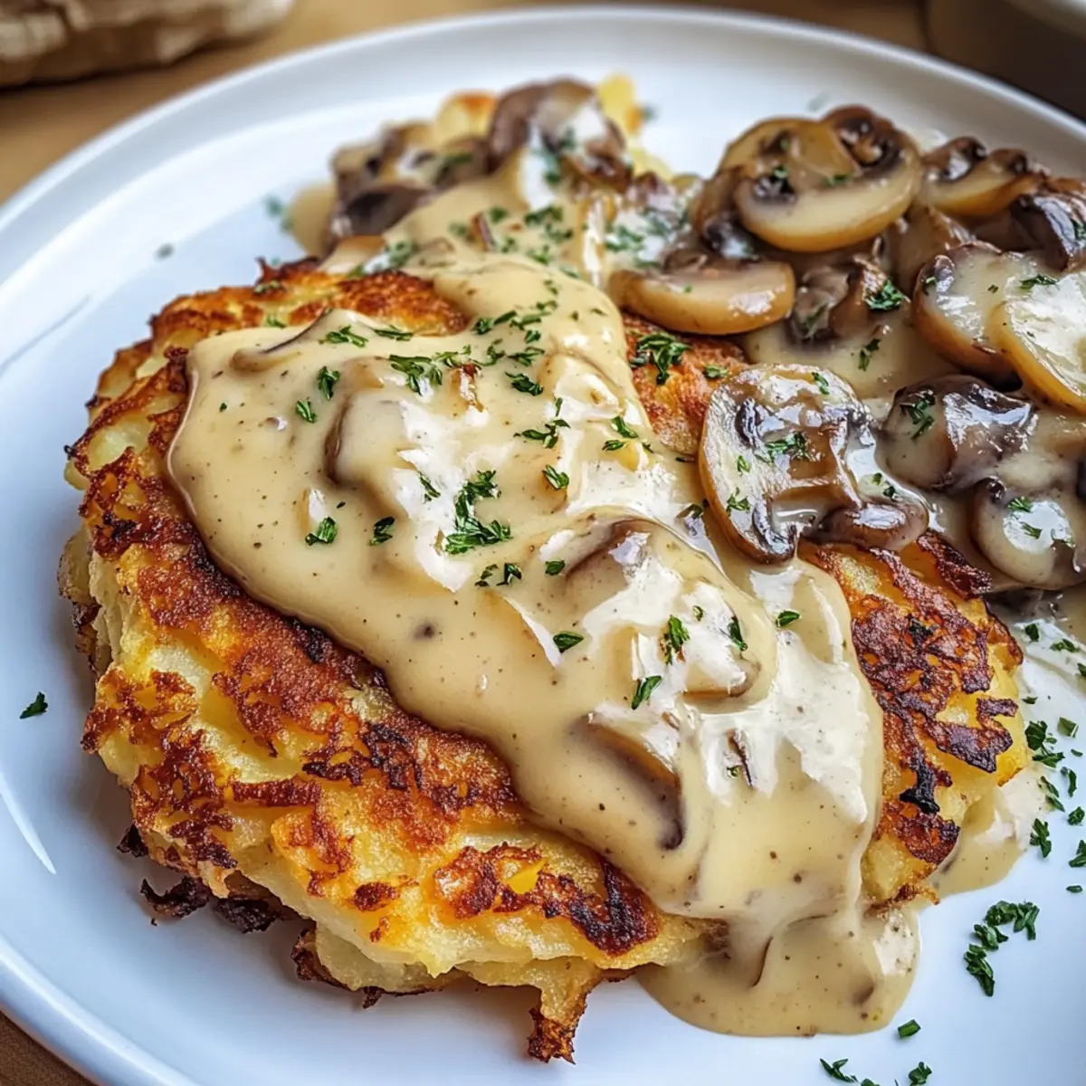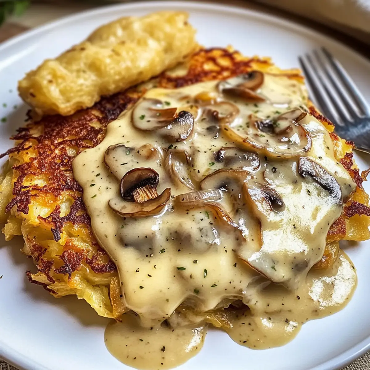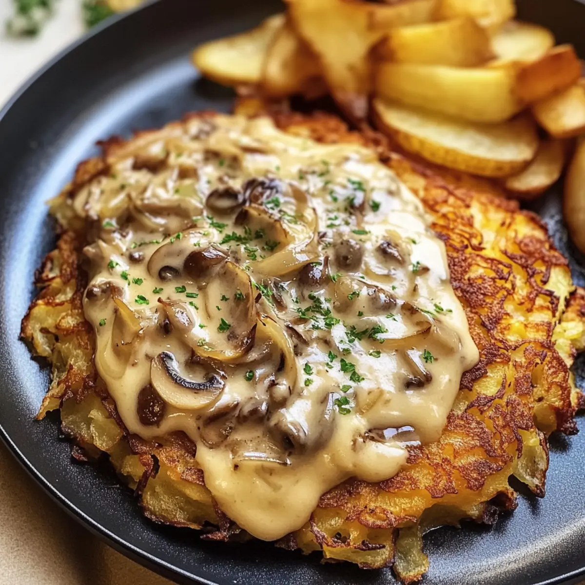 Der Duft von knusprigen Rösti verrät es sofort – ein echtes Wohlfühlessen ist in der Mache! Heute lasse ich dich meine Lieblingszubereitung entdecken: Mozzarella Rösti mit Zwiebel-Pilzrahmsoße. Diese vegetarische Köstlichkeit vereint die goldbraun gebratenen Rösti mit einer cremigen, reichhaltigen Sauce, die nicht nur schnell zubereitet ist, sondern auch jeden Esser begeistert. Die Kombination aus geschmolzenem Mozzarella und dem herzhaften Geschmack von Zwiebeln und Champignons sorgt für ein herzhaftes Genusserlebnis, das perfekt für entspannte Abende oder besondere Anlässe geeignet ist. Wie schmeckt für dich der perfekte Kompromiss zwischen Komfort und raffiniertem Genuss? Lass uns gemeinsam in die Küche gehen und dieses Geschmackserlebnis zaubern! Warum werden Sie dieses Rezept lieben? Einfachheit, die überzeugt: Die Zubereitung ist unkompliziert und erfordert nur grundlegende Küchenkenntnisse. Cremige Textur, die verführt: Die Kombination aus Mozzarella und Sahne sorgt für ein unwiderstehlich reichhaltiges Mundgefühl. Vielfältige Variationen laden zum Experimentieren ein: Ersetzen Sie die Champignons durch Spinat oder fügen Sie frische Kräuter hinzu. Schnelle Zubereitung für busy Tage: In weniger als 30 Minuten genießen Sie ein vollwertiges, vegetarisches Gericht. Beliebtheit bei allen: Perfekt für Familienessen oder spontane Abendessen mit Freunden! Zutaten für Mozzarella Rösti mit Zwiebel-Pilzrahmsoße • Entdecken Sie die perfekten Zutaten für dieses köstliche Gericht! Für die Rösti Festkochende Kartoffeln – der Hauptbestandteil sorgt für Struktur und Knusprigkeit; Yukon Gold oder rote Kartoffeln sind wunderbare Alternativen. Mozzarella – bringt Cremigkeit und Geschmack; frischer Mozzarella schmilzt ideal, aber auch fettreduzierter kann verwendet werden, wenn Sie es leichter mögen. Zwiebeln – verleihen der Sauce Süße und Tiefe; verwenden Sie Schalotten für einen milderen Geschmack, wenn gewünscht. Für die Sauce Champignons – dieser Schlüsselbestandteil sorgt für Umami in der cremigen Sauce; ersetzen Sie sie durch andere Pilze wie Cremini oder Portobello für einen anderen Geschmack. Sahne – macht die Sauce unwiderstehlich cremig; als vegane Alternative eignet sich Kokosmilch oder pflanzliche Sahne. Öl – unerlässlich zum Braten der Rösti, um eine knusprige Textur zu erzielen; wählen Sie je nach Vorliebe zwischen Pflanzenöl oder Olivenöl. Jede dieser köstlichen Zutaten trägt dazu bei, dass Ihr Mozzarella Rösti mit Zwiebel-Pilzrahmsoße ein Genuss wird! Schritt-für-Schritt-Anleitung für Mozzarella Rösti mit Zwiebel-Pilzrahmsoße Step 1: Kartoffeln vorbereiten Reibe die festkochenden Kartoffeln grob und drücke die überschüssige Feuchtigkeit mit einem sauberen Küchentuch aus. Dies ist entscheidend, um die Knusprigkeit der Rösti zu gewährleisten. Limitiere die Feuchtigkeit, um eine perfekte Textur zu erreichen. Step 2: Rösti formen Vermische die geriebenen Kartoffeln mit etwas Salz in einer großen Schüssel. Teile die Mischung in Portionen und forme sie zu gleichmäßigen Patties. Achte darauf, dass sie nicht zu dick sind, um gleichmäßiges Braten zu ermöglichen. Step 3: Rösti braten Erhitze eine großzügige Menge Öl in einer großen Pfanne bei mittelhoher Hitze. Lege die geformten Rösti vorsichtig in die Pfanne und brate sie für etwa 4–5 Minuten pro Seite, bis sie goldbraun und knusprig sind. Wende die Rösti vorsichtig mit einem Spatel. Step 4: Sauce kochen Erhitze in einer separaten Pfanne etwas Öl und sote die fein gehackten Zwiebeln und Champignons bei mittlerer Hitze, bis sie weich und karamellisiert sind, etwa 5–7 Minuten. Achte darauf, dass die Zwiebeln eine goldene Farbe annehmen. Step 5: Sahne hinzufügen Gib die Sahne zu der Zwiebel-Pilz-Mischung und lasse alles sanft köcheln. Rühre die Sauce gut um und lasse sie einige Minuten köcheln, bis sie leicht eingedickt ist. Diese cremige Basis wird der Höhepunkt deiner Mozzarella Rösti mit Zwiebel-Pilzrahmsoße. Step 6: Mozzarella einrühren Füge den gewürfelten Mozzarella in die Sauce und rühre kräftig um, bis der Käse geschmolzen und gleichmäßig verteilt ist. Die Kombination aus geschmolzenem Mozzarella und der cremigen Sauce verleiht dem Gericht eine köstliche Note. Step 7: Servieren Nimm die knusprigen Rösti aus der Pfanne und richte sie schön auf Tellern an. Löffle großzügig die Zwiebel-Pilzrahmsoße über die Rösti. Die Kombination aus knusprigem und cremigem Genuss wird alle begeistern, die diese vegetarische Köstlichkeit probieren. Vorbereitung für Mozzarella Rösti mit Zwiebel-Pilzrahmsoße Die Zubereitung von Mozzarella Rösti mit Zwiebel-Pilzrahmsoße lässt sich wunderbar im Voraus planen und spart so wertvolle Zeit an einem hektischen Wochentag. Die geriebenen Kartoffeln können bis zu 24 Stunden im Kühlschrank aufbewahrt werden, nachdem Sie die Feuchtigkeit sorgfältig ausgepresst haben, um die Knusprigkeit zu bewahren. Auch die Zwiebel-Pilzrahmsoße lässt sich super vorbereiten und bleibt 3 Tage kühl und frisch. Um die beste Qualität zu gewährleisten, bewahren Sie die Sauce in einem luftdichten Behälter auf und erhitzen sie nur sanft vor dem Servieren, damit der Mozzarella nicht austrocknet. Wenn Sie bereit sind zu genießen, braten Sie einfach die vorbereiteten Rösti frisch an und kombinieren Sie diese mit der warmen Sauce. So genießen Sie ein köstliches, stressfreies Abendessen! Expert Tips für Mozzarella Rösti Maximale Knusprigkeit: Stelle sicher, dass du die geriebenen Kartoffeln gründlich ausdrückst, um überschüssige Feuchtigkeit zu entfernen. Das ist der Schlüssel zur perfekten Knusprigkeit deiner Rösti. Rösti in Portionen braten: Brate die Rösti in kleinen Gruppen, um eine Überlappung in der Pfanne zu vermeiden. So wird jede Rösti gleichmäßig knusprig und lecker. Variationen ausprobieren: Experimentiere mit anderen Gemüsesorten wie Spinat oder anderen Pilzen, um deinem Mozzarella Rö