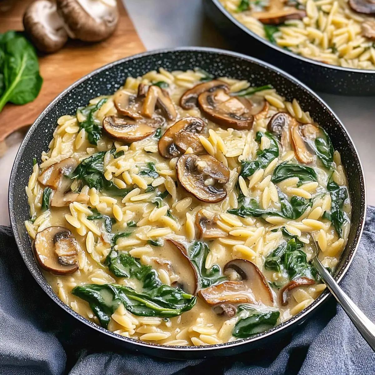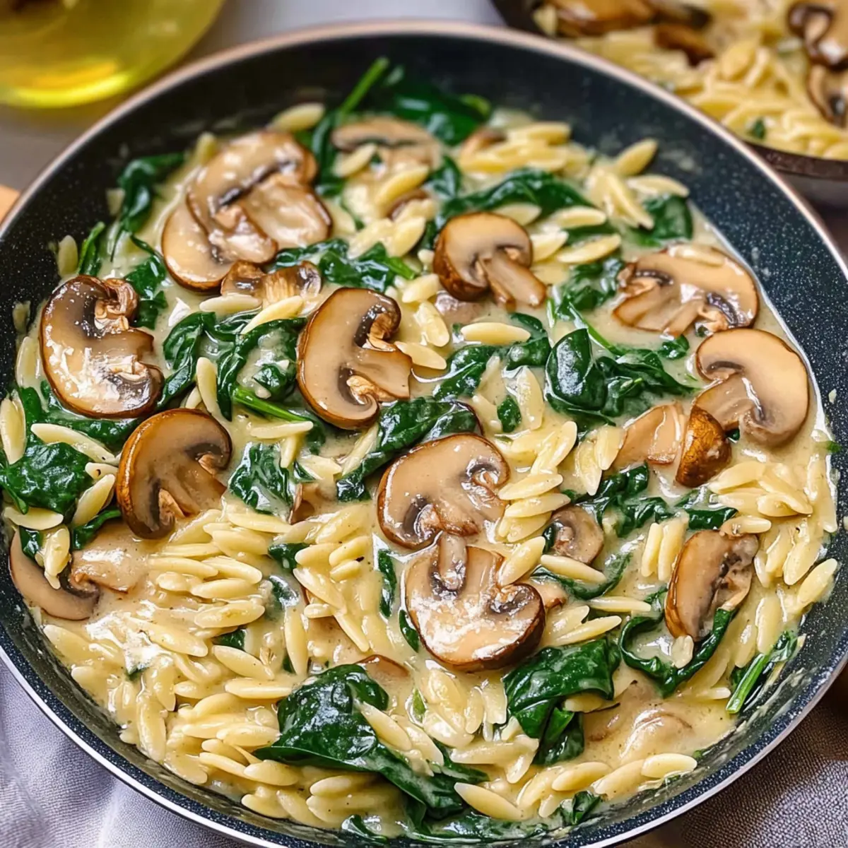 Cremige Orzo-Pfanne mit Champignons und Spinat, die in nur 30 Minuten zubereitet werden kann.