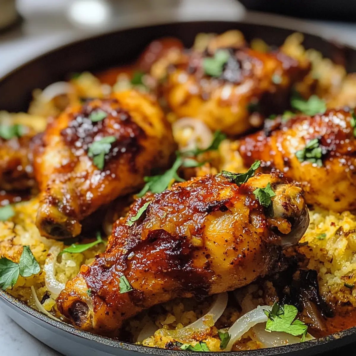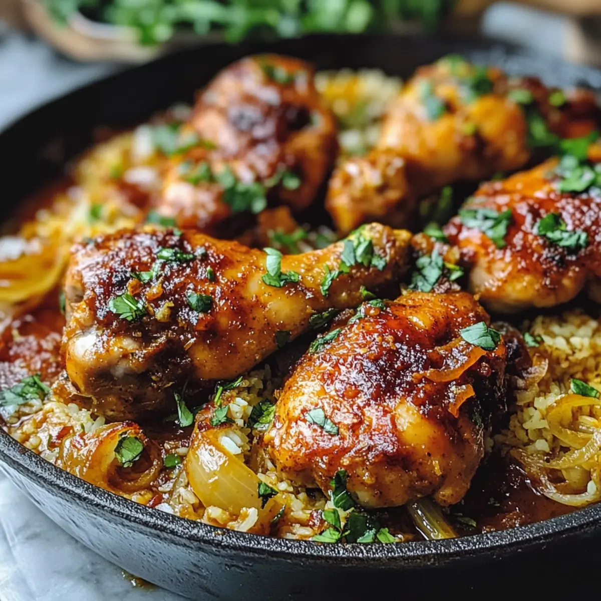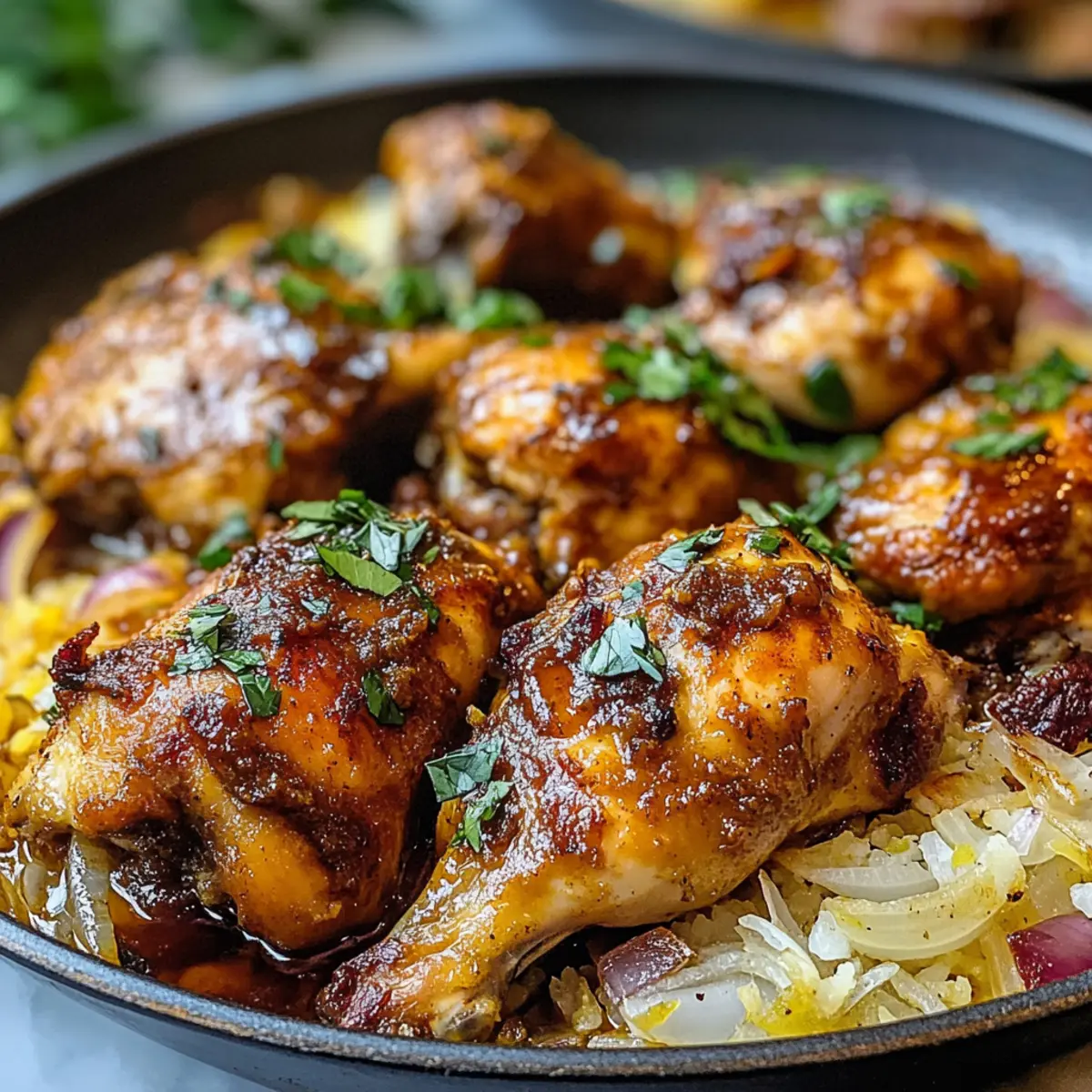 Es war einmal ein Abend, an dem ich nach einem langen Arbeitstag einfach nur etwas Warmes und Tröstliches auf dem Tisch haben wollte. Genau in diesem Moment fiel mein Blick auf ein Rezept für persisches Hähnchen – und ich wusste, dass ich die exotischen Gewürze und die herzlichen Aromen unbedingt ausprobieren musste. Dieses einfache Rezept für persisches Hähnchen ist nicht nur in weniger als einer Stunde zubereitet, sondern auch perfekt für ein gemütliches Abendessen mit der Familie oder Freunden. Mit dem köstlichen Zusammenspiel aus Kurkuma und Safran zaubert es einen Hauch von Orient in deine Küche und verwandelt ein gewöhnliches Abendessen in eine besondere Feier. Lust auf ein wunderbares Geschmackserlebnis? Lass dich von diesem Rezept inspirieren! Warum wirst du dieses Rezept lieben? Einfache Zubereitung: Dieses Rezept für persisches Hähnchen ist im Handumdrehen fertig, ideal für gestresste Abende. Du benötigst keine Kochprofi-Fähigkeiten, um ein beeindruckendes Gericht zu zaubern. Tiefgründiger Geschmack: Die Kombination aus Kurkuma und Safran sorgt für ein Aroma, das dich direkt ins Herz des Orients katapultiert. Jeder Bissen ist eine Geschmacksexplosion, die deine Geschmacksknospen verwöhnt. Vielseitigkeit: Du kannst das Rezept ganz nach deinem Gusto anpassen – füge Zitronensaft für mehr Frische hinzu oder experimentiere mit verschiedenen Hähnchenteilen für individuellen Genuss. Gemütliches Dinner: Perfekt für ein Treffen mit Freunden oder ein Familienessen, bringt dieses Gericht ein Stück Gemütlichkeit auf den Tisch. Serviert mit fluffigem Basmatireis wird es zum Highlight deines Abends. Zögere nicht länger und entdecke, wie einfach und köstlich die persische Küche sein kann! Möchtest du weitere tolle Ideen ausprobieren? Schau dir auch die Variationen für verschiedene Gewürzkombinationen an! Zutaten für persisches Hähnchen • Entdecke die köstlichen Zutaten, die dein Gericht zum Leben erwecken! Für das Hähnchen Hähnchen (2 Pfund, Schenkel und Beine) – Die Hauptproteinquelle, die reich an Geschmack und Saftigkeit ist. Du kannst auch Hähnchenbrust verwenden, achte dann jedoch auf die Kochzeit, um ein Austrocknen zu vermeiden. Zwiebel (1 große, gehackt) – Sie fügt Süße und Tiefe hinzu. Du kannst auch Schalotten oder rote Zwiebeln als Alternative verwenden. Knoblauch (2 Zehen, gehackt) – Verbessert das Aroma und das Geschmacksprofil. Frischer Knoblauch ist am besten, aber du kannst auch Knoblauchpulver verwenden. Für die Sauce Gehackte Tomaten (400 g, aus der Dose) – Sorgt für Feuchtigkeit und Säure, um die Aromen auszubalancieren. Frische Tomaten sind ebenfalls möglich; passe die Kochzeit entsprechend an. Kurkuma (0,5 Teelöffel) – Bringt eine lebendige Farbe und gesundheitliche Vorteile mit sich. In einer Notlage kann auch gelbe Lebensmittelfarbe verwendet werden, jedoch ohne die gesundheitlichen Vorteile. Safran (0,5 Teelöffel, rein) – Verleiht dem Gericht ein unverwechselbares Aroma und Geschmack. Für eine kostengünstigere Option kannst du Kurkuma verwenden, aber beachte, dass der Geschmack anders sein wird. Salz (0,5 Teelöffel) – Verstärkt die Aromen. Du kannst nach Geschmack anpassen oder Meersalz verwenden, um einen anderen Geschmacksprofil zu erzielen. Hühnerbrühe (120 ml) – Fügt Feuchtigkeit und Tiefe hinzu. Für eine vegetarische Variante kannst du Gemüsebrühe verwenden. Für die Zubereitung Butter (1 Teelöffel) – Fettet die Auflaufform für ein besseres Garen und sorgt für Neuigkeit. Öl kann ebenfalls als Ersatz verwendet werden. Mit diesen Zutaten bist du bereit, ein köstliches persisches Hähnchen zu kochen, das deine Familie und Freunde begeistern wird! Schritt-für-Schritt-Anleitung für persisches Hähnchen Step 1: Ofen vorheizen und Auflaufform vorbereiten Heize den Ofen auf 150°C (300°F) vor und fette eine große Auflaufform großzügig mit Butter oder Öl ein. Achte darauf, dass die Form gut eingeölt ist, damit das persische Hähnchen später gleichmäßig gart und nicht anklebt. Bereite dir gleichzeitig alle Zutaten vor, indem du sie griffbereit auf der Arbeitsfläche anordnest. Step 2: Hähnchen marinieren Gib das Hähnchen, die gehackte Zwiebel, den Knoblauch und die gehackten Tomaten in eine große Schüssel. Mische alles gründlich, bis das Hähnchen gleichmäßig mit den anderen Zutaten bedeckt ist. Achte darauf, dass die Zwiebel und der Knoblauch gut verteilt sind, da sie dem Gericht Geschmack verleihen. Dies sorgt für eine aromatische Grundlage für das persische Hähnchen. Step 3: Gewürze hinzufügen Streue Kurkuma, Safran und Salz über die Hähnchenmischung in der Schüssel. Rühre alles gut um, bis das Hähnchen gleichmäßig mit den Gewürzen überzogen ist. Die leuchtende Farbe des Kurkumas sollte das Hähnchen intensiv orangefarben einfärben, während der Safran seinen einzigartigen Duft entfaltet. Dies gibt dem Gericht seinen charakteristischen orientalischen Touch. Step 4: Mischung in die Auflaufform übertragen Übertrage die Hähnchenmischung in die vorbereitete Auflaufform und stelle sicher, dass das Hähnchen gleichmäßig verteilt ist. Gieße die Hühnerbrühe gleichmäßig über die Mischung, sodass sie sich an den Rändern sammelt. Diese Brühe sorgt dafür, dass das persische Hähnchen saftig bleibt und die Aromen während des Backens gut durchziehen können. Step 5: Backen Schiebe die Auflaufform in den vorgeheizten Ofen und backe das persische Hähnchen für etwa 45 Minuten. Überprüfe nach 30 Minuten die Brühe und das Hähnchen, um sicherzustellen, dass es nicht austrocknet. Das Hähnchen ist fertig, wenn sein innerer Temperatur 75°C (165°F) erreicht und die Oberfläche leicht gebräunt ist. Step 6: Ruhen lassen Nimm das Hähnchen aus dem Ofen und decke die Auflaufform für 10 Minuten mit Alufolie ab. Dies ermöglicht es dem Fleisch, sich zu entspannen, und die Säfte können sich gleichmäßig im Hähnchen verteilen. Du solltest während dies