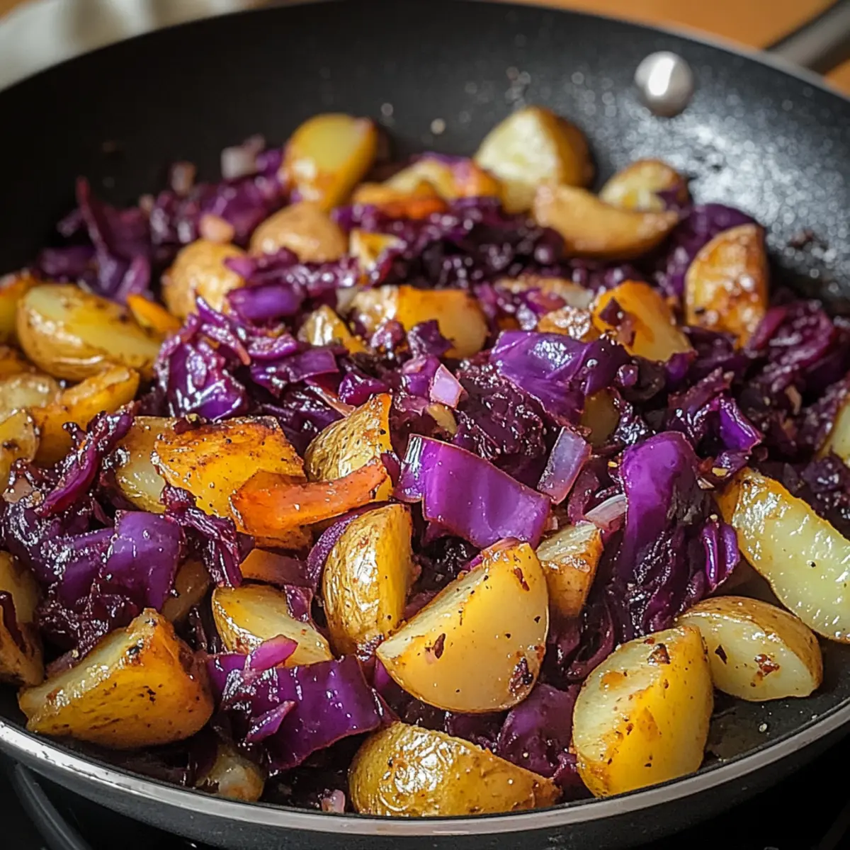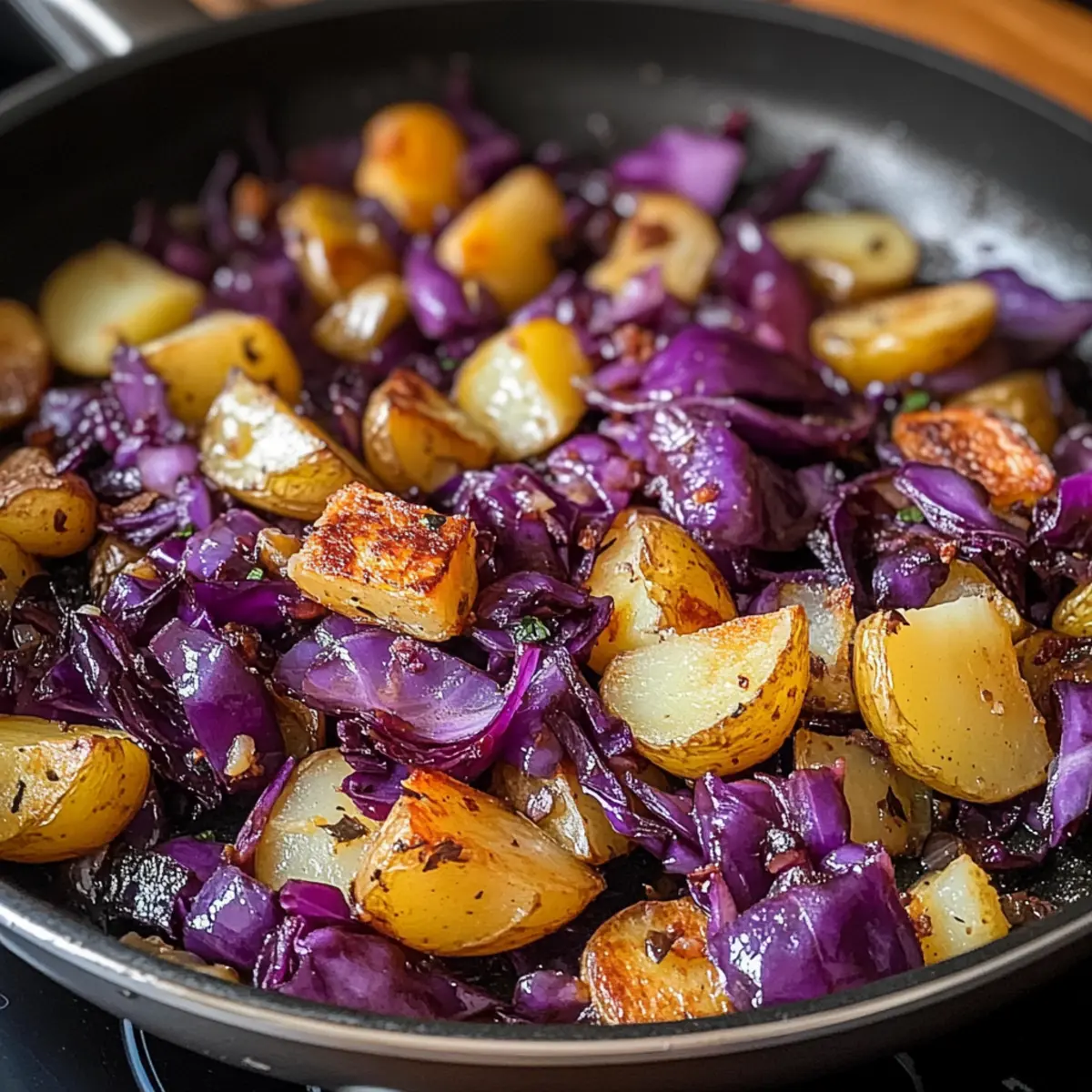 Wenn der Duft von frisch angebratenem Gemüse die Küche erfüllt, fühle ich mich sofort geborgen. Diese Rotkohl Pfanne mit Kartoffeln ist mehr als nur ein Gericht – sie ist eine herzliche Umarmung aus der deutschen Küche, die sowohl an kalten Tagen als auch beim Meal Prep hervorragend schmeckt. Mit der perfekten Balance aus süß-säuerlichem Rotkohl und knusprigen, goldbraunen Kartoffeln bietet dieses Rezept nicht nur eine gesunde, vegetarische Option, sondern ist auch schnell zubereitet und vielseitig abwandelbar. Ob warm als Hauptgericht oder kalt als Beilage, diese nährstoffreiche Pfanne wird zum Favoriten in jeder Küche. Wer kann da widerstehen? Lassen Sie sich inspirieren, und entdecken Sie die vielen Möglichkeiten, dieses Soulfood neu zu interpretieren! Warum werden Sie dieses Rezept lieben? Einfachheit und Schnelligkeit: Die Zubereitung dieser Rotkohl Pfanne mit Kartoffeln ist so unkompliziert, dass selbst Küchenneulinge sie meistern können – in nur 30 Minuten sind Sie fertig! Nährstoffreich und gesund: Mit Rotkohl, der reich an Vitaminen ist, und der knusprigen Textur der Kartoffeln ist dieses Gericht eine wahre Nährstoffbombe, die Ihr Wohlbefinden steigert. Vielseitige Variationen: Ob mit Paprika für mehr Würze oder einer leichten Blumenkohl-Alternative – dieses Rezept passt sich Ihren Vorlieben an. Perfekt für Meal Prep: Diese Pfanne lässt sich gut aufbewahren und schmeckt auch am nächsten Tag hervorragend, was sie zum idealen Begleiter für Ihre Wochenplanung macht. Familienfreundlich und beliebt: Gönnen Sie sich und Ihren Liebsten eine herzhafte Mahlzeit, die selbst die kleinsten Feinschmecker überzeugt! Rotkohl Pfanne mit Kartoffeln Zutaten • Entdecken Sie die köstlichen Zutaten für Ihre perfekte Rotkohl Pfanne! Für die Pfanne Rotkohl – Hauptzutat, die für Geschmack und Nährstoffe sorgt; als leichte Variante kann Blumenkohl verwendet werden. Kartoffeln – Liefert Struktur und Knusprigkeit; süße Kartoffeln bieten eine interessante Geschmacksalternative. Apfelessig – Verleiht eine süß-säuerliche Note; für einen anderen Geschmack kann auch Balsamico verwendet werden. Kreuzkümmel – Gewürz, das die Pfanne verfeinert; kann durch Paprika oder Chili ersetzt werden. Speck oder geräucherter Tofu – Optionale Zugabe für zusätzlichen Geschmack und Protein. Für die Gewürze Salz – Ein essentielles Gewürz, um die Aromen zu intensivieren; nach Geschmack hinzufügen. Pfeffer – Frisch gemahlener Pfeffer bringt eine aromatische Schärfe; nach Belieben verwenden. Für die Garnitur Frische Kräuter – Petersilie oder Schnittlauch geben eine frische Note; ideal zum Bestreuen vor dem Servieren. Sauerrahm oder Joghurt – Eine cremige Ergänzung, die gut zu den Aromen der Rotkohl Pfanne passt. Diese Zutaten kombinieren sich perfekt in der herzhaften Rotkohl Pfanne mit Kartoffeln und sorgen für ein Geschmackserlebnis, das Sie garantiert begeistern wird! Schritt-für-Schritt-Anleitung für Rotkohl Pfanne mit Kartoffeln Step 1: Vorbereitung der Zutaten Waschen Sie den Rotkohl und die Kartoffeln gründlich unter fließendem Wasser. Schneiden Sie den Rotkohl in feine Streifen und die Kartoffeln in gleichmäßige Würfel oder Scheiben, damit sie gleichmäßig garen. Stellen Sie eine große Pfanne auf mittlere Hitze und bereiten Sie etwas Öl vor, um später die Kartoffeln anzubraten. Step 2: Kartoffeln anbraten Erhitzen Sie 2-3 Esslöffel Öl in der Pfanne. Geben Sie die Kartoffeln hinein und braten Sie diese an, bis sie goldbraun und knusprig sind, etwa 10 Minuten. Rühren Sie gelegentlich um, um ein gleichmäßiges Bräunen zu gewährleisten. Achten Sie darauf, dass die Kartoffeln nicht zu vollgestopft sind, damit sie schön bräunen können. Step 3: Rotkohl hinzufügen Sobald die Kartoffeln schön gebräunt sind, geben Sie den geschnittenen Rotkohl in die Pfanne. Rühren Sie alles gut durch und fügen Sie einen Schuss Apfelessig hinzu, um die süß-säuerliche Note zu verstärken. Würzen Sie die Mischung mit Kreuzkümmel, Salz und Pfeffer nach Geschmack für ein volles Aroma. Step 4: Kochen bis zart Reduzieren Sie die Hitze auf mittlere Stufe und decken Sie die Pfanne ab. Lassen Sie die Mischung für etwa 10-15 Minuten köcheln, bis der Rotkohl zart ist, aber noch etwas Biss hat. Rühren Sie gelegentlich um, damit nichts ansetzt, und genießen Sie den köstlichen Duft, der Ihre Küche erfüllt. Step 5: Servieren und genießen Sobald der Rotkohl gut durchgekocht ist, nehmen Sie die Pfanne vom Herd. Servieren Sie die Rotkohl Pfanne mit Kartoffeln heiß, eventuell garniert mit frischen Kräutern oder einem Klecks Sauerrahm oder Joghurt. Dieses Gericht eignet sich hervorragend als kräftige Hauptspeise oder als Beilage zu anderen Gerichten. Meal Prep für Rotkohl Pfanne mit Kartoffeln Diese Rotkohl Pfanne mit Kartoffeln ist ideal für Ihre Meal Prep-Bedürfnisse! Sie können den Rotkohl und die Kartoffeln bis zu 3 Tage im Voraus schneiden und in luftdichten Behältern im Kühlschrank aufbewahren, um die Frische zu bewahren. Um die Qualität zu erhalten, sollten die Kartoffeln in Wasser eingelegt werden, um eine Bräunung zu vermeiden. Wenn Sie bereit sind, die Pfanne zuzubereiten, braten Sie die Kartoffeln in etwas Öl an, fügen Sie den Rotkohl hinzu und würzen Sie nach Belieben. Nach nur 30 Minuten haben Sie ein köstliches Gericht, das sowohl warm als auch kalt hervorragend schmeckt – perfekt für stressige Wochenabende! What to Serve with Rotkohl Pfanne mit Kartoffeln Diese köstliche Rotkohl Pfanne mit Kartoffeln lässt sich wunderbar mit einer Vielzahl von Beilagen und Getränken kombinieren, um ein rundum befriedigendes Essen zu kreieren. Zarte Bratwürste: Sie passen hervorragend zur herzhaften Pfanne und bringen einen zusätzlichen Umami-Geschmack. Besonders lecker, wenn sie auf dem Grill zubereitet werden. Cremige Polenta: Die samtige Polenta ergänzt die knusprigen Kartoffeln und sorgt für einen interessanten Kontrast in der Textur