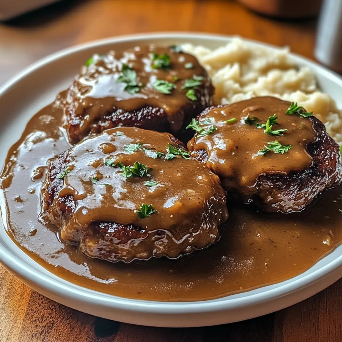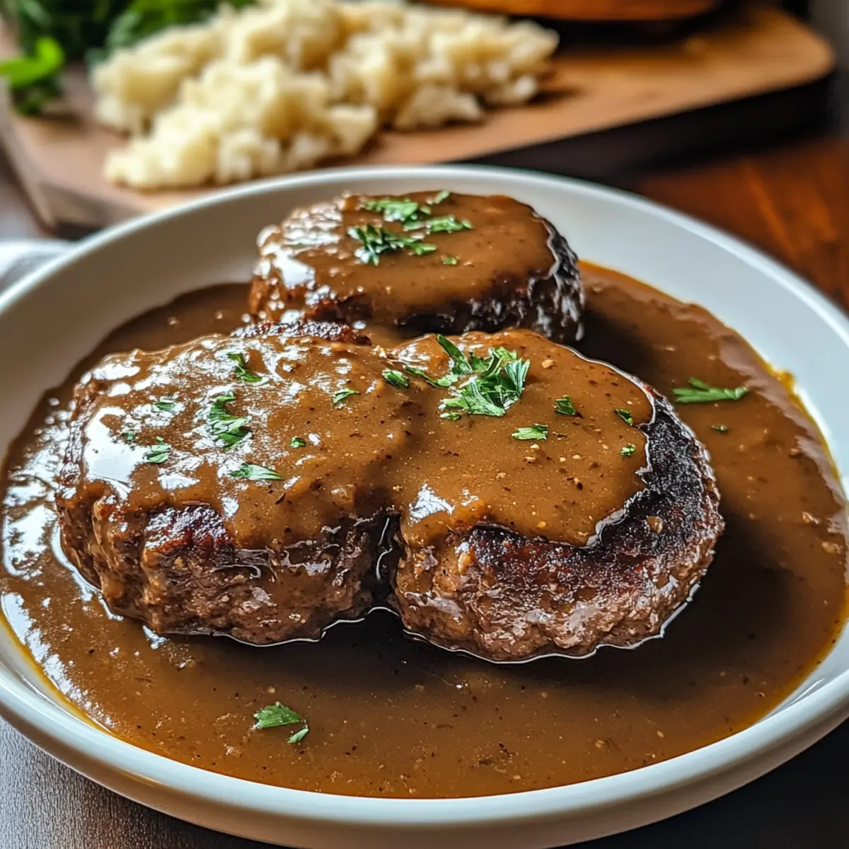 5. Garnieren die fertigen Salisbury Steak und Soße mit frischer Petersilie und grob gemahlenem schwarzem Pfeffer. Serviere das Gericht heiß mit cremigen Kartoffelbrei, Butternudeln oder einer Beilage aus gedünstetem Gemüse für ein herzhaftes und sättigendes Familienessen.