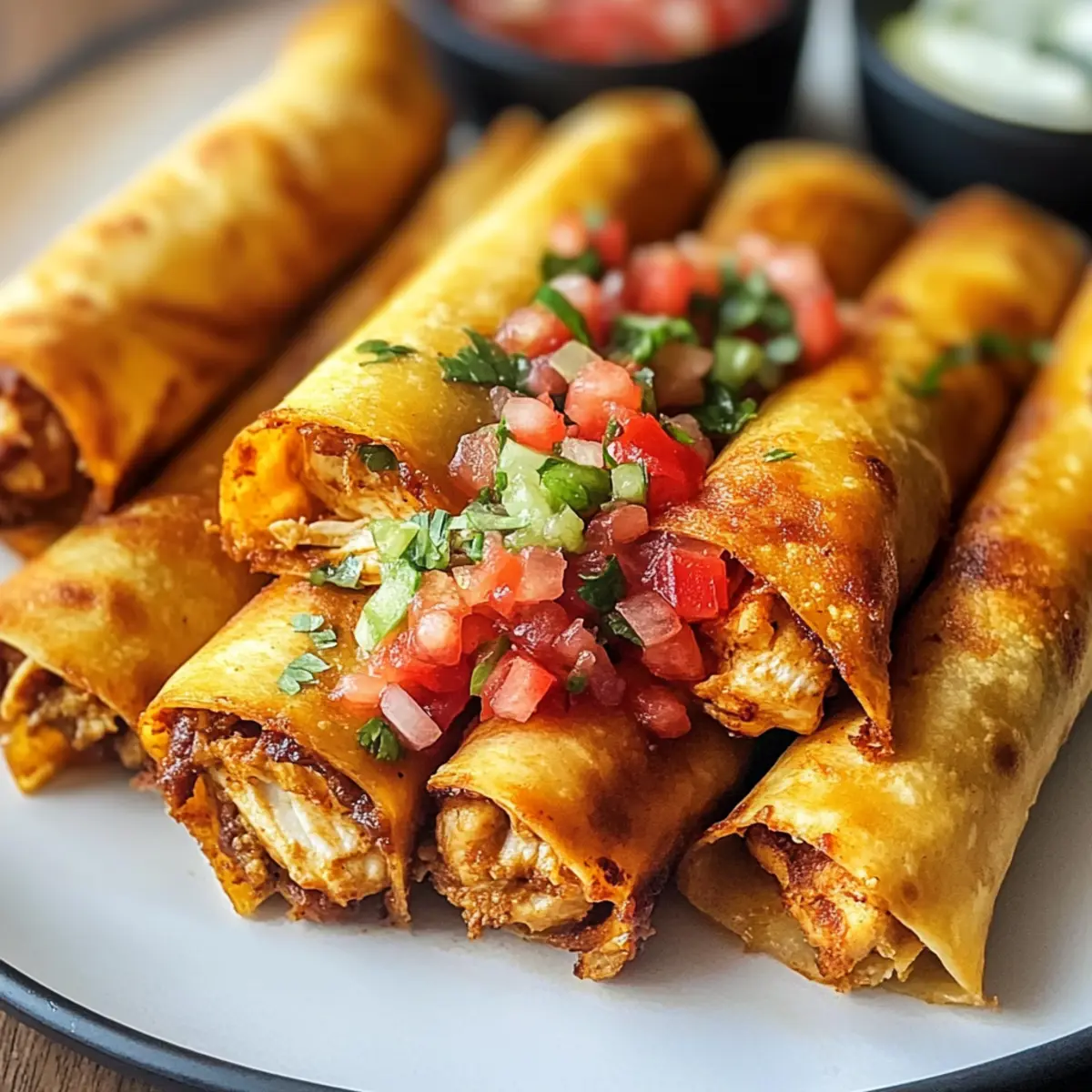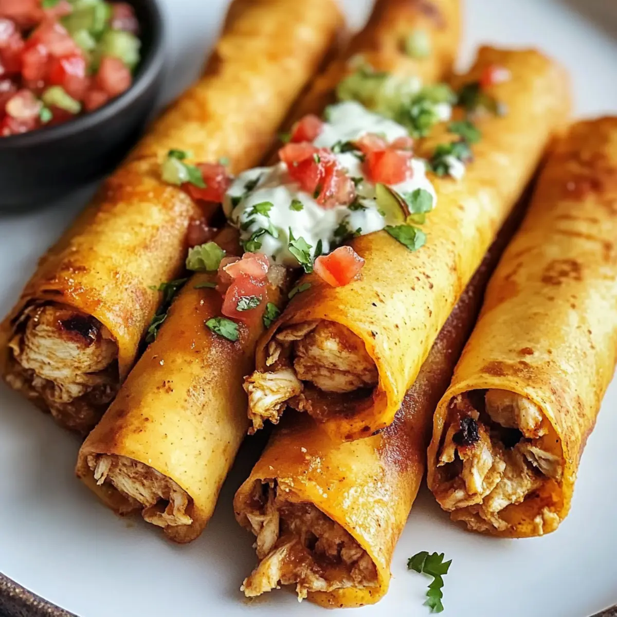 Die Luft ist erfüllt von einem verlockenden Aroma, das die Sinne anregt und den Hunger weckt. Heute lade ich euch ein, die köstlichen Scharfen Hatch-Chili-Hühnchen-Taquito-Rollen auszuprobieren – ein Gericht, das nicht nur euren Gaumen verwöhnt, sondern auch schnell zu einer gesunden, hausgemachten Alternative zu Fertiggerichten wird. Diese knusprigen Taquitos sind gefüllt mit zartem, gewürztem Hühnchen und geschmolzenem Käse, einfach zuzubereiten und perfekt für gemütliche Abende oder als Snack für eure Freunde. Das Beste daran? Ihr könnt die Füllung nach euren Vorlieben anpassen und so jedem Biss eine persönliche Note verleihen. Seid ihr bereit, in die aufregende Welt der Aromen einzutauchen? Schaut weiter, um zu erfahren, wie ihr diese herrlichen Taquitos zaubern könnt! Warum diese Taquitos euch begeistern werden? Einfachheit: Die Zubereitung dieser Scharfen Hatch-Chili-Hühnchen-Taquito-Rollen ist ein Kinderspiel! Selbst Anfänger in der Küche können sie mit Leichtigkeit meistern. Vielseitigkeit: Ihr könnt die Füllung ganz nach eurem Geschmack anpassen! Ob mit Bohnen, Gemüse oder einer anderen Proteinquelle – die Möglichkeiten sind endlos und machen sie zu einem idealen Gericht für jeden Anlass. Gesunde Alternative: Diese Taquitos sind eine schmackhafte und kalorienbewusste Option im Vergleich zu Fast Food. Mit frischen Zutaten und würzigen Aromen wird jedes Biss zu einem Genuss. Schnelle Zubereitung: Perfekt für hektische Wochentage! Mit nur wenigen Minuten Vorbereitungszeit und einer schnellen Backzeit sind sie schnell auf dem Tisch. Crowd-Pleaser: Egal ob bei einer Feier oder beim gemütlichen Abend mit Freunden – diese Taquitos sind ein Hit und bringen jeden zum Schlemmen! Schaut auch mal bei unseren einfachen Rezepten für Snacks vorbei, um weitere köstliche Ideen zu entdecken. Scharfe Hatch-Chili-Hühnchen-Taquito-Rollen Zutaten Für die Füllung • Zerkleinertes Hühnchen – sorgt für Protein und Fülle. Ersetzt es durch fertiges Hähnchen oder Truthahn für eine schnellere Zubereitung. • Frischkäse – gibt Cremigkeit und verbindet die Füllung. Verwende pflanzlichen Frischkäse für eine milchfreie Variante. • Chipotle im Adobo – fügt Rauchigkeit und Schärfe hinzu. Diced Jalapeños können für eine mildere Option verwendet werden. • Adobosoße – verstärkt den Geschmack mit zusätzlichen Gewürzen und Schärfe. • Kreuzkümmel – sorgt für warme, erdige Noten. Kann weggelassen werden, aber das Geschmacksprofil ändert sich. • Chilipulver – gibt Wärme und Tiefe. Die Menge kann je nach Geschmack angepasst werden. • Küchenkräuter & schwarzer Pfeffer – essentielle Gewürze zur Geschmacksanpassung. • Mais-Tortillas – dienen als Basis zum Wickeln. Ersetze sie durch Weizentortillas für eine glutenfreie Option. • Geriebener Cheddar- und Pepper Jack-Käse – sorgt für Schmelz und Geschmack. Verwende milchfreien Käse für eine vegane Option. • Pico de Gallo – als frische Topping. Kann gegen Salsa ausgetauscht werden, wenn es schneller gehen soll. • Krümel-Queso Fresco – sorgt für eine cremige Note. Kann weggelassen werden, wenn du die Milchaufnahme reduzieren möchtest. Die Verwendung dieser Zutaten macht die Scharfen Hatch-Chili-Hühnchen-Taquito-Rollen zu einem wahrhaft schmackhaften Erlebnis, das einfach zuzubereiten ist. Schritt-für-Schritt-Anleitungen für Scharfe Hatch-Chili-Hühnchen-Taquito-Rollen Step 1: Ofen vorheizen Heize deinen Ofen auf 220 °C (425 °F) vor und bereite ein Backblech mit Kochspray vor. Dies sorgt dafür, dass die Scharfen Hatch-Chili-Hühnchen-Taquito-Rollen beim Backen schön knusprig werden und nicht ankleben. Step 2: Füllung zubereiten Vermenge in einer Schüssel das zerkleinerte Hühnchen, den Frischkäse, den Chipotle im Adobo, die Adobosoße, Kreuzkümmel, Chilipulver, sowie Küchenkräuter und schwarzen Pfeffer. Rühre alles gut um, sodass die Aromen der Füllung für die Taquitos perfekt harmonieren. Step 3: Tortillas erwärmen Lege die Mais-Tortillas auf einen Teller und decke sie mit einem feuchten Tuch ab. Erwärme die Tortillas in der Mikrowelle für etwa 30 Sekunden, bis sie weich und geschmeidig sind, damit sie sich leicht rollen lassen und nicht brechen. Step 4: Taquitos zusammensetzen Nimm eine warme Tortilla und verteile etwa ¼ Tasse der Füllung auf einem Ende. Bestreue die Füllung großzügig mit geriebenem Käse, rolle die Tortilla dann eng auf und lege sie mit der Nahtseite nach unten auf das Backblech, um die Scharfen Hatch-Chili-Hühnchen-Taquito-Rollen zu fixieren. Step 5: Taquitos backen Backe die Taquitos für 15-20 Minuten im vorgeheizten Ofen, bis sie goldbraun und knusprig sind. Halte Ausschau nach der schönen, goldenen Farbe und dem verführerischen Duft, der durch die Küche zieht – ein sicheres Zeichen dafür, dass sie perfekt sind! Step 6: Servieren Nimm die Taquitos aus dem Ofen und serviere sie mit frischem Pico de Gallo, zerkrümeltem Queso Fresco und vielleicht etwas Avocado-Cremesoße. Genieße diese köstlichen Scharfen Hatch-Chili-Hühnchen-Taquito-Rollen als Snack oder beim geselligen Beisammensein! Lagertipps für Scharfe Hatch-Chili-Hühnchen-Taquito-Rollen Zimmertemperatur: Bewahre ungenießbare Taquitos nicht bei Zimmertemperatur auf, um das Wachstum von Bakterien zu verhindern. Kühlschrank: Gekochte Scharfe Hatch-Chili-Hühnchen-Taquito-Rollen können bis zu 3-4 Tage in einem luftdichten Behälter im Kühlschrank aufbewahrt werden. Gefrierschrank: Ungebackene Taquitos können für bis zu 3 Monate eingefroren werden. Backe sie direkt aus dem Gefrierfach bei 220 °C (425 °F), ohne sie vorher auftauen zu müssen. Wiedererwärmung: Um die Knusprigkeit zu erhalten, erwärme die Taquitos im Ofen oder in der Luftfritteuse für beste Ergebnisse. Nützliche Tipps für Scharfe Hatch-Chili-Hühnchen-Taquito-Rollen • Tortillas erwärmen: Stellt sicher, dass die Tortillas warm sind, um ein Brechen beim Rollen zu vermeiden. Mikrowel