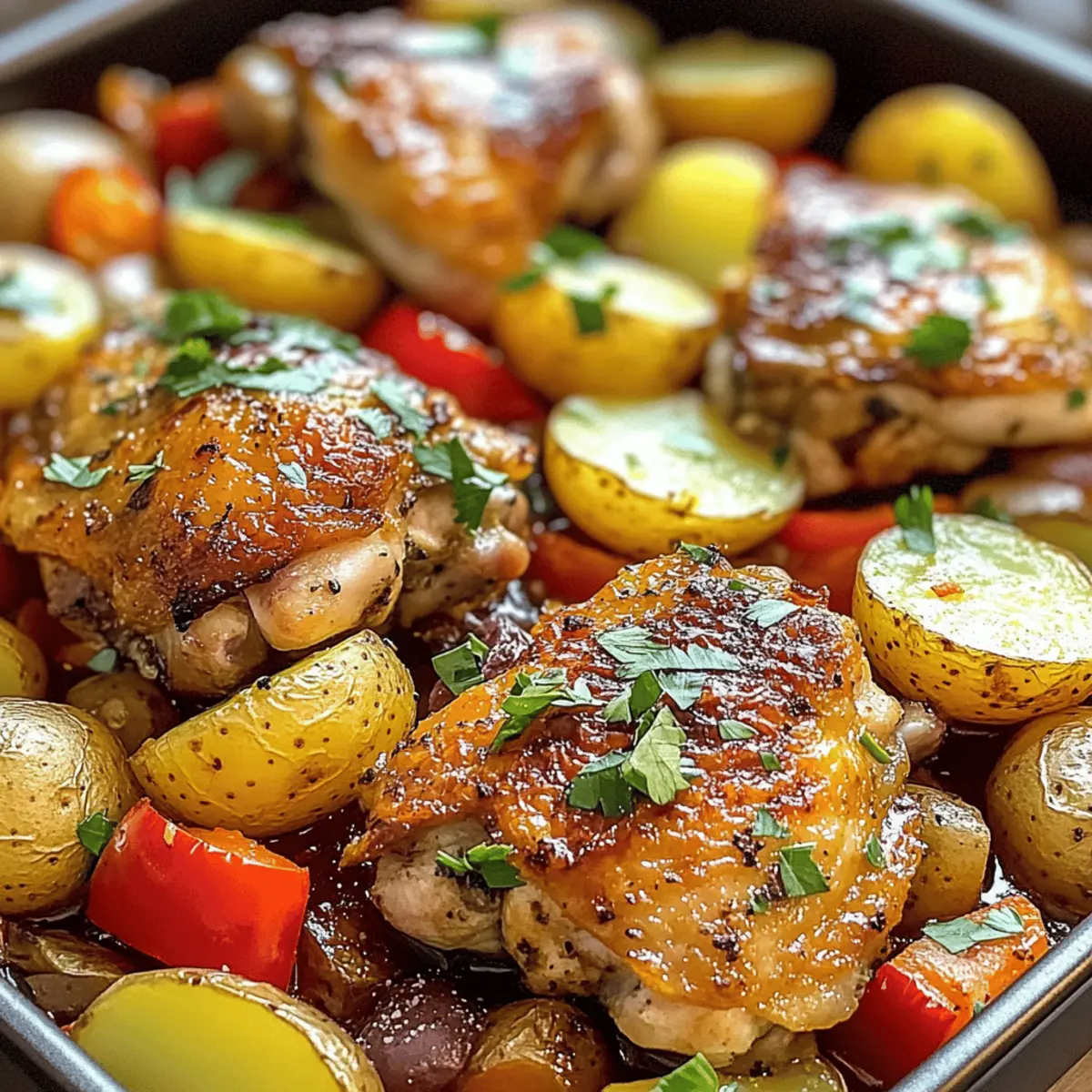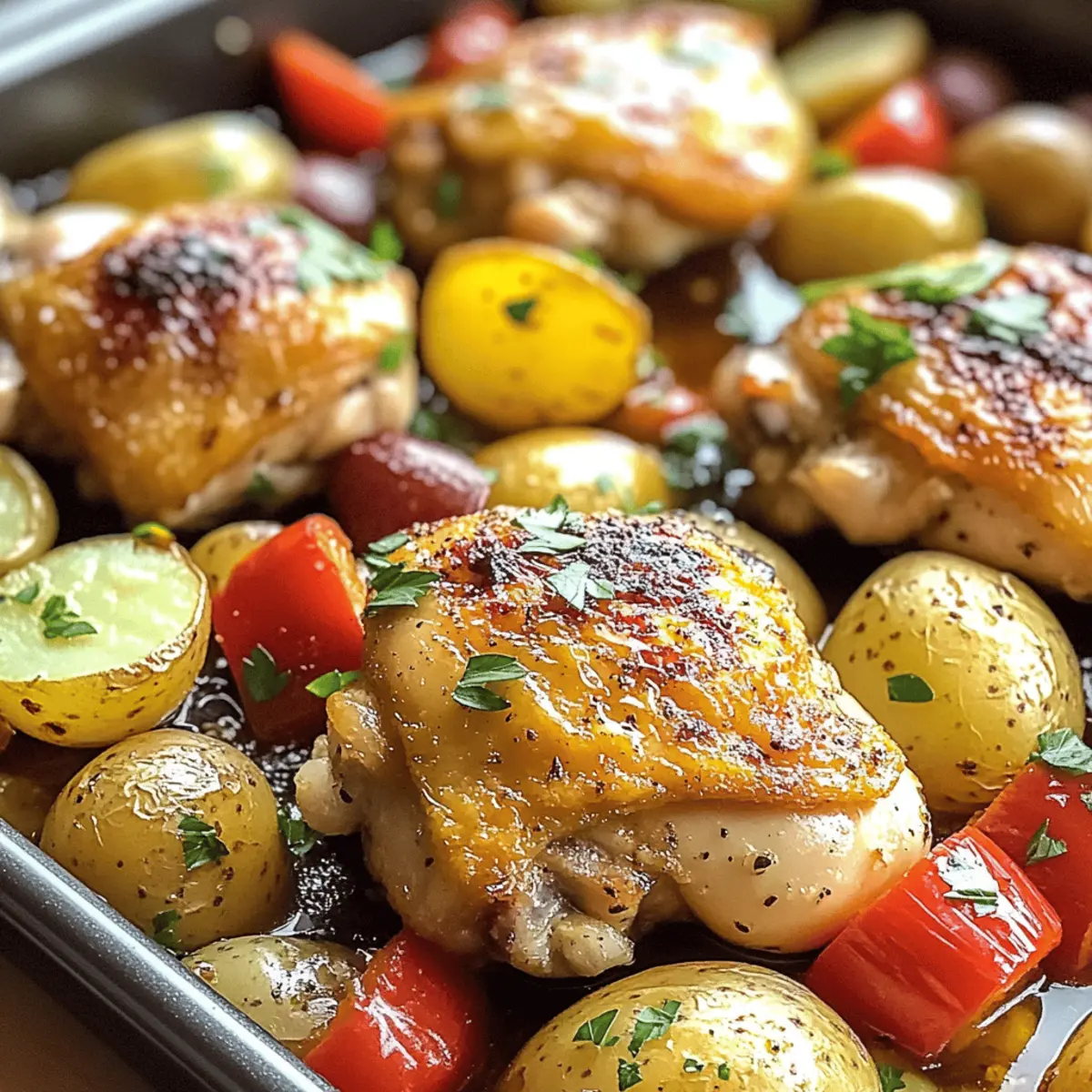 Schiebe das Blech in den vorgeheizten Ofen und backe das Gericht für 35-40 Minuten. Achte darauf, dass das Hähnchen eine Innentemperatur von 74°C (165°F) erreicht und die Kartoffeln zart sind. Die Haut sollte schön goldbraun und knusprig sein.
