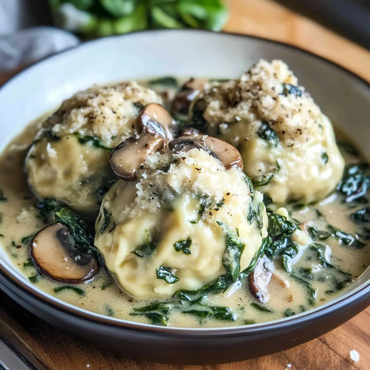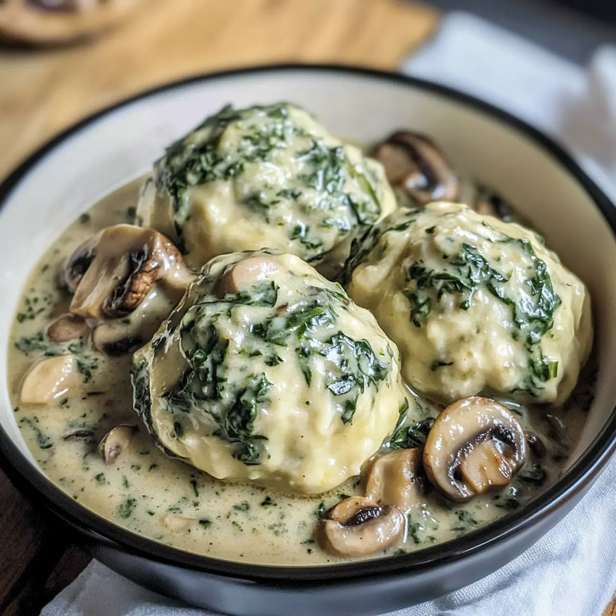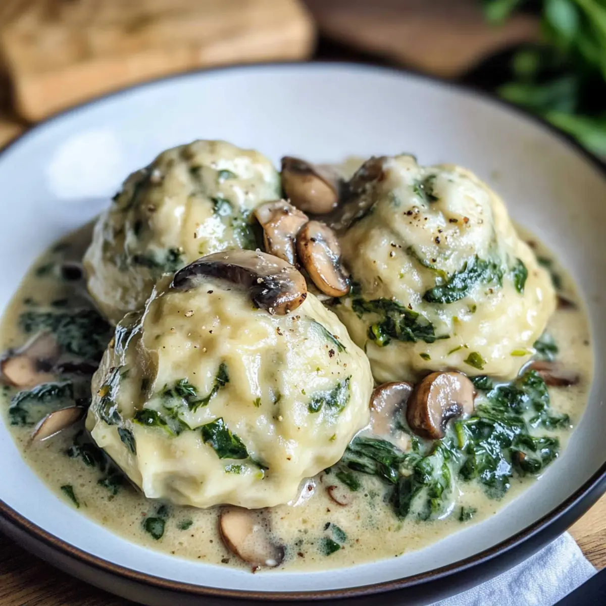 9. Nehme drei Spinatknödel auf jeden Teller und übergieße sie mit der cremigen Champignonsoße.