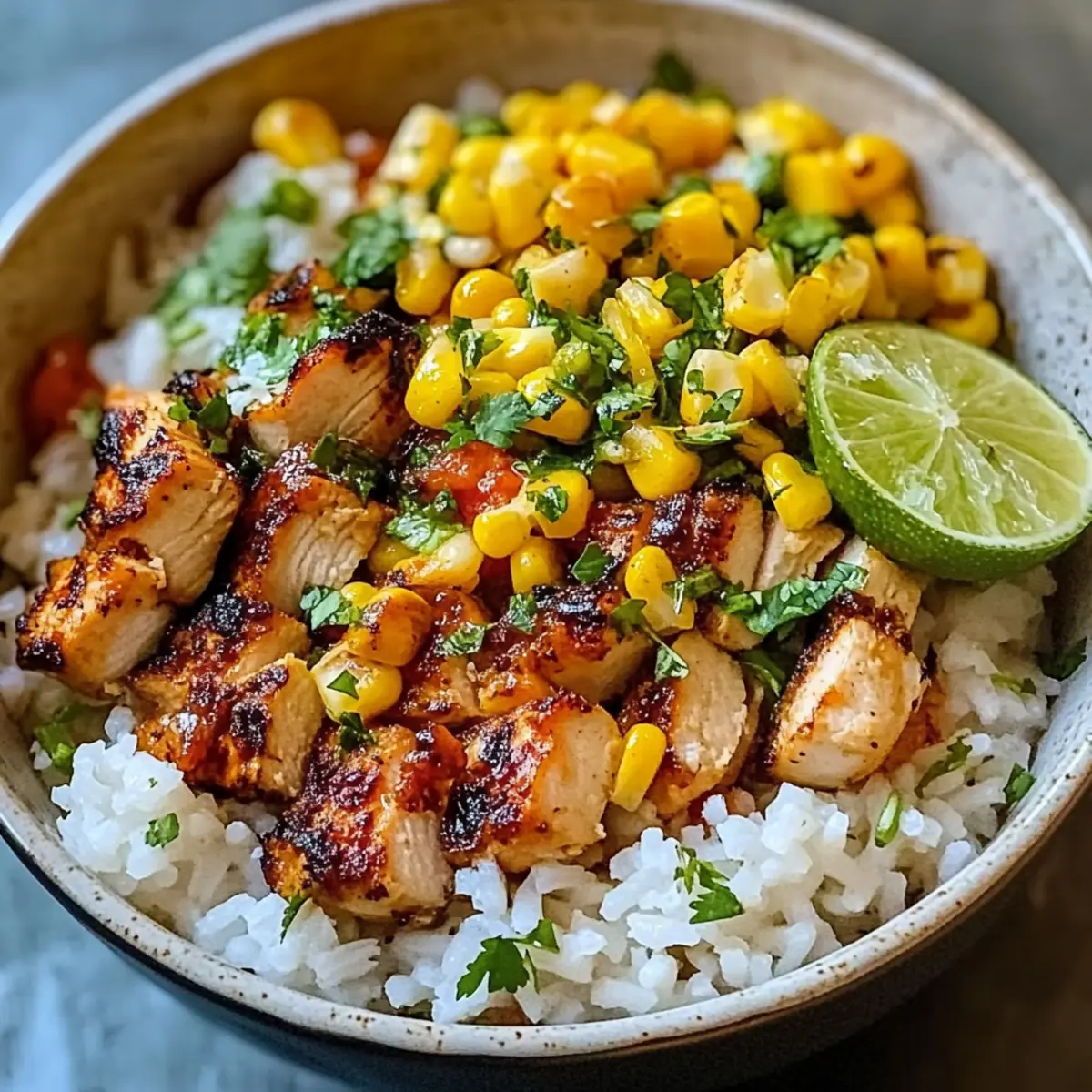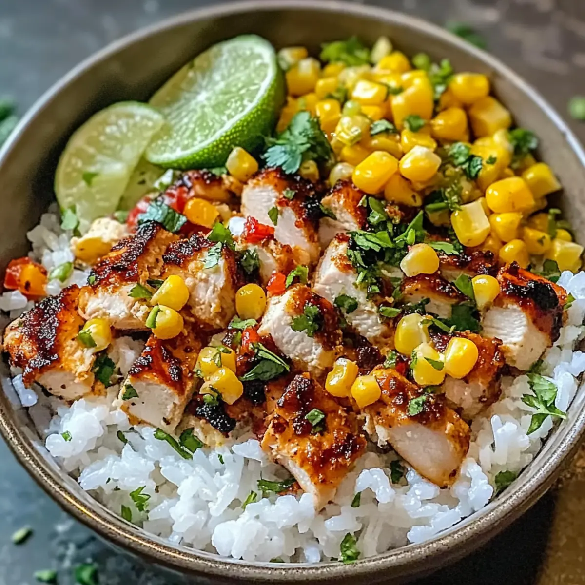 Eine schmackhafte Straßenmaisküken-Reis-Schüssel voller Aromen, perfekt für schnelles Kochen und Meal Prepping.