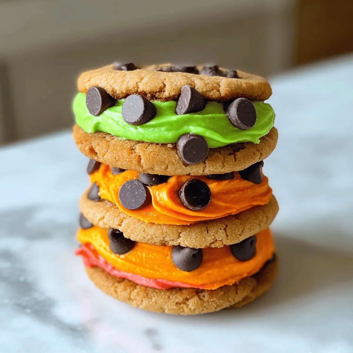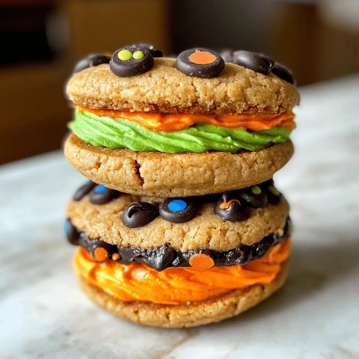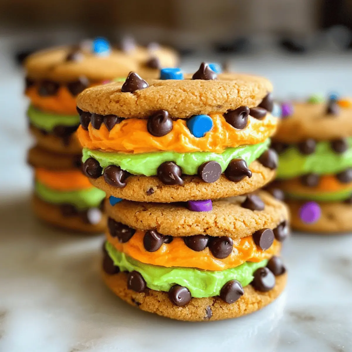 Während ich in der Küche stehe und die leuchtenden Farben des Zuckergusses bewundere, kann ich nicht anders, als mich auf die gruselige Freude der kommenden Halloween-Feier zu freuen. Diese süßen Monster Sandwich-Kekse sind nicht nur eine tolle Möglichkeit, den Geist des Festes zu feiern, sondern sie sind auch wunderbar unkompliziert! Perfekt für alle, die etwas Schnelles und Spaßiges kreieren möchten — ganz ohne den Ofen zu benutzen. Mit der Kombination aus Chips Ahoy-Keksen und fluffigem, buntem Buttercreme-Guss werden diese kleinen Leckerbissen Kinder und Erwachsene gleichermaßen begeistern. Wer kann da schon widerstehen? Lass uns also gemeinsam eintauchen und herausfinden, wie einfach und köstlich diese gruseligen Kekse zubereitet werden können! Warum werden diese Kekse Ihre Freunde begeistern? Einfachheit: Diese Monster Sandwich-Kekse sind im Handumdrehen gemacht! Ohne Backen können Sie in wenigen Minuten leckere Kekse zaubern, ideal für vielbeschäftigte Tage vor Halloween. Farbenfroh und Verspielt: Mit buntem Buttercreme-Guss und lustigen Zuckeraugen freuen sich Kinder und Erwachsene über diese lebendigen Leckereien – perfekt für die festliche Stimmung! Anpassbar: Lassen Sie Ihrer Kreativität freien Lauf! Ersetzen Sie Chips Ahoy durch Ihre Lieblingskekse oder verwenden Sie verschiedene Dekorationen, um Ihre einzigartigen Monster zu kreieren. Gemeinsames Vergnügen: Diese Kekse sind auch ein hervorragendes Familienprojekt. Lassen Sie die Kleinen helfen, ihre eigenen Monster zu dekorieren – ein Spaß für alle! Zutaten für Süße Monster Sandwich-Kekse • Ein einfaches Rezept für ein herrliches Halloween! Für die Kekse Chips Ahoy Cookies – Diese Kekse bilden die Grundlage; sie sind praktisch und einfach zu verwenden, doch Sie können auch selbstgemachte Kekse für Abwechslung wählen. Für den Buttercreme-Guss Ungesalzene Butter (1 Tasse, 2 Sticks) – Sorgt für einen reichhaltigen Geschmack und hilft, eine luftige Konsistenz zu erzielen; Margarine ist ein guter Ersatz. Puderzucker (4 Tassen) – Dieser sorgt für die Süße und Struktur des Frostings; passen Sie die Menge nach Ihrem gewünschten Süßigkeitsgrad an. Milch/Sahne (2-3 Esslöffel) – Für die richtige Feuchtigkeit im Guss und passend zur gewünschten Konsistenz; auch pflanzliche Alternativen sind möglich. Vanilleextrakt (2 Teelöffel) – Verbessert den Geschmack des Frostings; verwenden Sie reinen Vanilleextrakt für ein intensiveres Aroma oder Imitate, wenn nötig. Lebensmittelfarbe – Für die farbenfrohe Gestaltung des Frostings; wählen Sie Halloween-Farben wie Lila, Grün oder Orange, oder nutzen Sie natürliche Farbstoffe. Für die Dekoration Zuckeraugen – Ein lustiges dekoratives Element, erhältlich in Supermärkten und Bastelgeschäften zur Halloween-Zeit; variieren Sie die Größen für mehr Charakter in Ihren Monstern. Tauchen Sie ein in den Spaß und lassen Sie sich von diesen süßen Monster Sandwich-Keksen verführen! Schritt-für-Schritt-Anleitung für Süße Monster Sandwich-Kekse Step 1: Buttercreme-Guss zubereiten In einer mittelgroßen Schüssel die weiche ungesalzene Butter und den Puderzucker mit einem Handmixer kräftig schlagen, bis sie cremig und gut vermischt sind. Dies sollte etwa 2-3 Minuten dauern. Fügen Sie dann die Milch und den Vanilleextrakt hinzu, und mixen Sie weiter, bis die Mischung leicht und fluffig aussieht. Step 2: Guss färben Teilen Sie den zubereiteten Buttercreme-Guss in kleinere Schüsseln auf und fügen Sie jeweils einige Tropfen Lebensmittelfarbe hinzu. Mischen Sie die Farben gründlich, bis Sie die gewünschten lebendigen Farbtöne erreichen. Dies wird den Süßen Monster Sandwich-Keksen ein fröhliches Aussehen verleihen. Step 3: Kekse vorbereiten Nehmen Sie die Chips Ahoy-Kekse und sortieren Sie sie in Paare basierend auf ihrer Größe. Wenden Sie einen Keks der Paare um, sodass die flache Seite nach oben zeigt. Dies bildet die Basis für Ihre monsterhaften Sandwich-Kekse, die gleich zusammengesetzt werden. Step 4: Sandwiches zusammensetzen Geben Sie eine großzügige Portion des bunten Buttercreme-Gusses auf die flache Seite des umgedrehten Kekses. Verwenden Sie entweder einen Löffel oder einen Spritzbeutel, um den Guss aufzutragen. Legen Sie den anderen Keks vorsichtig obenauf und drücken Sie ihn leicht an, sodass die Sandwiche eine stabile Form erhalten. Step 5: Dekorieren Drücken Sie die Zuckeraugen leicht in den noch weichen Guss, um Ihre Süßen Monster Sandwich-Kekse zum Leben zu erwecken. Platzieren Sie die Augen so, dass jedes Cookie einen eigenen Charakter hat, und haben Sie Spaß dabei, unterschiedliche Designs zu kreieren! Step 6: Festwerden lassen und aufbewahren Lassen Sie die Kekse bei Raumtemperatur stehen, damit der Guss etwas fest werden kann. Sobald dies geschehen ist, können Sie die Kekse in einem luftdichten Behälter aufbewahren. Wenn Sie sie im Voraus zubereiten, bewahren Sie sie im Kühlschrank auf, damit sie frisch bleiben und die Dekoration nicht verwischt. Aufbewahrungstipps für Süße Monster Sandwich-Kekse Raumtemperatur: Bewahren Sie die Kekse in einem luftdichten Behälter bei Raumtemperatur auf; so bleiben sie bis zu 2 Tage frisch. Kühlschrank: Wenn Sie die Kekse im Voraus zubereiten, lagern Sie sie im Kühlschrank, um die Dekoration zu schützen. So bleiben sie bis zu 5 Tage haltbar. Airtight-Behälter: Achten Sie darauf, dass der Behälter wirklich dicht verschlossen ist, um Feuchtigkeit fernzuhalten, was den Guss ruinieren könnte. Servieren: Vor dem Servieren können Sie die Kekse kurz bei Raumtemperatur stehen lassen, damit der Guss wieder etwas weicher wird und die Süße Monster Sandwich-Kekse verführerisch ansprechend bleiben. Vorbereitungen für die Süßen Monster Sandwich-Kekse Diese süßen Monster Sandwich-Kekse sind perfekt für die Vorbereitung und bieten Ihnen wertvolle Zeitersparnis an geschäftigen Tagen! Sie können den Buttercreme-Guss bis zu 3 Tage im Voraus zubereiten. Bewa