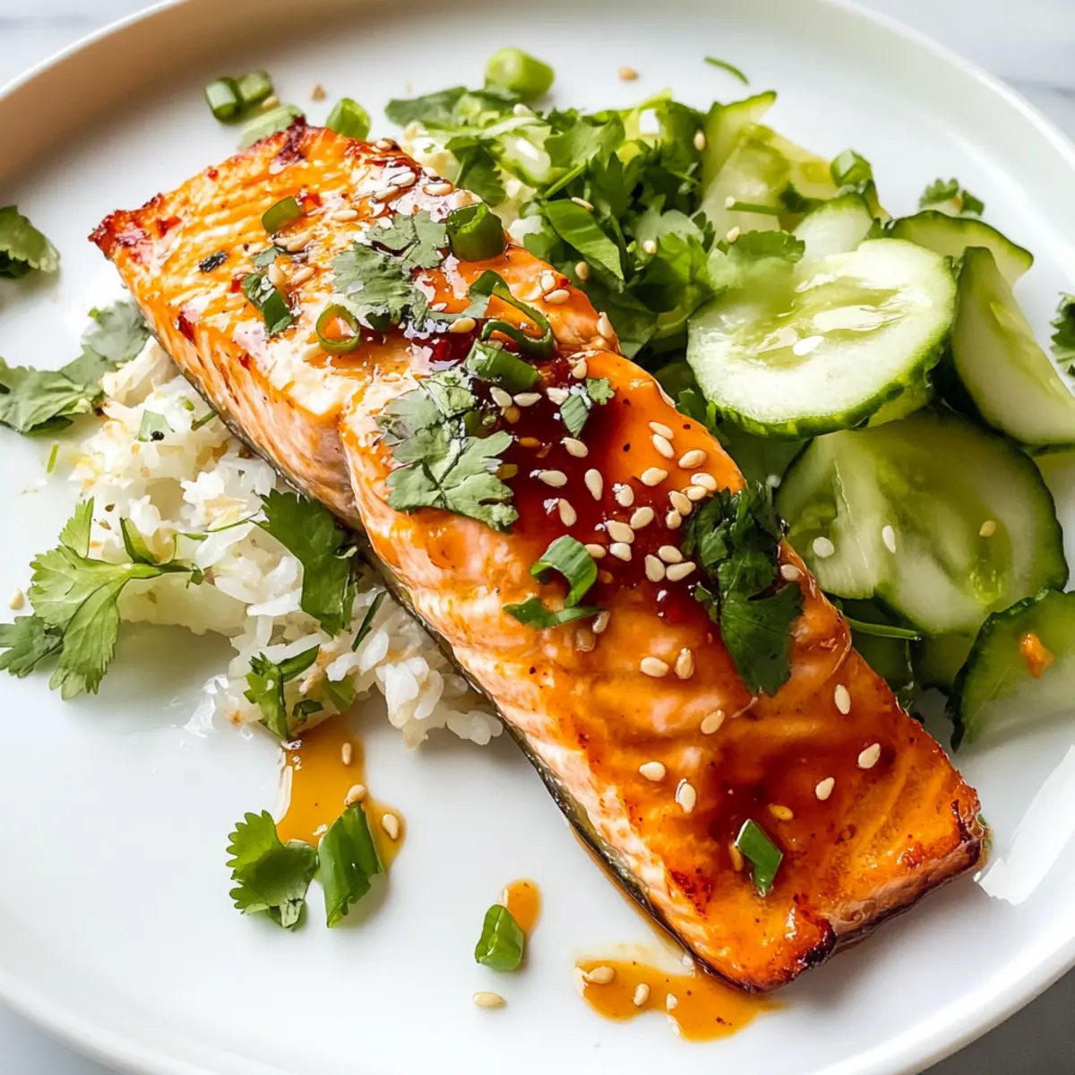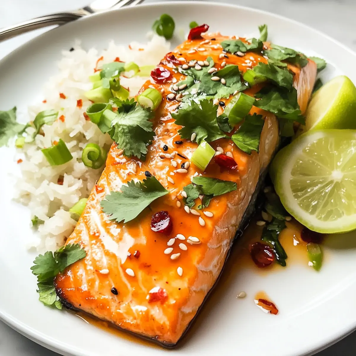 Wusstest du, dass du in nur 20 Minuten ein köstliches Thai-inspiriertes Gericht zubereiten kannst, das sowohl gesund als auch lecker ist? Mein Rezept für Süßes Chili-Lachs wird schnell zu deinem neuen Lieblingsessen, besonders an stressigen Wochentagen. Mit einer perfekt gebackenem Lachsfilet, das mit einer verführerischen süßen Chili-Sauce überzogen ist, bringst du Schwung und Geschmack auf den Tisch – ganz ohne viel Aufwand. Diese zarte Delikatesse ist nicht nur ein echter Genuss, sondern auch eine gesunde Wahl, die die ganzen Familie zusammenbringt. Wer kann bei so einem schnellen, unkomplizierten Rezept schon widerstehen? Ich kann es kaum erwarten, dir die Schritt-für-Schritt-Anleitung zu geben, also lass uns gleich loslegen! Warum wird dir dieses Rezept gefallen? Einfachheit: Die zubereitungszeit von nur 20 Minuten macht dieses Rezept zum idealen Begleiter für hektische Wochentage. Vielseitigkeit: Du kannst den Lachs nach Belieben mit verschiedenen Beilagen kombinieren, sei es Reis, Quinoa oder frisches Gemüse. Gesundheit: Lachs ist nicht nur eine hervorragende Proteinquelle, sondern enthält auch gesunde Omega-3-Fettsäuren, die gut für dein Herz sind. Und Geschmack: Die süße Chili-Sauce verleiht dem Gericht eine köstliche Note, die sowohl süß als auch pikant ist. Für weitere einfache und gesunde Rezepte, die du ausprobieren solltest, besuche auch meine anderen Beiträge über Gesunde Abendessen für die Familie. Süßes Chili-Lachs Zutaten Für den Lachs Lachs – Eine frische und zarte Proteinquelle, die mit Omega-3-Fettsäuren reichhaltig ist. Wähle zwischen Haut an oder ohne, je nach Vorliebe. Salz & Pfeffer – Würze, die den Geschmack verstärkt und das Gericht abrundet. Für die Sauce Thai Süß-Chili-Sauce – Verleiht dem Gericht eine angenehme Süße und eine leichte Schärfe. Diese ist in der asiatischen Abteilung erhältlich oder kann durch hausgemachte Sauce ersetzt werden. Limettensaft – Bringt Frische und Säure in das Gericht. Optional, aber empfohlen für den besten Geschmack. Für die Beilagen (optional) Reis – Eine köstliche Ergänzung, die die Sauce aufsaugt und für eine sättigende Mahlzeit sorgt. Gurken, Frühlingszwiebeln, Koriander, Sesamsamen – Toppings, die für frische, Crunch und visuelle Attraktivität sorgen. Step-by-Step Instructions für Süßes Chili-Lachs Step 1: Ofen vorheizen Heize den Ofen auf 200 °C vor und stelle den Rosten in die Mitte. Lege ein Backblech mit Alufolie oder Backpapier aus, um die Reinigung zu erleichtern. Während der Ofen aufheizt, kannst du bereits die Vorbereitungen für den Lachs treffen. Step 2: Lachs vorbereiten Lege die Lachsfilets mit der Hautseite nach unten auf das Backblech und würze sie großzügig mit Salz und Pfeffer. Achte darauf, dass die Filets gleichmäßig gewürzt sind, um den vollen Geschmack des Süßes Chili-Lachs zu genießen. Step 3: Sauce hinzufügen Verteile etwa einen Esslöffel der Thai Süß-Chili-Sauce gleichmäßig auf jedem Lachsfilet. Stelle sicher, dass jedes Stück gut bedeckt ist, sodass die Sauce während des Backens eine köstliche Glasur bildet. Step 4: Lachs backen Backe den Lachs im vorgeheizten Ofen für 13 bis 15 Minuten. Prüfe, ob der Lachs fertig ist, indem du vorsichtig mit einer Gabel hineinstechst – er sollte leicht auseinanderfallen und eine zarte, rosa Mitte haben. Step 5: Lachs servieren Nehme den gebackenen Süßes Chili-Lachs aus dem Ofen und drücke frisch über die Filets etwas Limettensaft für zusätzliche Frische. Du kannst ihn nach Belieben mit Garnituren wie Jasminreis, Gurken, Frühlingszwiebeln, Koriander und Sesamsamen servieren. Was passt gut zu Süßes Chili-Lachs? Frisch gebackener Süßes Chili-Lachs lässt sich wunderbar mit einer Vielzahl von Beilagen kombinieren, um ein rundum gelungenes Familienessen zu kreieren. Jasminreis: Serviere ihn mit fluffigem Jasminreis, der die köstliche Sauce perfekt aufsaugt und die Aromen harmonisch vereint. Gegrilltes Gemüse: Buntes, gegrilltes Gemüse wie Zucchini und Paprika sorgt für zusätzliche Textur und aromatischen Genuss. Die Röstaromen ergänzen das Gericht ideal. Frischer Gurkensalat: Ein leichter Gurkensalat mit Limettensaft und frischen Kräutern bringt frische und Knackigkeit ins Spiel. Diese Kombination sorgt für einen erfrischenden Kontrast zur süßen Chili-Sauce. Quinoa: Eine proteinreiche Quinoa-Beilage ist eine gesunde und nahrhafte Wahl. Sie rundet das Gericht ab und verstärkt den nussigen Geschmack. Koriander und Sesamsamen: Garniere den Lachs mit frischem Koriander und gerösteten Sesamsamen für zusätzlichen Crunch und aromatische Frische. Kaltgepresster Limettensaft: Ein Spritzer frisch gepresster Limettensaft hebt die Aromen hervor und bringt einen spritzigen Kick, der das gesamte Gericht aufwertet. Lass deiner Kreativität beim Servieren freien Lauf und genieße die wunderbare Fusion der Geschmäcker! Expertentipps für Süßes Chili-Lachs Nicht überkochen: Überprüfe den Lachs nach 12 Minuten, um sicherzustellen, dass er nicht austrocknet. Ein perfekt gegartes Filet sollte leicht zerfallen. Thermometer verwenden: Überprüfe die Kerntemperatur. Idealerweise sollte der Lachs bei 63 °C (145 °F) serviert werden, um die optimale Textur zu erreichen. Fischvariationen ausprobieren: Du kannst auch andere Fische wie Tilapia oder Kabeljau verwenden. Achte darauf, die Backzeit entsprechend der Dicke anzupassen. Hausgemachte Sauce: Für einen frischeren Geschmack kannst du deine eigene süße Chili-Sauce zubereiten, die perfekt zu diesem Süßes Chili-Lachs passt. Frisch servieren: Dieses Rezept schmeckt am besten frisch zubereitet. Reste können in einem luftdichtenBehälter bis zu zwei Tage im Kühlschrank aufbewahrt werden. Meal Prep für süßes Chili-Lachs Die Vorbereitung deines süßen Chili-Lachs kann problemlos im Voraus erfolgen, wodurch du Zeit an stressigen Wochentagen sparst! Du kannst die Lachsfilets bis zu 24 Stunden vorher würzen und mit Salz, Pfe