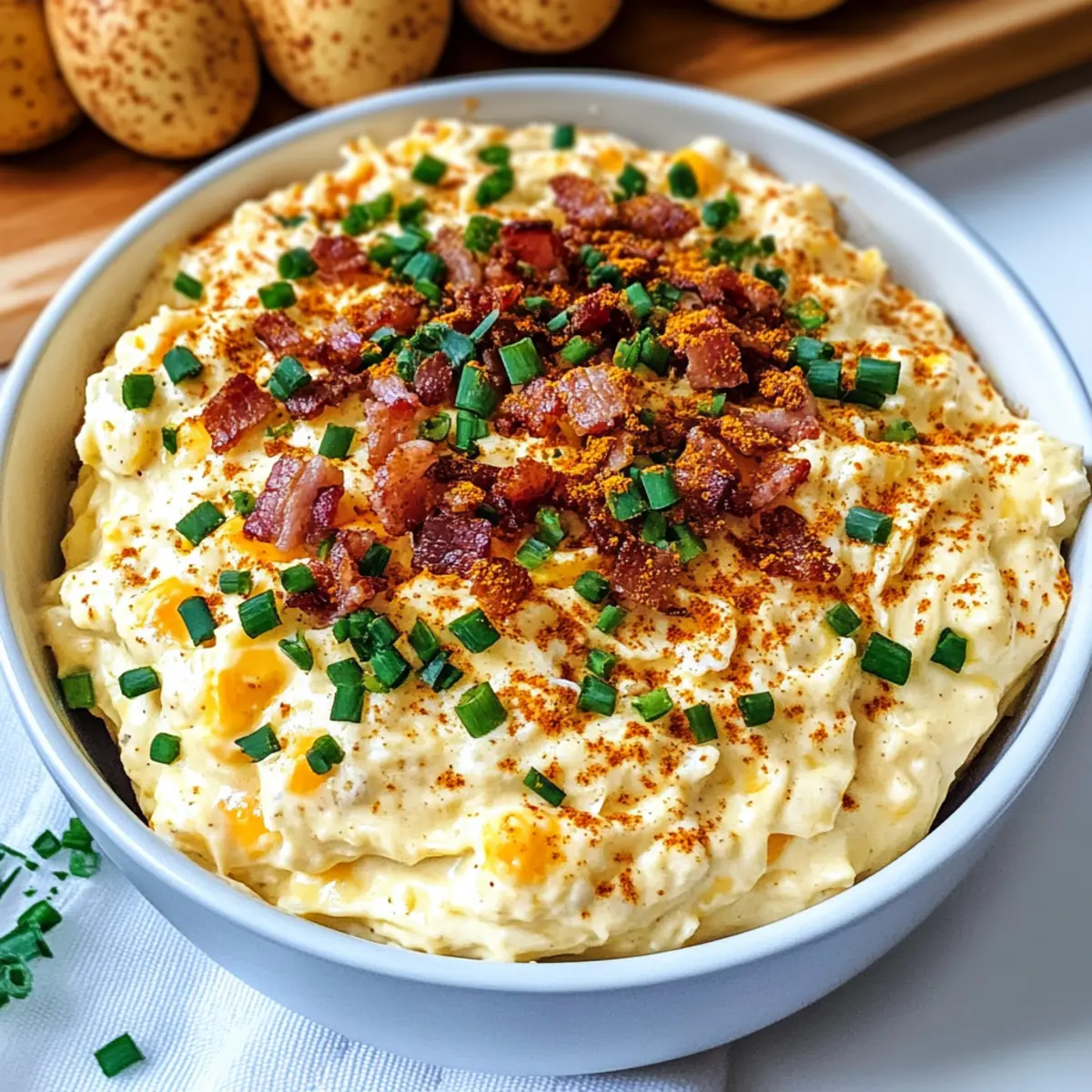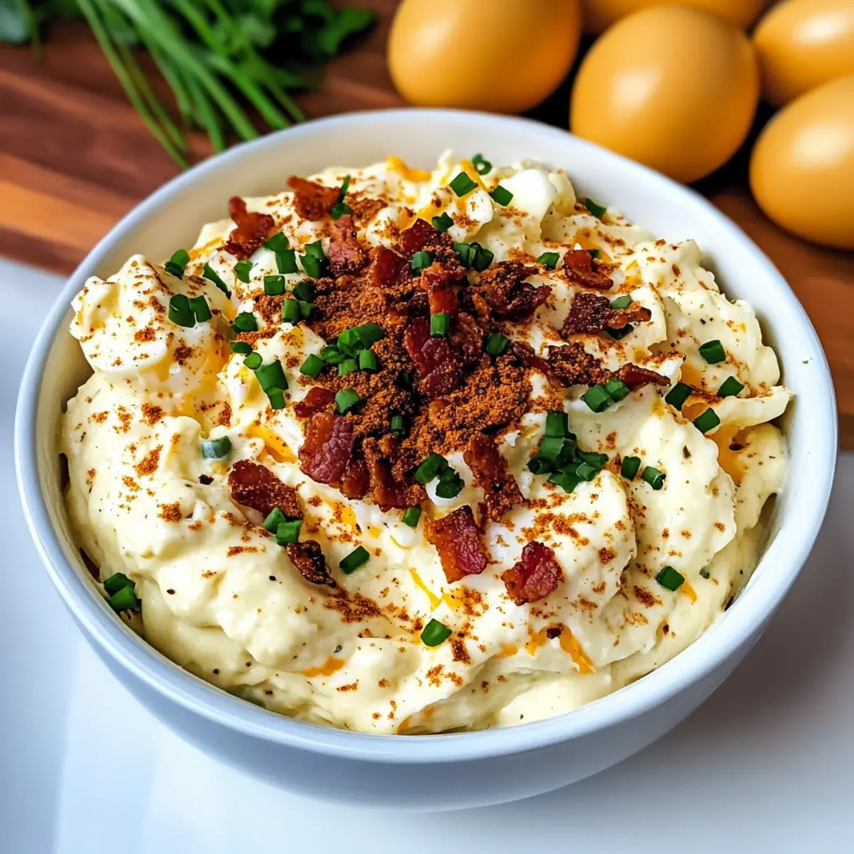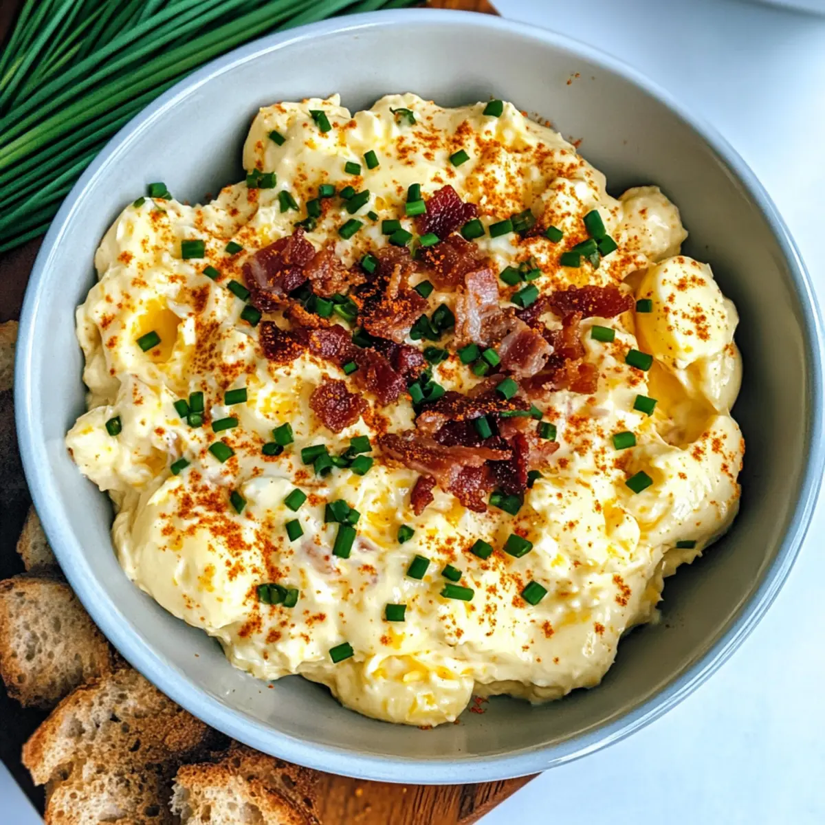„Hast du schon mal von der Idee gehört, die klassischen Aromen von Teufels-Eiern in einer cremigen, dip-fähigen Form zu genießen? Mein Loaded Deviled Egg Dip ist nicht nur ein wahres Geschmackserlebnis, sondern auch eine köstliche Wahl für jede Feier—von entspannenden Game Days bis hin zu festlichen Anlässen. Mit einer Kombination aus herzhaftem Bacon, kräftigem Cheddar und frischen Chives bringt dieser Dip eine wunderbar chunky Textur mit, die beim ersten Bissen einfach begeistert. Zudem lässt er sich leicht anpassen, sodass jeder nach seinem Geschmack schlemmen kann. Und der beste Teil? Er ist auch glutenfrei! Bist du bereit, deine nächste Snackrunde auf ein neues Level zu heben?“ Warum wirst du diesen Dip lieben? Einfachheit: Die Zubereitung ist kinderleicht und benötigt keine besonderen Kochkünste – perfekt für Kochanfänger und Profis gleichermaßen! Vielseitigkeit: Mit anpassbaren Zutaten wie Feta oder verschiedenen Käsesorten kannst du den Geschmack nach Lust und Laune variieren. Aromatische Fülle: Die Kombination aus cremigem Cheddar und knusprigem Bacon sorgt für ein unvergleichliches Geschmackserlebnis. Partyhit: Dieser Dip ist der Hit auf jeder Feier – ob bei einem gemütlichen Abend mit Freunden oder einem geselligen Game Day. Zeitersparnis: Schnell zubereitet und kann bis zu 24 Stunden im Voraus gemacht werden – ideal für stressfreie Feiern! Teufels-Ei-Dip Zutaten • Dieser Teufels-Ei-Dip ist ein wahrer Genuss! Für den Dip Große hartgekochte Eier – Sie bilden die Basis und das unverwechselbare Aroma; frische Eier sorgen für das beste Ergebnis. Mayonnaise – Sorgt für cremige Konsistenz; ein leichter Ersatz ist griechischer Joghurt. Sauerrahm – Lockert den Geschmack und verbessert die Textur. Dijon-Senf – Fügt eine angenehme Würze hinzu. Dill-Relish – Bringt eine süße und kräuterige Note mit. Knoblauchpulver – Verstärkt die Geschmackstiefe. Geräuchertes Paprika – Verleiht eine subtile Rauchnote; mehr zum Garnieren verwenden. Salz & schwarzer Pfeffer – Unverzichtbare Gewürze zur Geschmacksbalance. Zerkleinerter Cheddar-Käse – Bietet cremigen Geschmack und einen scharfen Kontrast. Knuspriger Bacon – Sorgt für Crunch und herzhaftes Aroma; für eine vegetarische Variante kann er weggelassen werden. Gehackte Chives – Frischt das Gericht auf; verwende mehr zum Garnieren. Schritt-für-Schritt-Anleitung für Teufels-Ei-Dip Step 1: Eier vorbereiten Die großen hartgekochten Eier schälen und grob hacken, dann in eine große Schüssel geben. Mit einer Gabel oder einem Kartoffelstampfer die Eier zerdrücken, sodass sie leicht zerfallen, aber die Textur beibehalten bleibt. Dieser Schritt sorgt dafür, dass der Teufels-Ei-Dip die perfekte Basis hat. Step 2: Basis vermengen Füge die Mayonnaise, den Sauerrahm, Dijon-Senf, Dill-Relish, Knoblauchpulver, geräuchertes Paprika, Salz und schwarzen Pfeffer zu den zerdrückten Eiern hinzu. Rühre alles gründlich um, bis die Mischung gut kombiniert und cremig ist. Achte darauf, dass sich die Aromen gleichmäßig verteilen, um einen harmonischen Geschmack im Teufels-Ei-Dip zu erhalten. Step 3: Zutaten unterheben Jetzt ist es Zeit, die gebratenen, zerkleinerten Baconstücke, den geriebenen Cheddar-Käse und die gehackten Chives vorsichtig unter die Mischung zu heben. Verwende einen großen Löffel, um sicherzustellen, dass die Zutaten gleichmäßig verteilt sind, und wende sie sanft, um die Textur zu bewahren. Dies sorgt für den herzhaften und frischen Geschmack des Teufels-Ei-Dips. Step 4: Kühlen Die Mischung nun mit Frischhaltefolie abdecken und mindestens 30 Minuten im Kühlschrank kühlen. Diese Zeit ermöglicht es, dass sich die Aromen gut vermischen und der Teufels-Ei-Dip die richtige Konsistenz erhält. Ideal ist es, wenn du ihn sogar länger im Voraus vorbereitest – so wird der Geschmack noch intensiver. Step 5: Servieren Den gekühlten Teufels-Ei-Dip in eine ansprechende Servierschüssel umfüllen. Mit zusätzlichem geräuchertem Paprika und ein paar frischen Chives garnieren, um ihn festlich zu präsentieren. Serviere den Dip mit einer Auswahl an Dippers wie Crackern, Chips oder frischem Gemüse für ein herzhaftes Snackerlebnis bei deiner nächsten Feier oder beim Game Day. Teufels-Ei-Dip für stressfreies Kochen vorbereiten Der Teufels-Ei-Dip ist ideal für die Vorbereitung im Voraus, besonders wenn du unter Zeitdruck stehst und dennoch einen köstlichen Snack möchtest. Du kannst die Basis des Dips—die zerdrückten Eier, Mayonnaise, Sauerrahm und Gewürze—bis zu 24 Stunden im Voraus zubereiten und im Kühlschrank aufbewahren. Um die Frische zu maximieren, füge den zerkleinerten Bacon und den Cheddar-Käse erst kurz vor dem Servieren hinzu, damit sie ihre knusprige Textur behalten. Achte darauf, den Dip gut abzudecken, um die Aromen zu bewahren; dadurch bleibt er auch bis zu 3 Tage im Kühlschrank frisch. Wenn du bereit bist zu servieren, gib ihn einfach in eine Servierschüssel, garniere mit Paprika und Chives und genieße die Geschmacksexplosion! Expertentipps für den Teufels-Ei-Dip Vorbereitung ist alles: Bereite den Dip mindestens 30 Minuten im Voraus zu, damit sich die Aromen gut entfalten können und der Teufels-Ei-Dip perfekt gekühlt ist. Perfekte Konsistenz: Zerdrücke die Eier nur grob, um eine chunky Textur zu bewahren; so wird der Dip nicht zu cremig und langweilig. Würze anpassen: Probiere den Dip nach dem Mischen mit den Zutaten; passe die Gewürze nach deinem Geschmack an, um den perfekten Teufels-Ei-Dip zu kreieren. Bacon frisch halten: Füge den Bacon erst kurz vor dem Servieren hinzu, damit er knusprig bleibt und die Textur des Dips nicht beeinträchtigt wird. Kreative Variationen: Experimentiere mit verschiedenen Käsesorten oder füge frisches Gemüse wie Paprika hinzu, um deinem Teufels-Ei-Dip noch mehr Geschmack und Vielfalt zu verleihen. Was passt zum Teufels-Ei-Dip? Der Teufels-Ei-Dip ist der perfekte Begleiter für gesellige Runden und le