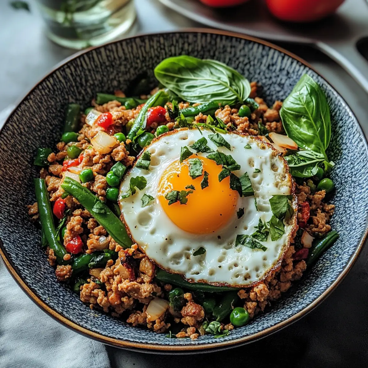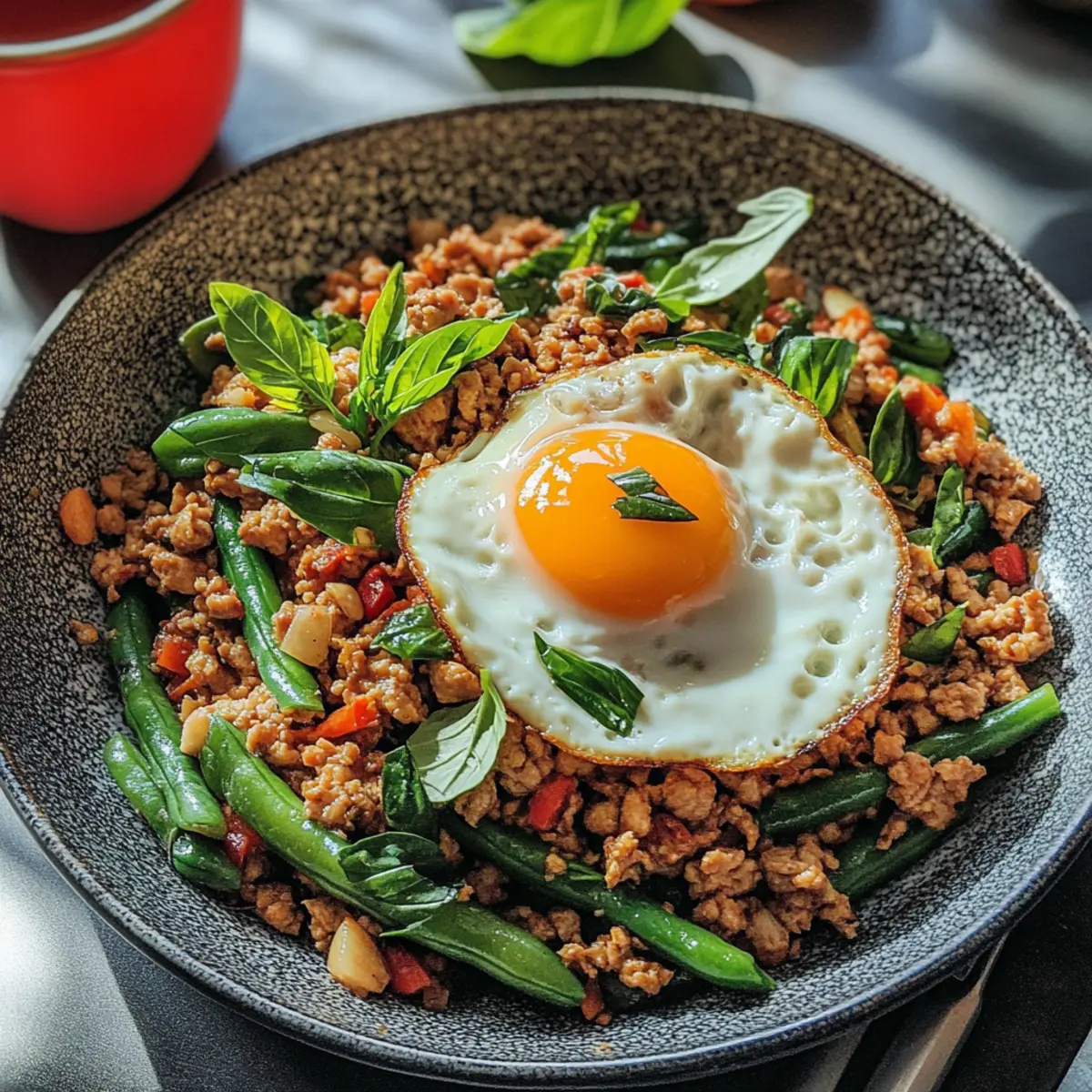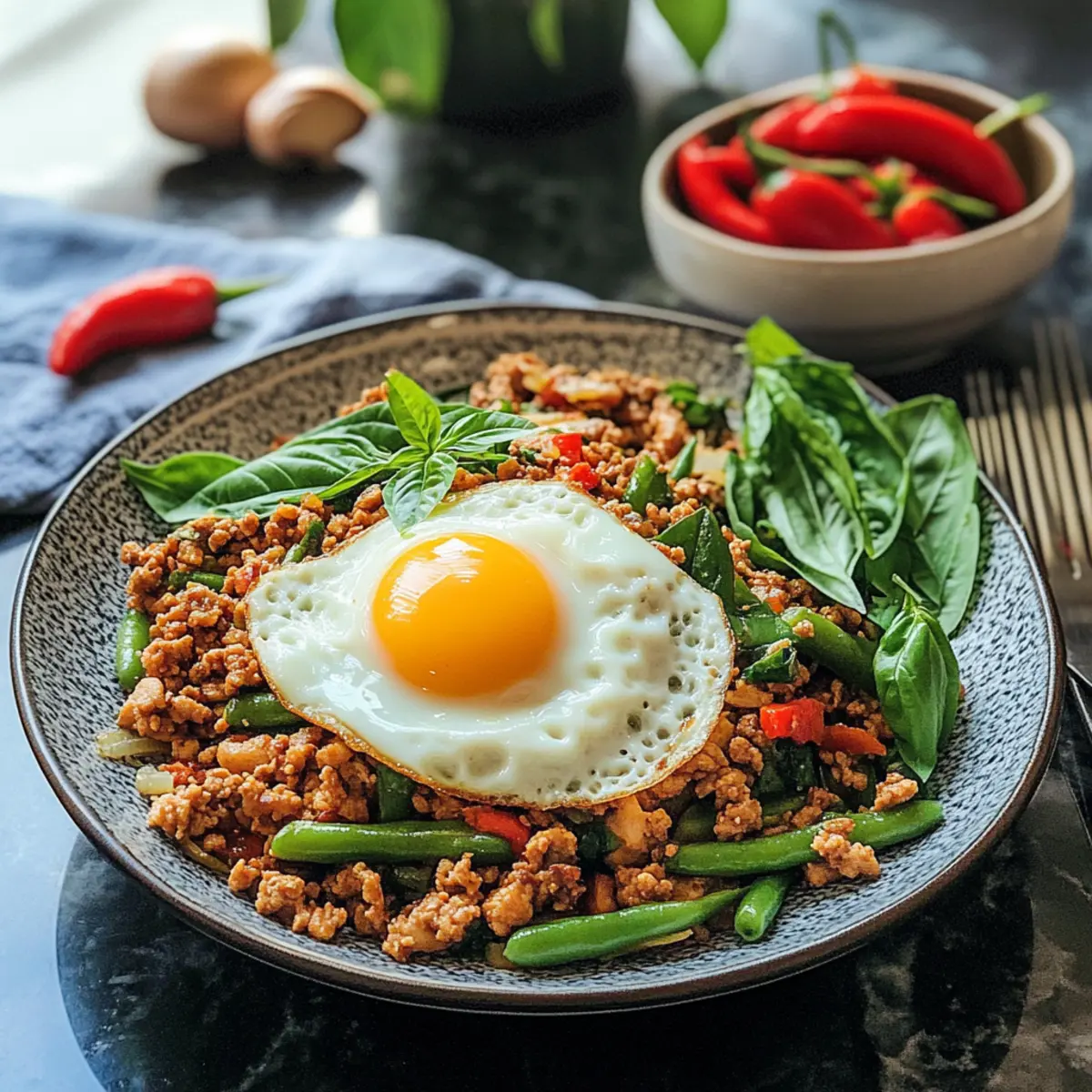 Serviere das Thai-Basilikum-Hähnchen über dampfendem Jasminreis. Garniere es optional mit einem Spiegelei und einem Spritzer Limettensaft, um die Aromen noch mehr zu intensivieren. Bereite dich darauf vor, dieses köstliche Gericht zu genießen, das in weniger als 20 Minuten auf dem Tisch steht!
