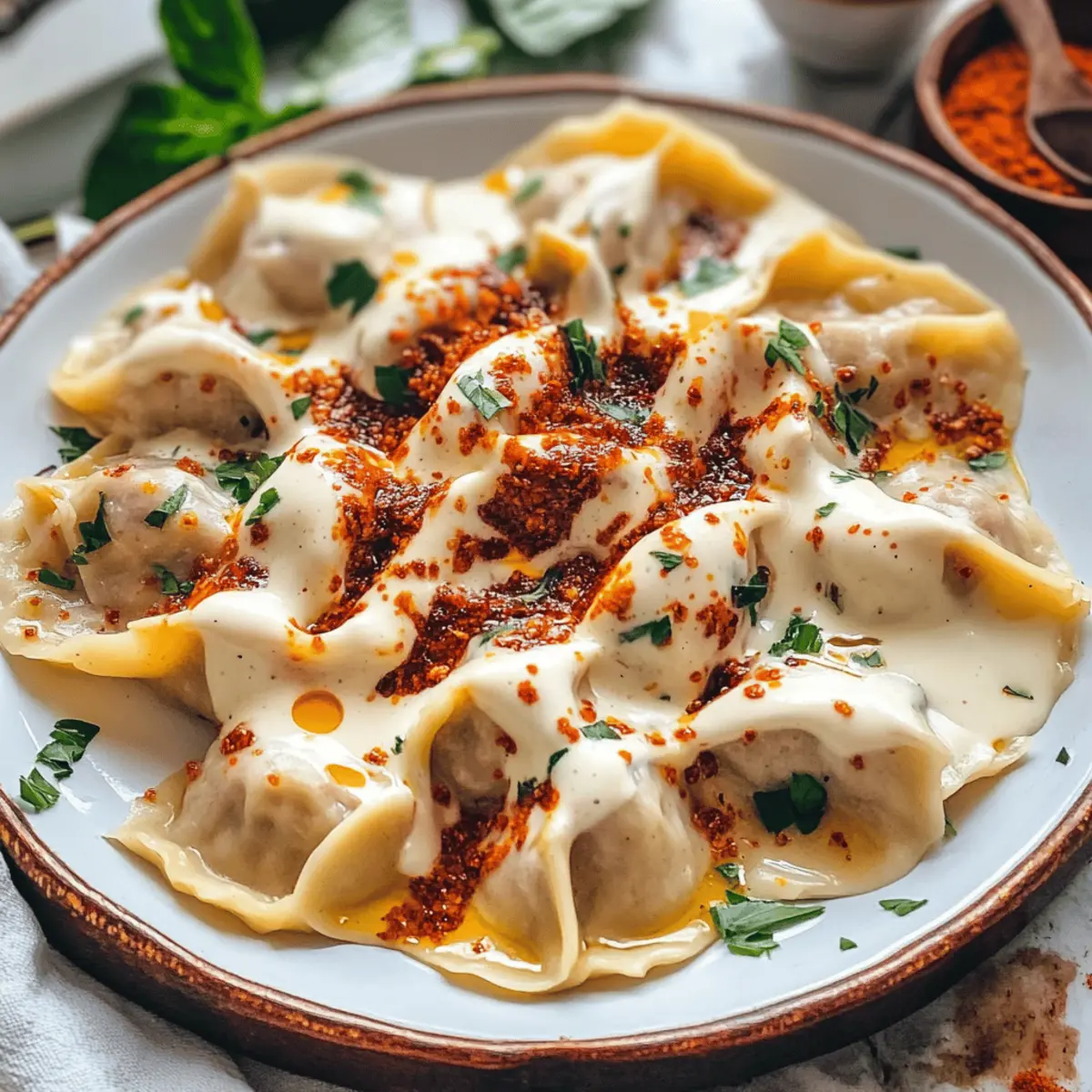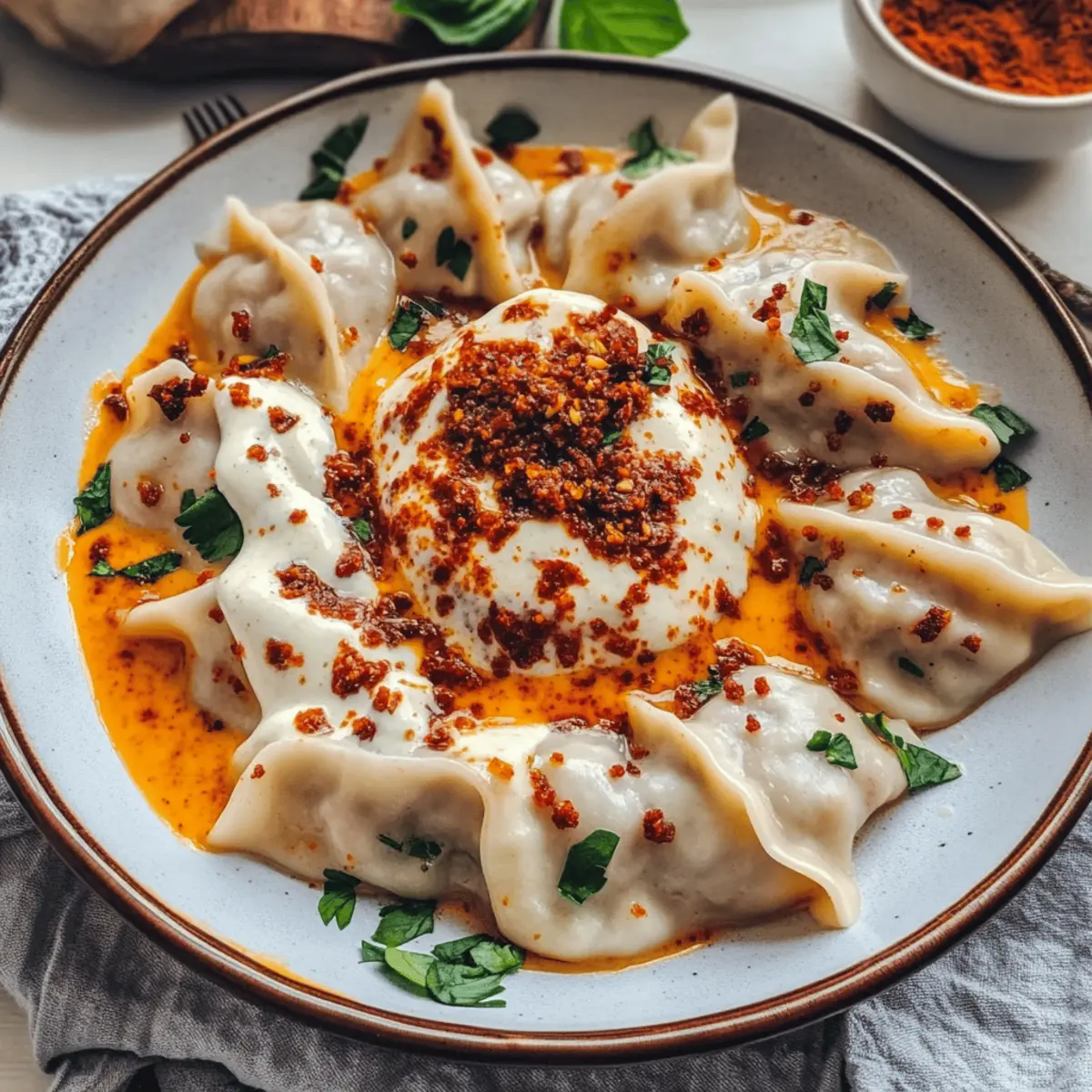 Garnituren: Dekoriere deine Manti mit frischen Kräutern oder Chili-Flocken für zusätzlichen Geschmack und eine ansprechende Optik.