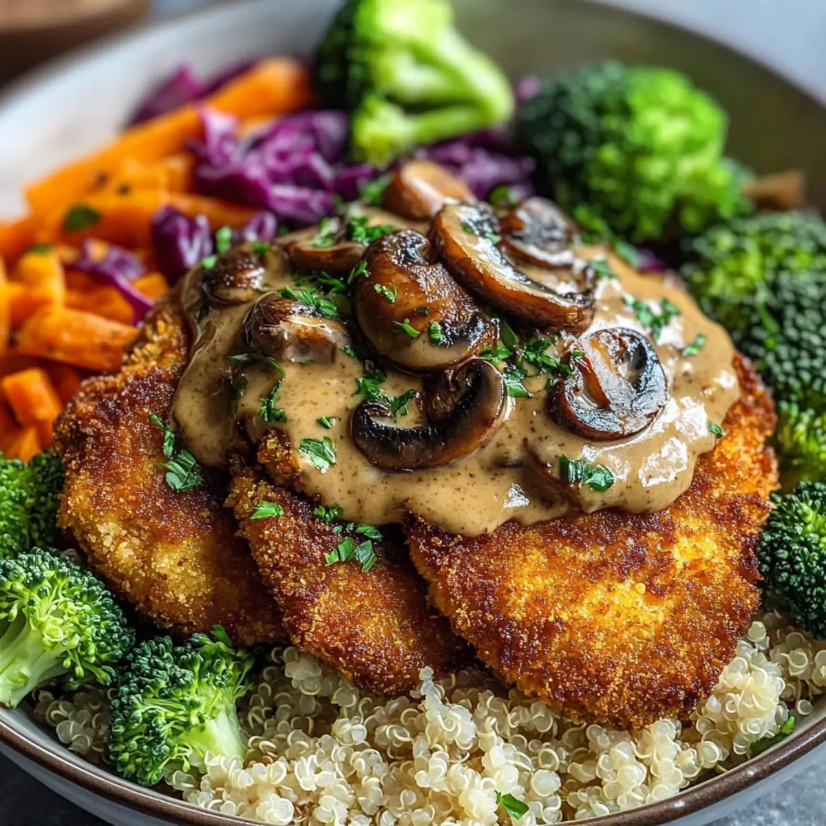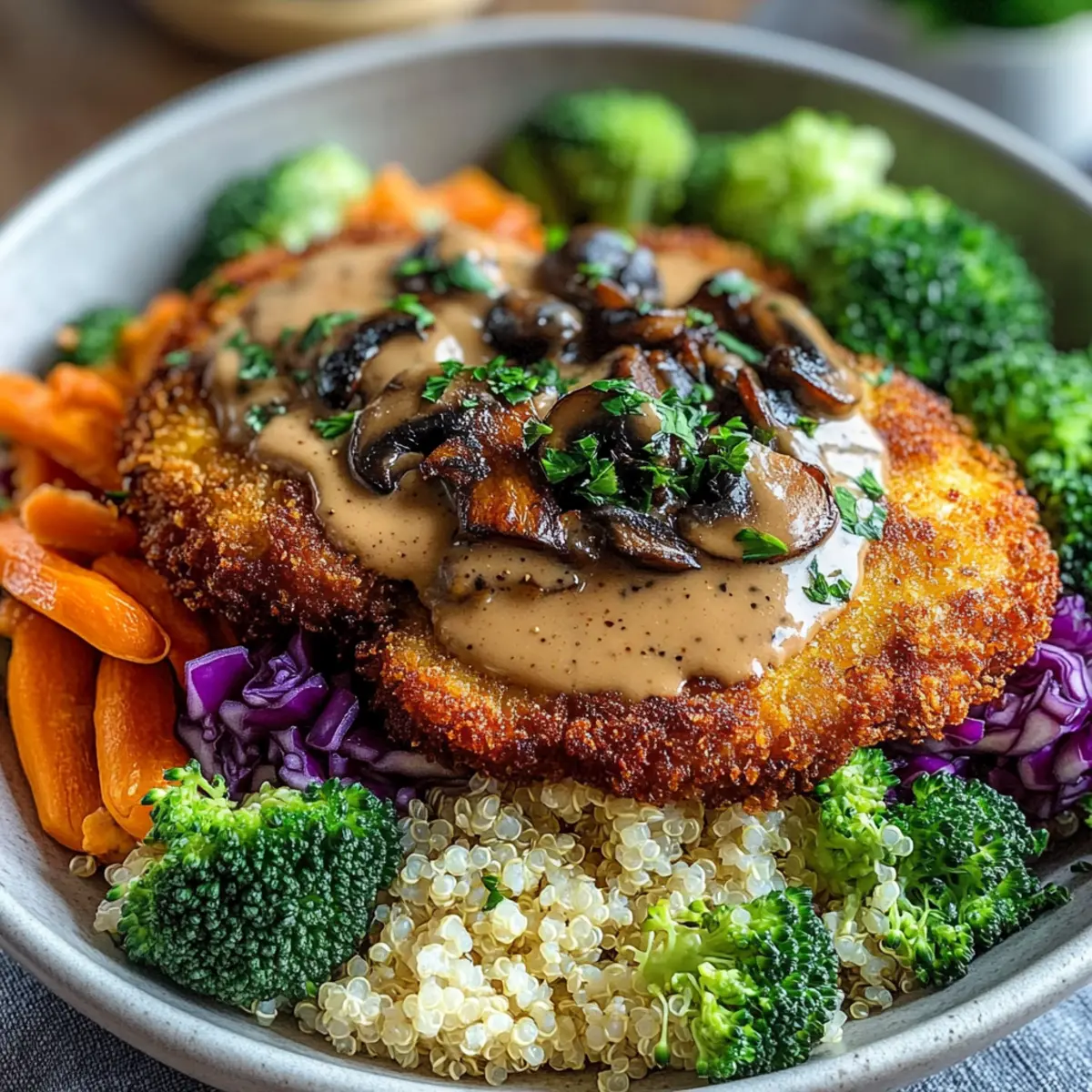 Das Zischen der Schnitzel in der Pfanne erinnert mich an warme Familientreffen, wo jeder Bissen Freude und Zufriedenheit bringt. Diese vegane Schnitzel-Bowl mit Pilzsoße ist nicht nur eine köstliche Reise in die Welt des pflanzlichen Genusses, sondern auch eine wunderbare Möglichkeit, gesunde Lebensmittel auf den Tisch zu bringen. Mit knusprigen pflanzlichen Schnitzeln und einer cremigen, herzhaften Pilzsoße ist dieses Gericht nicht nur ein echter Hingucker, sondern überzeugt auch alle, die auf der Suche nach einer köstlichen und schnellen Mahlzeit sind, die sich perfekt sowohl für den Alltag als auch für besondere Anlässe eignet. Es ist einfach zuzubereiten und bietet überdies eine nahrhafte Alternative zu herkömmlichen Fertiggerichten. Seid ihr bereit, das Geheimnis dieser vollwertigen Genuss-Bowl zu entdecken? Warum wird diese Bowl dein Favorit? Einzigartiger Geschmack: Diese vegane Schnitzel-Bowl kombiniert die herzhaften Noten von knusprigem Schnitzel mit einer cremigen Pilzsoße, die dein Geschmackszentrum verzaubert. Einfach zuzubereiten: Mit grundlegenden Zutaten und unkomplizierten Schritten hast du im Handumdrehen ein schmackhaftes Gericht. Für jeden geeignet: Egal, ob du Veganer bist oder einfach gesunde Alternativen zu Fast Food suchst, diese Bowl wird dich begeistern. Vielfältige Variationen: Probiere verschiedene Schnitzelalternativen wie mariniertes Tofu oder saisonales Gemüse aus, um jede Woche ein neues Erlebnis zu schaffen; so bleibt es spannend! Perfekte Mahlzeit: Die Kombination aus Protein und frischem Gemüse macht die Bowl zu einer nahrhaften Option für jede Tageszeit. Vegane Schnitzel-Bowl Zutaten • Verwandle deine Küche in ein pflanzliches Paradies mit diesen einfachen, aber wichtigen Zutaten! Pflanzliche Schnitzel – Hauptbestandteil, der für Protein und Textur sorgt; alternativ kannst du mariniertes Tofu oder Seitan verwenden. Weizenmehl – Das Basis für die Panade; glutenfreies Mehl eignet sich gut als Ersatz. Pflanzliche Milch – Sorgt für Feuchtigkeit in der Panade; Mandel- oder Hafermilch sind hervorragende Alternativen. Paniermehl (Panko) – Fügt eine knusprige Textur hinzu; benutze glutenfreie Semmelbrösel, wenn erforderlich. Knoblauchpulver – Verleiht dem Gericht einen kräftigen Geschmack; frischer Knoblauch kann ebenfalls genutzt werden. Paprikapulver – Fügt eine rauchige Note hinzu; rauchiges Paprikapulver verstärkt den Geschmack noch weiter. Salz und Pfeffer – Unverzichtbare Gewürze für den perfekten Geschmack; nach Belieben anpassen. Neutrales Öl – Zum Frittieren; achte darauf, dass es hoch erhitzbar ist (z.B. Sonnenblumen- oder Rapsöl). Olivenöl – Zum Anbraten der Champignons; kann durch ein anderes Kochöl ersetzt werden. Zwiebel – Gibt der Soße eine aromatische Grundlage; jede Zwiebelart ist geeignet. Champignons – Hauptbestandteil der Pilzsoße; frisch oder getrocknet können verwendet werden. Gemüsebrühe – Fügt der Soße Tiefe hinzu; sowohl selbstgemachte als auch im Handel gekaufte Brühe sind gut. Sojasauce – Verstärkt den Umami-Geschmack; optional, falls du eine glutenfreie Variante brauchst. Getrockneter Thymian – Fügt Kräuternoten hinzu; ital. Gewürzmischung kann auch als Ersatz dienen. Pflanzliche Sahne oder Kokoscreme – Optional für mehr Cremigkeit; für eine leichtere Soße weglassen. Gekochter Reis, Kartoffelpüree, oder Quinoa – Basis der Bowl für Füllung; jede Getreideart kann verwendet werden. Brokkoli, Rotkohl, Möhre – Frisches Gemüse für mehr Nährstoffe; saisonales Gemüse kann diese ersetzen. Frische Petersilie – Für die Garnitur; optional, aber bringt Frische in das Gericht. Entdecke, wie diese Zutaten zusammenkommen, um die köstliche vegane Schnitzel-Bowl mit Pilzsoße zu kreieren! Schritt-für-Schritt-Anleitung für die Vegane Schnitzel-Bowl mit Pilzsoße Step 1: Vorbereitungen treffen Richte drei Schalen ein: eine mit Weizenmehl, eine mit pflanzlicher Milch und eine mit gewürztem Paniermehl. Dies erleichtert das Panieren der pflanzlichen Schnitzel. Stelle sicher, dass alle Zutaten bereit sind, um den Kochprozess zu beschleunigen. Plane etwa 15 Minuten für die Vorbereitung ein, damit du fließend arbeiten kannst. Step 2: Schnitzel panieren Nimm die pflanzlichen Schnitzel und wälze sie zuerst im Weizenmehl, um eine Grundschicht zu bilden. Tauche sie dann in die pflanzliche Milch ein und achte darauf, dass sie gut bedeckt sind. Zum Schluss presse die Schnitzel in das Paniermehl, bis sie gleichmäßig und knusprig überzogen sind. Dies verleiht der Veganen Schnitzel-Bowl mit Pilzsoße eine schöne Textur. Step 3: Schnitzel frittieren Erhitze in einer großen Pfanne etwa 2-3 Esslöffel neutrales Öl bei mittlerer Hitze. Füge die panierten Schnitzel hinzu und brate sie 3-4 Minuten auf jeder Seite, bis sie goldbraun und knusprig sind. Achte darauf, dass du die Schnitzel nicht überfüllst, damit sie gleichmäßig braten können. Lass die fertigen Schnitzel auf einem Küchenpapier abtropfen. Step 4: Pilzsoße zubereiten In der gleichen Pfanne, in der du die Schnitzel frittiert hast, erhitze 1-2 Esslöffel Olivenöl. Füge fein gehackte Zwiebeln hinzu und brate sie an, bis sie glasig sind. Gib dann die Champignons dazu und koche sie, bis sie gebräunt sind und ihre Flüssigkeit abgegeben haben. Dies dauert etwa 5-7 Minuten. Step 5: Soße verfeinern Streue Knoblauchpulver über die Champignons und rühre gut um. Anschließend gib 1 Esslöffel Mehl dazu und rühre kontinuierlich, um Klumpen zu vermeiden. Gieße nach und nach die Gemüsebrühe hinein und rühre stetig, bis die Soße anfängt einzudicken. Lass sie bei schwacher Hitze weiter köcheln und würze sie mit Sojasauce, Thymian, Salz und Pfeffer nach Geschmack. Step 6: Bowl zusammenstellen Wähle eine große Schüssel als Basis und gib gekochten Reis, Kartoffelpüree oder Quinoa hinein. Arrangiere frisches Gemüse wie Brokkoli, Rotkohl und Möhre darüber. Lege die knusprigen Schnitzel auf das Gem