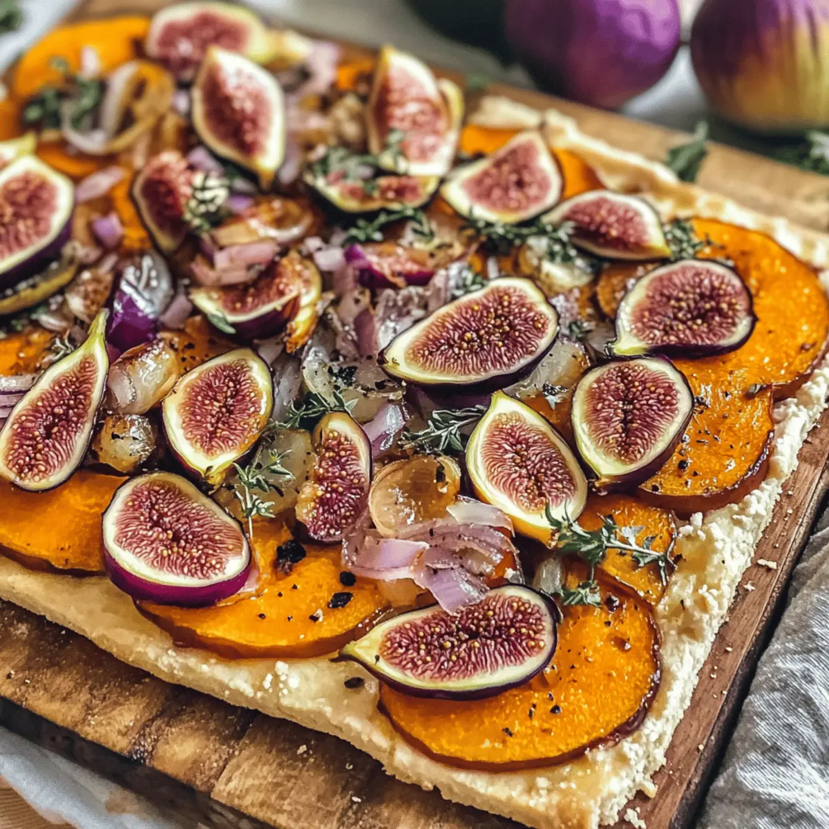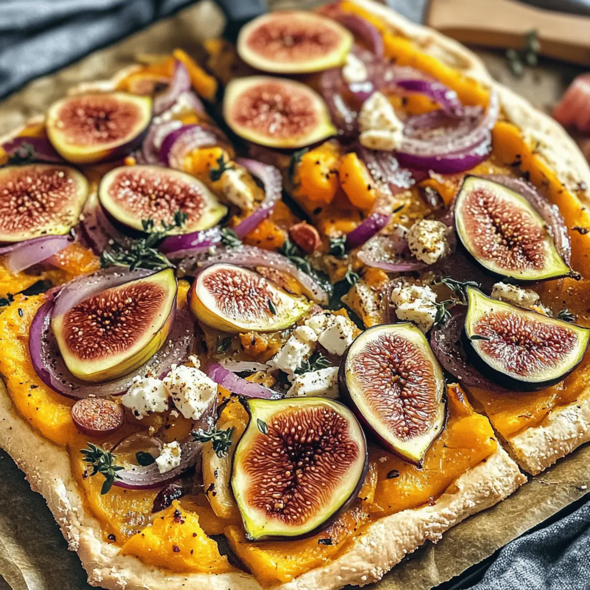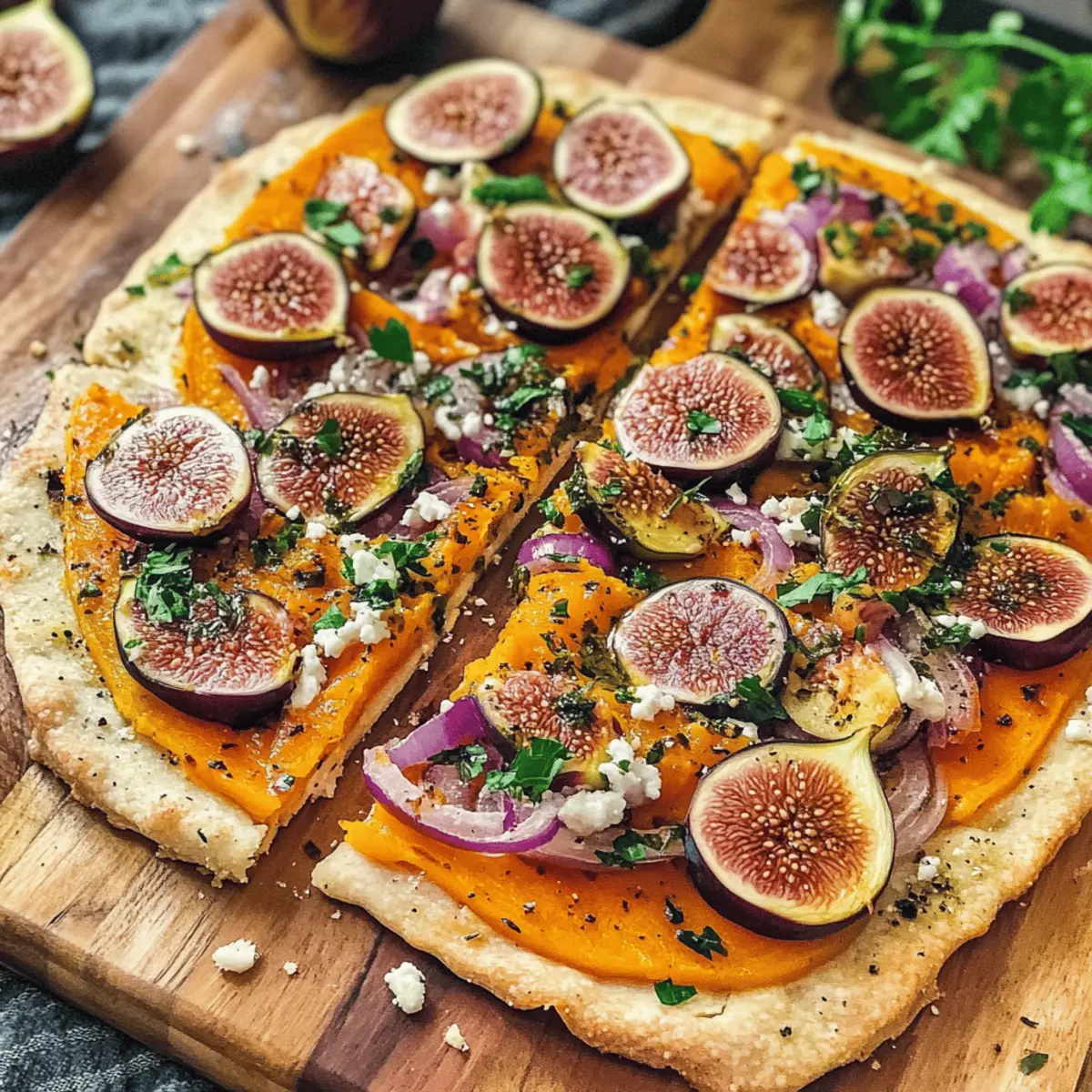 Die Verlockung von frisch gebackenem Flammkuchen ist einfach unwiderstehlich, besonders wenn er in einer veganen Version daherkommt! Heute teile ich mit euch mein Rezept für veganen Flammkuchen mit Kürbis, karamellisierten Zwiebeln und Feigen. Diese komfortable Speise bietet nicht nur eine harmonische Kombination aus süß und herzhaft, sondern ist auch blitzschnell zubereitet – perfekt für hektische Abende oder gemütliche Herbstversammlungen. Mit einem knusprigen, hefefreien Teig und einer Auswahl an köstlichen, pflanzlichen Zutaten schafft ihr ein Gericht, das nicht nur vegan, sondern auch glutenfrei zubereitet werden kann. Welche kreativen Toppings würdet ihr hinzufügen, um euren Flammkuchen zu verfeinern? Warum wird dir dieser Rezept gefallen? Einfache Zubereitung: Die Zubereitung ist unkompliziert und leicht, perfekt für Kochanfänger und Profis gleichermaßen. Köstlicher Geschmack: Die Kombination aus cremigem, pflanzlichem Käse und süßem Kürbis sorgt für einen unvergesslichen Geschmack, der alle begeistert. Vielseitigkeit: Du kannst die Toppings nach Belieben anpassen, sei es mit saisonalem Gemüse oder frischen Kräutern. Schnell und unkompliziert: In nur 10 Minuten ist der Flammkuchen fertig – ideale Lösung für stressige Tage! Gesund und nahrhaft: Mit nur etwa 272 kcal pro Portion ist dieser vegane Flammkuchen nicht nur lecker, sondern auch nährstoffreich. Warum nicht ein paar kreative Ideen ausprobieren und deinen eigenen veganen Flammkuchen kreieren? Zutaten für den veganen Flammkuchen • Dieser vegane Flammkuchen wird schnell und einfach zubereitet! Für den Teig Flammkuchenteig – Eine perfekte Basis; du kannst entweder Weizen- oder Dinkelmehl verwenden, glutenfreies Mehl ist ebenfalls eine gute Alternative. Backpulver – Unser Geheimnis für einen leichten, lockeren Teig; austauschbar mit Trockenhefe, wenn du etwas Ruhezeit einplanen möchtest. Salz – Bringt die Aromen zum Strahlen; essenziell für Teig und Belag. Wasser – Macht den Teig geschmeidig und sorgt für die richtige Konsistenz. Olivenöl – Fügt dem Teig eine herrliche Note hinzu und macht das gesamte Gericht saftiger. Für den Belag Veganer Frischkäse – Gibt dem Flammkuchen eine cremige Textur; ersetzen kannst du ihn durch selbstgemachten Cashew-Ricotta oder andere pflanzliche Käsealternativen. Hokkaido-Kürbis – Sorgt für einen süßen, erdigen Geschmack; schneide ihn in dünne Scheiben, um ein gleichmäßiges Garen zu gewährleisten. Rote Zwiebel – Verleiht dem Gericht eine süße Tiefe; am besten dünn schneiden für optimale Ergebnisse. Tofu-Feta – Für eine herzhafte Note; experimentiere mit geräuchertem Tofu für einen anderen Geschmack. Kürbiskerne – Geben einen schönen Crunch und einen nussigen Geschmack. Feigen – Bringen eine süße Überraschung ins Spiel; sie können nach Geschmack durch Äpfel, Birnen oder Trauben ersetzt werden. Petersilie – Frisch und aromatisch zum Garnieren; ziehe Alternativen wie Thymian oder Oregano in Betracht. Fällt dir schon ein leckeres Topping für deinen veganen Flammkuchen ein? Schritt-für-Schritt-Anleitung für den veganen Flammkuchen mit Kürbis und Feigen Step 1: Ofen vorbereiten Heize den Ofen auf 200°C vor und stelle ein großes Backblech im unteren Bereich des Ofens hinein. Das Blech wird heiß, sodass der Flammkuchen schön knusprig wird. Diese Vorbereitung dauert nur ein paar Minuten, sorgt aber für das perfekte Backergebnis. Step 2: Teig zubereiten In einer großen Schüssel mischst du das Weizen- oder Dinkelmehl mit Backpulver und einer Prise Salz. Verwende einen Schneebesen, um alle trockenen Zutaten gut zu vermengen. Danach gibst du langsam Wasser und Olivenöl hinzu und verrührst alles mit einem Löffel, bis ein Teig entsteht. Knete ihn für etwa 2-3 Minuten, bis er glatt und geschmeidig ist. Step 3: Teig ausrollen Lege den gekneteten Teig auf ein Blatt Backpapier und forme ihn mit den Händen grob in eine ovale Form. Verwende ein Nudelholz, um den Teig gleichmäßig auf etwa 5 mm Dicke auszurollen. Achte darauf, dass der Teig dünn genug ist, um am Ende schön knusprig zu werden. Der Teig sollte gut in die Form passen, die du für deinen veganen Flammkuchen verwendest. Step 4: Belag vorbereiten Verteile gleichmäßig den veganen Frischkäse auf dem ausgerollten Teig und lasse dabei einen kleinen Rand frei. So erhältst du eine schöne Beilage, die beim Backen nicht austrocknet. Der pflanzliche Käse bildet die cremige Grundlage und harmoniert wunderbar mit den anderen Zutaten des Flammkuchens. Step 5: Gemüse und Tofu-Feta addieren Schneide den Hokkaido-Kürbis und die rote Zwiebel in dünne Scheiben. Verteile diese gleichmäßig über den Frischkäse auf dem Teig. Zerkruemel den Tofu-Feta darüber und würze die Mischung mit Salz und Pfeffer. Ein paar Tropfen Olivenöl darüber verleihen dem Ganzen noch mehr Geschmack und sorgen dafür, dass die Zutaten beim Backen perfekt garen. Step 6: Backen Nimm das heiße Backblech aus dem Ofen und ziehe das Backpapier mit dem belegten Teig vorsichtig darauf. Backe den veganen Flammkuchen für etwa 10 Minuten, bis die Ränder goldbraun und knusprig sind. Achte darauf, dass der Teig gut durchgebacken ist, da er sonst nicht die gewünschte Textur bekommt. Step 7: Finisieren und Servieren Nimm den Flammkuchen aus dem Ofen und lasse ihn einige Minuten abkühlen. Bevor du ihn servierst, garniere ihn mit frisch geschnittenen Feigen und etwas frischer Petersilie oder deinen Lieblingskräutern. Diese letzten Zutaten bringen frische Aromen und eine ansprechende Optik in dein Gericht. Step 8: Genießen Serviere den veganen Flammkuchen warm, idealerweise frisch aus dem Ofen. Dieser wird sicherlich allen schmecken und ist das perfekte Gericht für gesellige Runden oder als Snack für zwischendurch. Was passt gut zu veganem Flammkuchen? Die Kombination aus dem knusprigen Flammkuchen und den köstlichen Beilagen wird dein Geschmackserlebnis perfekt abrunden. Frischer grüner S