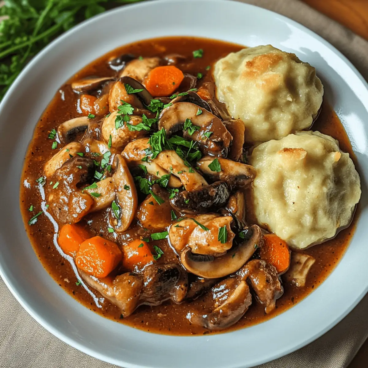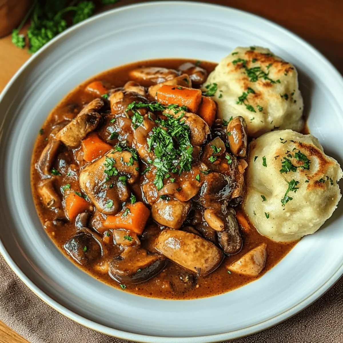 Vegan goulash with mushrooms and bread dumplings