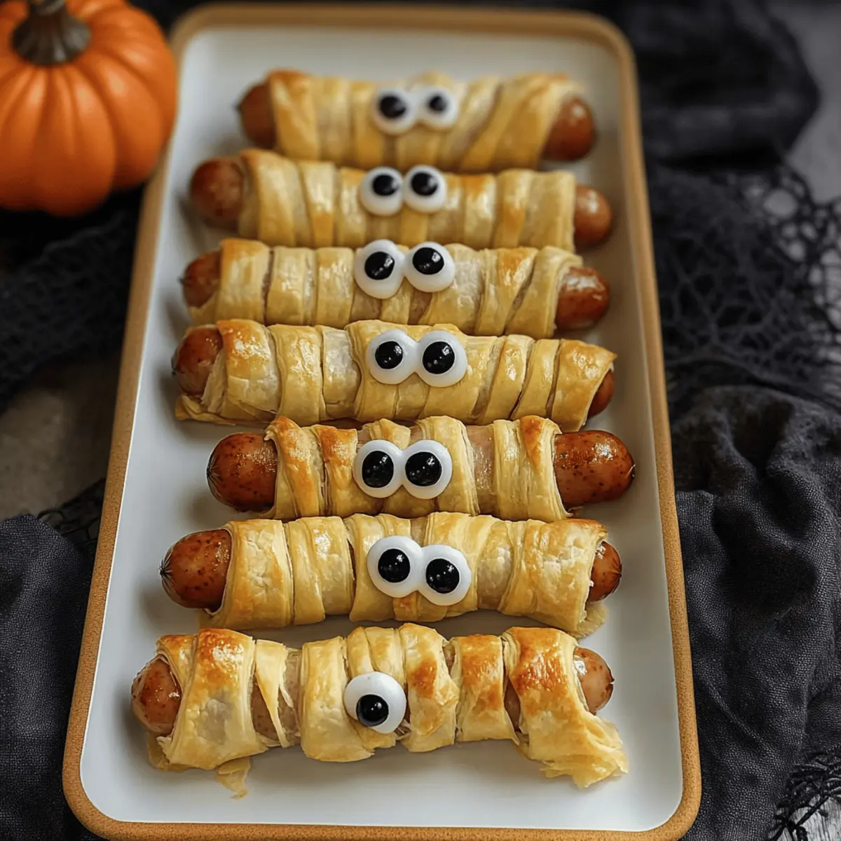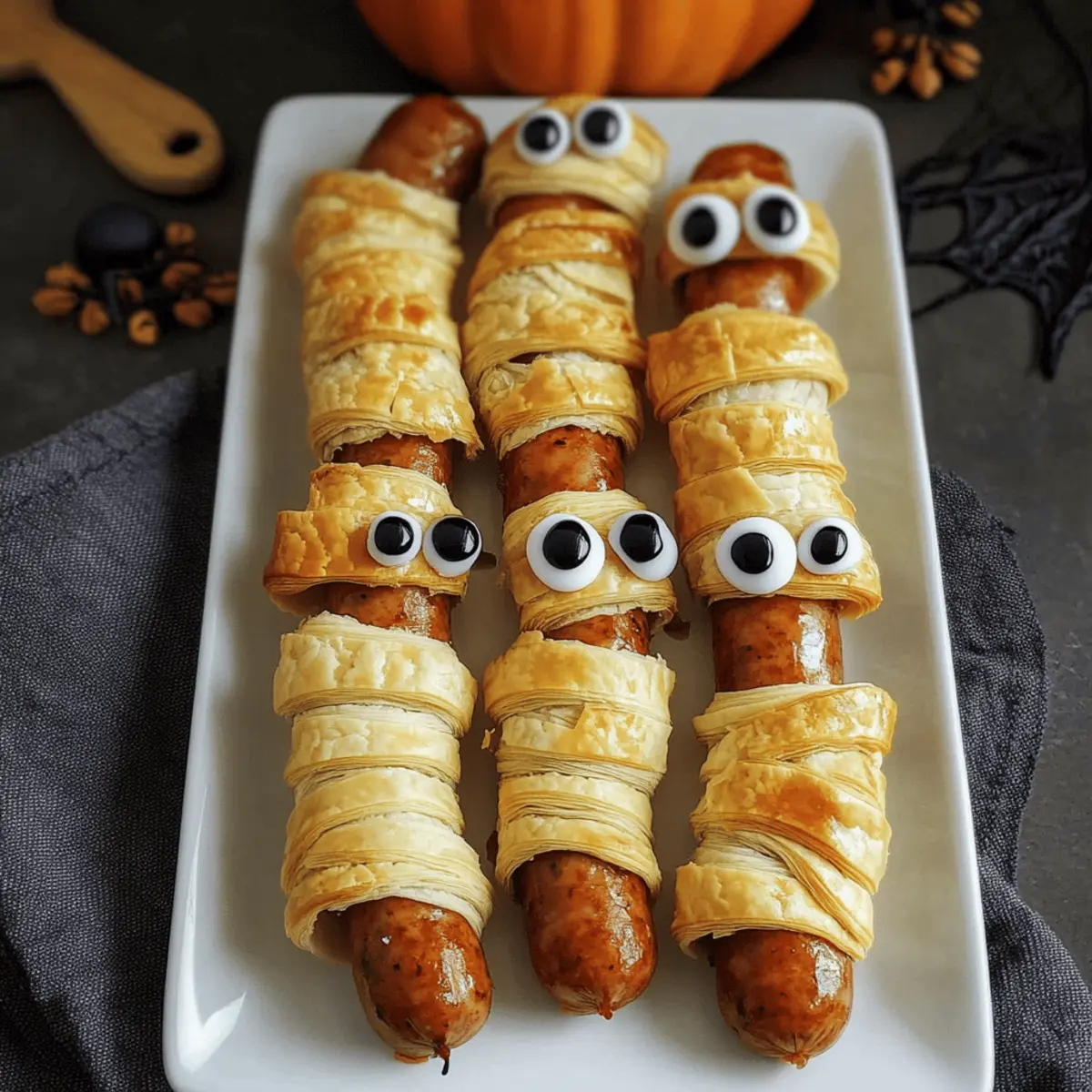 „Würstchen im Schlafrock“ sind nicht nur ein dürftiger Snack, sondern eine echte Halloween-Sensation, die aus jedem Kindergeburtstag ein Fest macht! Mit ihrem knusprigen Blätterteig und den lustigen essbaren Augen sind diese Halloween-Mumien der Hit auf jeder Party. Idealerweise bereite ich dieses einfaches Rezept für Kinder vor, denn es ist eine großartige Möglichkeit, die Kleinen in die Küche einzubeziehen. Entdecken Sie, wie einfach es ist, schnell leckere Fingerfood für Halloween zu zaubern, das nicht nur lecker, sondern auch aufregend aussieht! Darüber hinaus können Sie mit unterschiedlichen Würstchen und kreativen Dekorationen Ihrer Fantasie freien Lauf lassen. Sind Sie bereit, Ihre Familie mit diesen schaurig-guten Snacks zu begeistern? Warum sind diese Halloween-Mumien so besonders? Einfachheit: Dieses Rezept für Würstchen im Schlafrock ist kinderleicht! Die Schritte sind klar und schnell, sodass auch Anfänger schnell Erfolg haben. Kreativität: Lassen Sie Ihrer Kreativität freien Lauf! Experimentieren Sie mit verschiedenen Würstchen und Dekorationen, um jede Mumie einzigartig zu machen. Familienaktivität: Binden Sie die ganze Familie ein: Die Kleinen werden es lieben, beim Wickeln der Würstchen zu helfen, und genießen es, ihre eigenen Mumien zu gestalten. Beliebtes Fingerfood: Diese spooky Snacks sind ein Hit bei jungen und alten Gästen und sorgen für Begeisterung auf jeder Halloween-Party. Schnelle Zubereitung: In nur 15 Minuten sind diese köstlichen Snacks bereit zum Servieren, perfekt für spontane Feiern oder den kleinen Hunger zwischendurch. Entdecken Sie auch andere tolle Ideen für schaurige Snacks und machen Sie Ihre Halloween-Feier unvergesslich! Würstchen im Schlafrock Zutaten • Macht die Zubereitung zum Kinderspiel! Für den Teig Blätterteig – Hauptbestandteil, der die Mumienform gibt. Eine ½ Rolle reicht für 12 Würstchen. Eigelb – Für das Bestreichen des Teigs, gibt eine goldbraune Farbe. Kann durch Milch ersetzt werden. Milch – Zum Vermischen mit Eigelb. Optional, für eine leichtere Konsistenz. Für die Mumien Würstchen – Die Basis der Mumie. Verwende deine Lieblingswürstchen, um das Rezept individuell anzupassen. Essbare Augen – Für den gespenstischen Effekt. Sind online oder im Supermarkt erhältlich und machen die Mumien lebendig. Ketchup – Zum Dippen und als Kleber für die Augen. Kann durch andere Dips ersetzt werden, wenn gewünscht. Schritt-für-Schritt-Anleitung für Würstchen im Schlafrock Step 1: Ofen vorheizen Heize deinen Ofen auf 200 °C Umluft (180 °C Ober-/Unterhitze) vor. Diese Temperatur sorgt dafür, dass die Mumien gleichmäßig knusprig werden. Überprüfe, ob der Ofen vollständig aufgeheizt ist, indem du die Heizung einschaltest, während du deine Zutaten bereitstellst. Step 2: Blätterteig vorbereiten Rolle etwa ½ Rolle Blätterteig auf einer leicht bemehlten Fläche aus. Schneide 12 Streifen von ca. 1,5 cm Breite ab. Diese Streifen werden später um die Würstchen gewickelt. Achte darauf, gleichmäßige Streifen zu schneiden, um ein schönes Finish zu erzielen. Step 3: Würstchen wickeln Nimm ein Würstchen und beginne, die Teigstreifen spiralförmig um das Würstchen zu wickeln. Lasse dabei an der Oberseite Platz für die Augen der Mumie. Du kannst auch ein Spießchen verwenden, um die Verbindung zu erleichtern, musst dieses jedoch vor dem Backen entfernen. Step 4: Auf das Backblech legen Platziere die eingewickelten Würstchen vorsichtig auf ein mit Backpapier belegtes Backblech. Achte darauf, dass sie genügend Abstand haben, damit der Blätterteig beim Backen schön aufgeht und nicht zusammenklebt. Step 5: Eigelb-Mischung vorbereiten Verquirle das Eigelb mit einem Schuss Milch in einer kleinen Schüssel. Diese Mischung dient dazu, die Mumien zu bestreichen und ihnen eine appetitliche goldbraune Farbe zu verleihen. Achte darauf, dass die Mischung gut vermischt ist, bevor du fortfährst. Step 6: Mumien bestreichen Nimm einen Pinsel und bestreiche die sichtbaren Teile des Blätterteigs mit der Eigelb-Milch-Mischung. Diese Aktion verleiht den Würstchen im Schlafrock einen schönen Glanz und hilft, die Blätterteigschichten während des Backens zu verbinden. Step 7: Backen Schiebe das Backblech in den vorgeheizten Ofen und backe die Mumien für etwa 12 bis 15 Minuten. Achte auf eine goldbraune Farbe und eine knusprige Textur, denn dies zeigt, dass sie perfekt gebacken sind. Step 8: Augen anbringen Sobald die Würstchen im Schlafrock aus dem Ofen kommen und leicht abgekühlt sind, tauche die Rückseite der essbaren Augen in Ketchup oder Honig. Drücke sie vorsichtig auf die offenen Stellen der Mumien, um einen gruseligen, aber lustigen Effekt zu erzielen. Step 9: Servieren Serviere die fertigen Würstchen im Schlafrock warm auf einem schönen Teller. Stelle eine Schüssel Ketchup zum Dippen daneben, damit jeder die Halloween-Mumien nach Belieben genießen kann. Guten Appetit! Aufbewahrungstipps für Würstchen im Schlafrock Raumtemperatur: Halte die Würstchen im Schlafrock bei Raumtemperatur für bis zu 2 Stunden frisch. Danach sollten sie zur Vermeidung von Bakterien in den Kühlschrank. Kühlschrank: Bewahre die Momien in einem luftdichten Behälter im Kühlschrank auf, wo sie bis zu 3 Tage frisch bleiben. Achte darauf, sie vor dem Erhitzen nicht zu stapeln, um die Knusprigkeit zu erhalten. Gefrierschrank: Du kannst die Würstchen im Schlafrock bis zu 2 Monate einfrieren. Wickele sie in Frischhaltefolie und lege sie in einen Gefrierbeutel. Zum Reduzieren von Frostbildung ist es hilfreich, die Beutel gut zu verschließen. Wiedererwärmen: Zum Aufwärmen einfach die gefrorenen Mumien im Ofen bei 180 °C für etwa 10-15 Minuten backen, bis sie erhitzt und wieder knusprig sind. Dies sorgt dafür, dass die Würstchen im Schlafrock ihre perfekte Textur zurückerhalten. Würstchen im Schlafrock Variationen Entdecken Sie, wie Sie dieses leckere Rezept auf verschiedene Weisen anpassen können, um 