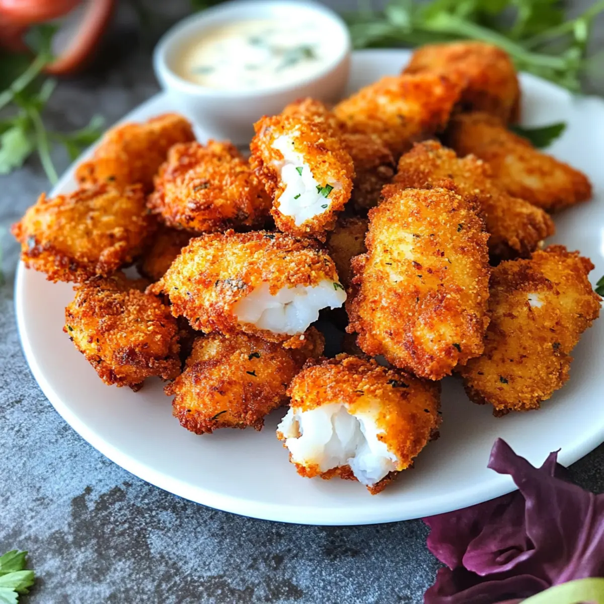 Die anderen Gäste haben mich verwundert angesehen, als ich die Würzigen Fischnuggets serviert habe – und das zu Recht! Diese kleinen, knusprigen Häppchen sind nicht nur ein echter Hingucker, sondern auch eine hervorragende Wahl für die ganze Familie. Mit der perfekten Mischung aus aromatischem Peri Peri-Gewürz sorgen sie für einen leichten, würzigen Kick, der selbst die kleinsten Esser begeistert. Ob tiefgebacken, luftgebacken oder gebacken – die Zubereitung ist so vielseitig wie die Geschmäcker! Ein weiterer Pluspunkt: Sie sind gesünder als die meisten gefrorenen Varianten aus dem Supermarkt und schnell gemacht. Lust auf einen Snack, der nicht nur köstlich schmeckt, sondern auch kreativ variiert werden kann? Lasst uns starten! Warum sind Würzige Fischnuggets so beliebt? Vielseitigkeit: Diese Fischnuggets können auf drei verschiedene Arten zubereitet werden – ob tiefgebacken, luftgebacken oder im Ofen, jede Methode bringt eine eigene Note! Gesundheitlicher Genuss: Mit frischen Zutaten und weniger Fett als die gefrorenen Varianten sind sie eine perfekte, gesunde Wahl für die ganze Familie. Kinderfreundlich: Dank der anpassbaren Schärfe sind sie ideal für kleine Esser; reduziere einfach das Peri Peri, um einen milderen Geschmack zu erzielen. Einfache Zubereitung: In nur wenigen Schritten könnt ihr diese köstlichen Nuggets zubereiten, ohne stundenlang in der Küche stehen zu müssen. Großer Publikumsfavorit: Egal, ob bei einem Familienessen oder als Party-Snack, diese Nuggets werden garantiert für Begeisterung sorgen! Vergeßt nicht, sie mit einer köstlichen Sauce zu servieren – vielleicht eine selbstgemachte Tartar-Sauce? Würzige Fischnuggets Zutaten Für den Teig Boneless White Fish (300g) – Hauptproteinquelle, in Würfel schneiden für gleichmäßiges Garen. Panko Breadcrumbs (¾ Tasse) – Sorgt für eine knusprige Textur; kann bei Bedarf durch zerdrückte Cornflakes ersetzt werden. Allzweckmehl (4 Esslöffel + 2 Esslöffel) – Für die Panade und Bindung; unerlässlich für die Knusprigkeit. Dried Parsley (2 Esslöffel) – Fügt Frische und Farbe hinzu. Ei (1) – Bindet die Panade an den Fisch. Milch (2 Esslöffel) – Schafft eine glatte Ei-Mischung für die Panade. Vinegar (1 Teelöffel) – Hilft, den Fisch zart zu machen und den Geschmack zu verstärken. Für die Würze Peri Peri Seasoning (1-2 Teelöffel) – Hauptgewürz für die Schärfe; Menge nach gewünschtem Schärfegrad anpassen. Ginger Garlic Paste (1 Teelöffel) – Fügt Tiefe und Geschmack hinzu. Salt (½ Teelöffel) – Verbessert den Gesamtgeschmack. Crushed Black Pepper (½ Teelöffel) – Sorgt für zusätzliche Wärme. Die Würzigen Fischnuggets sind nicht nur lecker, sondern auch einfach zuzubereiten und bieten eine gesunde Alternative zu klassischen Snacks. Lass uns in die Zubereitung eintauchen! Schritt-für-Schritt-Anleitung für Würzige Fischnuggets Schritt 1: Fisch vorbereiten Mische in einer Schüssel den Essig, das Peri Peri-Gewürz, die Ingwer-Knoblauch-Paste, das Salz und den schwarzen Pfeffer. Füge die Fischwürfel hinzu und rühre gut um, sodass sie gleichmäßig gewürzt sind. Bestäube die Würfel mit 2 Esslöffeln Mehl und achte darauf, dass sie vollständig bedeckt sind, um eine gute Basis für die Panade zu schaffen. Schritt 2: Panade vorbereiten In einer separaten Schüssel kombinierst du die Panko-Brösel, die restlichen 2 Esslöffel Mehl und die getrocknete Petersilie. In einer weiteren Schüssel verquirlst du das Ei mit der Milch, bis die Mischung glatt ist. Diese beiden Schüsseln bilden die Grundlage für die Panierung der Würzigen Fischnuggets. Schritt 3: Fisch panieren Nimm die gewürzten Fischwürfel und tauche sie zuerst in die Eier-Mischung, sodass sie gleichmäßig bedeckt sind. Wälze sie dann in der Pankomischung, bis sie vollständig ummantelt sind. Lege die panierten Nuggets auf einen Teller oder ein Backblech und stelle sicher, dass sie nicht übereinanderliegen. Optional kannst du die Nuggets nun einfrieren, um sie später zu verwenden. Schritt 4: Garen Für das Frittieren erhitzt du das Öl in einem tiefen Topf auf mittlerer Temperatur. Frittiere die Nuggets portionenweise, bis sie goldbraun und knusprig sind, was etwa 4-6 Minuten dauern sollte. Für die Luftfritteuse arrangierst du die Nuggets in einer einzigen Schicht und besprühst sie leicht mit Olivenöl. Gare sie bei 180 °C für 10-15 Minuten und wende sie zur Hälfte, bis sie eine schöne goldene Farbe erreicht haben. Schritt 5: Backen Wenn du die Würzigen Fischnuggets backen möchtest, heize den Ofen auf 200 °C vor. Lege die panierten Nuggets auf ein mit Backpapier ausgelegtes Blech und backe sie 15-18 Minuten lang, bis sie goldbraun und knusprig sind. Achte darauf, dass sie ganz durchgegart sind, um das beste Geschmackserlebnis zu garantieren. Schritt 6: Servieren Sobald die Würzigen Fischnuggets fertig sind, serviere sie heiß mit einer köstlichen Sauce deiner Wahl, wie z.B. einer selbstgemachten Tartar-Sauce. Du kannst gerne zusätzliches Peri Peri-Gewürz darüber streuen, um den Geschmack zu intensivieren. Stelle sicher, dass du deine Nuggets in der besten Gesellschaft präsentierst – sie sind perfekt als Snack oder Hauptgericht für die ganze Familie! Meal Prep für Würzige Fischnuggets Die Würzigen Fischnuggets sind perfekt für deine Wochenplanung und das schnelle Abendessen! Du kannst die gewürzten Fischwürfel bis zu 24 Stunden im Voraus marinieren, damit sie die Aromen optimal aufnehmen. Bereite die Panade ebenfalls am Vortag vor, indem du die Panko-Brösel und das Mehl in einer Schüssel vermischst. Wenn du die Nuggets panierst, kannst du sie sogar einfrieren und bis zu 3 Monate aufbewahren – einfach unaufgetaut frittieren oder backen! Beim Garen solltest du darauf achten, dass das Öl heiß genug ist oder die Luftfritteuse gut vorgeheizt ist, um die perfekte Knusprigkeit zu erreichen. Diese zeitsparende Vorbereitung ermöglicht dir, jederzeit gesunde Snacks auf