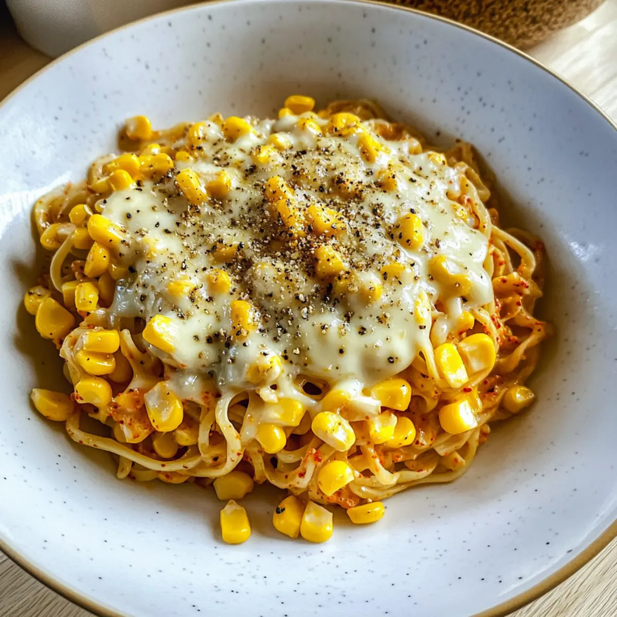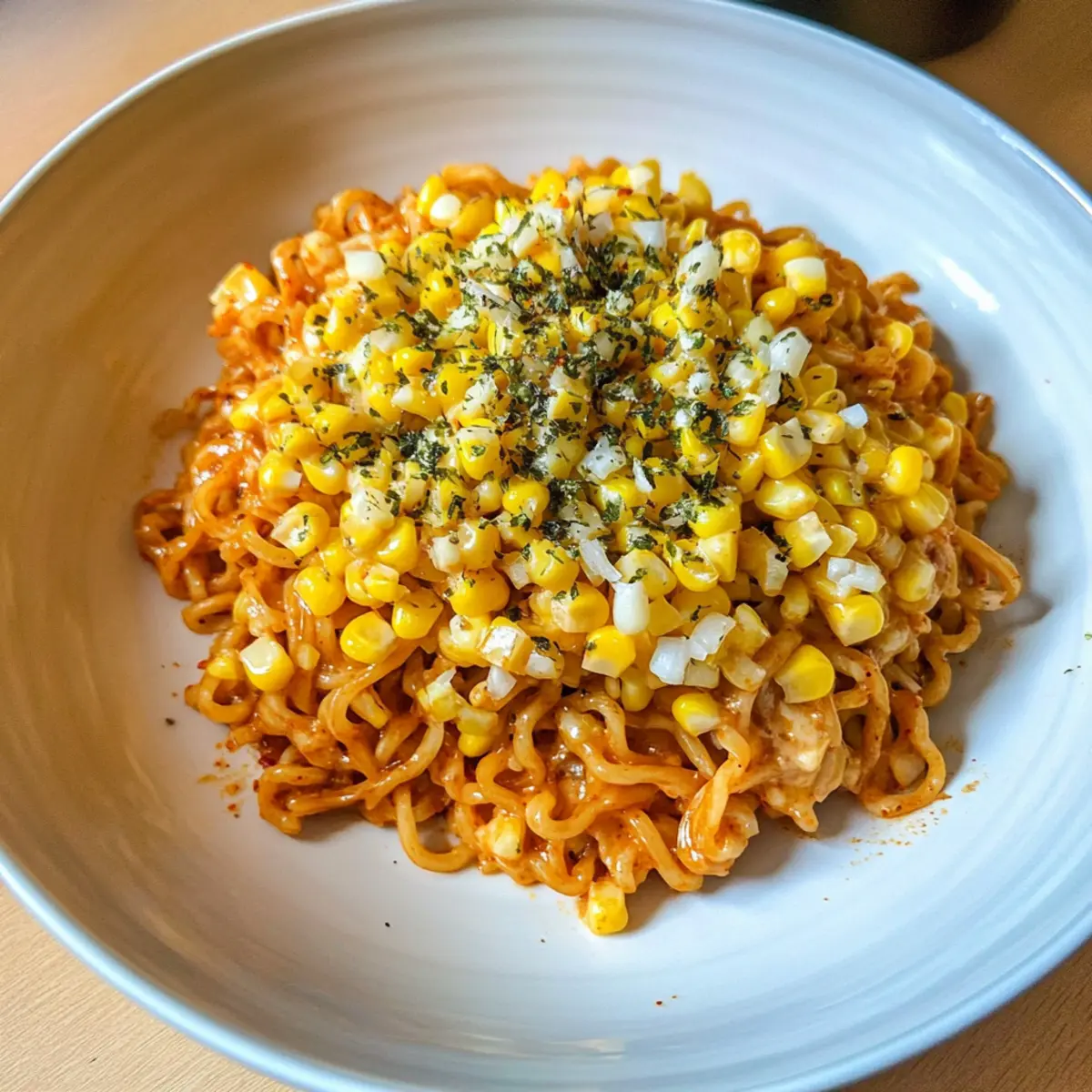 Feuriger Genuss: Die Kombination der würzigen Samyang-Nudeln und dem cremigen Maiskäse sorgt für einen aufregenden Geschmack, der süß und würzig zugleich ist.