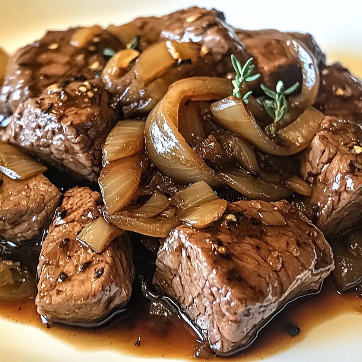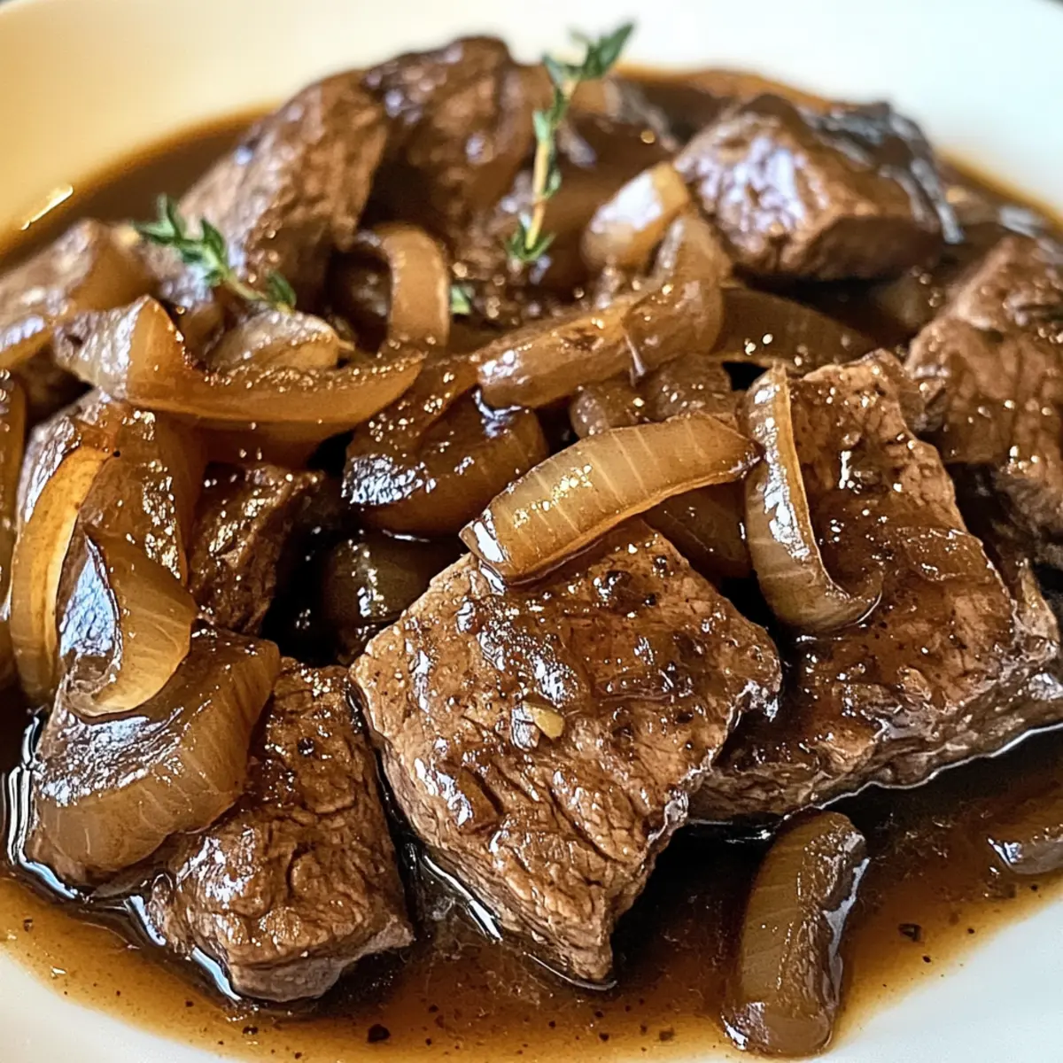 Wenn die ersten kühleren Tage des Jahres anbrechen, gibt es kaum etwas Besseres als ein herzhaftes Gericht, das einem sofort Geborgenheit schenkt. Das zarte Rindfleisch in aromatischer Balsamico-Zwiebel-Sauce ist genau das, was man braucht, um sowohl den Gaumen zu erfreuen als auch die Seele zu wärmen. Diese köstliche Kreation verbindet zartes Fleisch mit einer unwiderstehlichen süß-sauren Sauce, die durch karamellisierte Zwiebeln und den einzigartigen Geschmack von Balsamico-Essig zum Strahlen gebracht wird. Die einfache Zubereitung macht es zu einer idealen Wahl für den Alltag oder besondere Anlässe, während die glutenfreien Zutaten sicherstellen, dass auch Freunde mit speziellen diätetischen Bedürfnissen nicht zu kurz kommen. Bereit, Ihre Küche in einen Ort des Wohlgefühls zu verwandeln? Dann lassen Sie uns gemeinsam dieses unwiderstehliche Gericht entdecken! Warum sollten Sie dieses Rezept ausprobieren? Einfachheit: Die Zubereitung des zarten Rindfleischs in aromatischer Balsamico-Zwiebel-Sauce ist kinderleicht und erfordert keine speziellen Kochkünste. Reichhaltiger Geschmack: Die Kombination aus Balsamico-Essig und karamellisierten Zwiebeln sorgt für eine köstliche süß-saure Balance, die alle Geschmacksnerven anspricht. Vielseitigkeit: Ob für ein gemütliches Abendessen oder für festliche Anlässe – dieses Gericht passt immer und begeistert Gäste und Familie gleichermaßen. Zeitloser Komfort: Es bringt den herrlichen Geschmack klassischer Hausmannskost direkt auf Ihren Tisch. Möchten Sie etwas Abwechslung? Fügen Sie Wurzelgemüse wie Karotten hinzu oder genießen Sie es mit Kartoffelpizza mit geräuchertem Lachs. Vorbereitung: Perfekt zum Vorausplanen! Die Aromen entwickeln sich über Nacht, wenn Sie es im Kühlschrank aufbewahren. Genießen Sie es, jedes Mal auf die perfekten Momente zurückblicken zu können, wenn Sie Gäste bewirten. Zartes Rindfleisch in aromatischer Balsamico-Zwiebel-Sauce Zutaten • Entdecken Sie die wichtigsten Elemente, die dieses Gericht zum wahrhaftigen Genuss machen! Für das Rindfleisch Rindfleisch – Ein frisches Stück sorgt für die zarte Grundlage des Gerichts. Betonen Sie die Qualität! Für die Sauce Balsamico-Essig – Fügt eine süß-saure Tiefe hinzu; ideal für das Zartes Rindfleisch in aromatischer Balsamico-Zwiebel-Sauce. Zwiebeln – Sollten gut karamellisiert werden, um Süße und Aroma zu verleihen. Knoblauch – Für zusätzlichen Geschmack; frisch ist am besten, kann aber durch Pulver ersetzt werden. Olivenöl – Zum Anbraten der Zutaten, sorgt für eine goldene Kruste. Thymian – Frisches Kraut bietet eine aromatische Note; getrocknet ist auch möglich, aber frisch ist ideal. Salz und Pfeffer – Grundgewürze zur Geschmacksverstärkung. Tipp Wenn Sie abenteuerlustig sind, experimentieren Sie mit verschiedenen Essigsorten oder Kräutern für interessante Geschmacksprofile! Step-by-Step Instructions für Zartes Rindfleisch in aromatischer Balsamico-Zwiebel-Sauce Step 1: Rindfleisch vorbereiten Das Rindfleisch gründlich mit Küchenpapier abtrocknen und großzügig mit Salz und Pfeffer würzen. Dies sorgt für einen kräftigen Geschmack. Lassen Sie das fertig gewürzte Fleisch für etwa 10 Minuten bei Zimmertemperatur ruhen, damit es gleichmäßig gart. Step 2: Fleisch anbraten In einem großen Schmortopf Olivenöl bei mittlerer Hitze erhitzen, bis es glänzt. Das Rindfleisch hinzugeben und von allen Seiten 5-7 Minuten anbraten, bis eine goldene Kruste entsteht. Achten Sie darauf, das Fleisch nicht zu überfüllen, damit es gut bräunt. Step 3: Zwiebeln anbraten Das Rindfleisch aus dem Topf nehmen und beiseitelegen. Im gleichen Topf die in Scheiben geschnittenen Zwiebeln hinzufügen und bei mittlerer Hitze 5-7 Minuten anbraten, bis sie weich und leicht karamellisiert sind. Die Zwiebeln sollten eine goldene Farbe annehmen und ein süßes Aroma verströmen. Step 4: Knoblauch hinzufügen Den gehackten Knoblauch zu den Zwiebeln geben und für 1-2 Minuten unter ständigem Rühren anbraten, bis er duftet. Achten Sie darauf, dass der Knoblauch nicht verbrennt, da dies einen bitteren Geschmack erzeugen kann. Step 5: Balsamico-Essig einkochen Den Balsamico-Essig in den Topf geben und für 2-3 Minuten köcheln lassen. Dies wird die Aromen intensivieren und die Zwiebeln in eine köstliche, süß-saure Sauce verwandeln. Rühren Sie die Mischung regelmäßig um, um ein Ankleben zu vermeiden. Step 6: Rindfleisch schmoren Das Rindfleisch zurück in den Topf geben und mit frischem Thymian bedecken. Den Topf abdecken und das Ganze bei niedriger Hitze 2-3 Stunden schmoren lassen. Das Fleisch sollte zart und leicht zu zerteilen sein, wenn es fertig ist; überprüfen Sie regelmäßig, ob genug Flüssigkeit vorhanden ist. Step 7: Servieren Das Rindfleisch aus dem Topf nehmen und in Stücke schneiden. Die aromatische Balsamico-Zwiebel-Sauce über das Fleisch gießen und warm servieren. Dieses zarte Rindfleisch in aromatischer Balsamico-Zwiebel-Sauce passt hervorragend zu Kartoffelpüree oder frischem Baguette. Was passt zu Zartem Rindfleisch in aromatischer Balsamico-Zwiebel-Sauce? Das perfekte Abendessen wird durch köstliche Beilagen noch unvergesslicher – entdecken Sie, wie Sie Ihr zartes Rindfleisch in aromatischer Balsamico-Zwiebel-Sauce stilvoll ergänzen können. Cremiges Kartoffelpüree: Die zarte Textur und der milde Geschmack harmonieren perfekt mit der intensiven Sauce. Ein Genuss, den jeder liebt! Frisches Baguette: Ideal, um die köstliche Balsamico-Zwiebel-Sauce aufzusaugen. Die knusprige Kruste verleiht einen tollen Kontrast zum zarten Fleisch. Gedünstetes Gemüse: Ein Mix aus Brokkoli und Karotten bringt frische und Farbe auf den Teller. Es rundet das Gericht ab und macht es gesünder. Rotwein: Ein vollmundiger roter Wein wie Merlot ergänzt die Aromen des Rindfleischs und verleiht dem Abend ein festliches Flair. Gereifter Käse: Servieren Sie einen kräftigen Käse wie Parmesan oder Gruyère als Beilage, um den