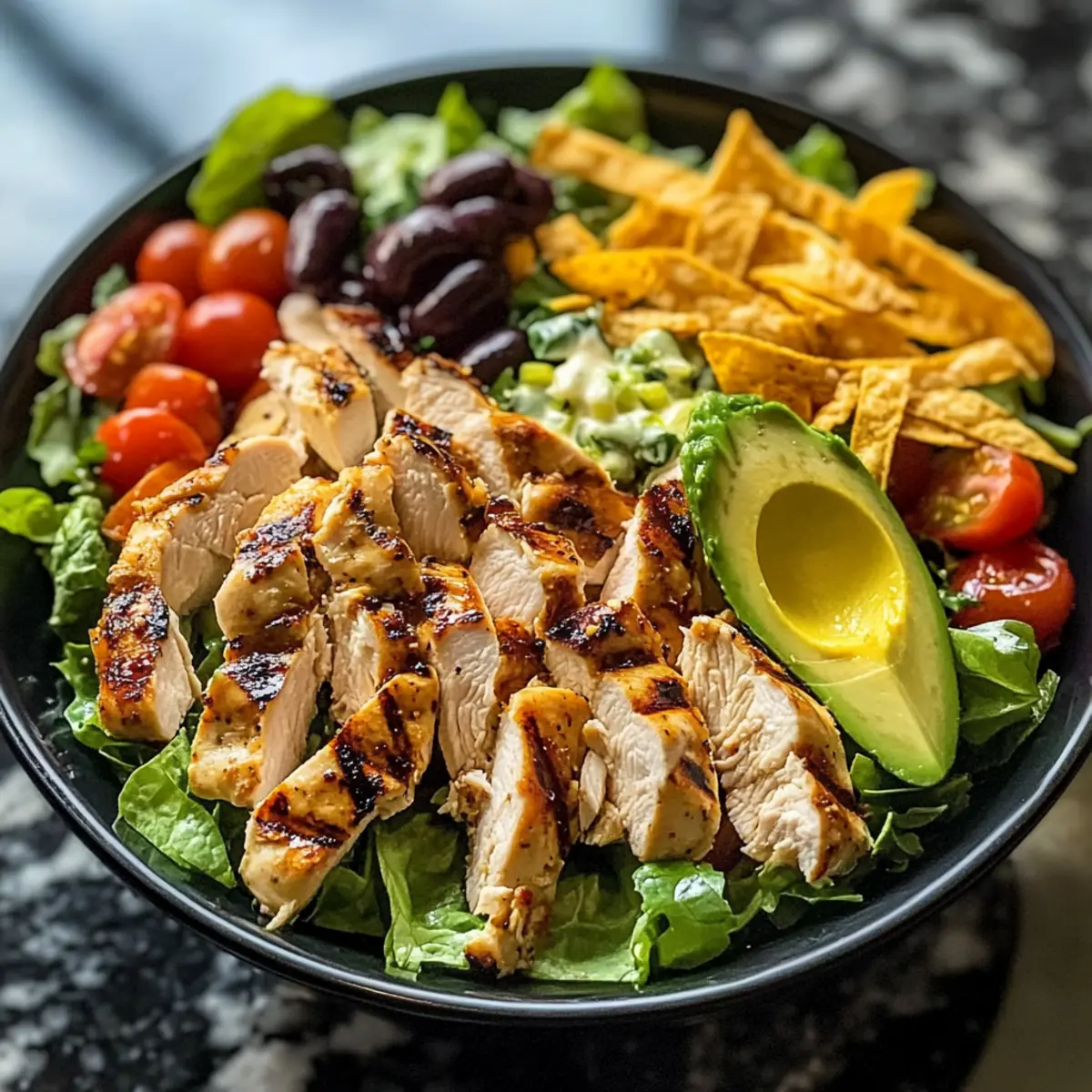 Beginne mit einer großzügigen Schicht der gemischten Blattsalate oder Römersalat auf einer großen Servierplatte. Schichte das gegrillte Hähnchen in Streifen darüber, gefolgt von den schwarzen Bohnen, dem gerösteten Mais, den Tomaten, der Avocado und der roten Zwiebel. Für zusätzlichen Geschmack streue den geriebenen Käse und die Tortilla-Streifen gleichmäßig darüber.