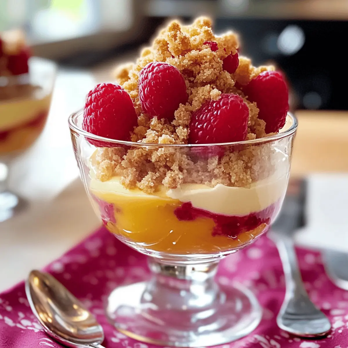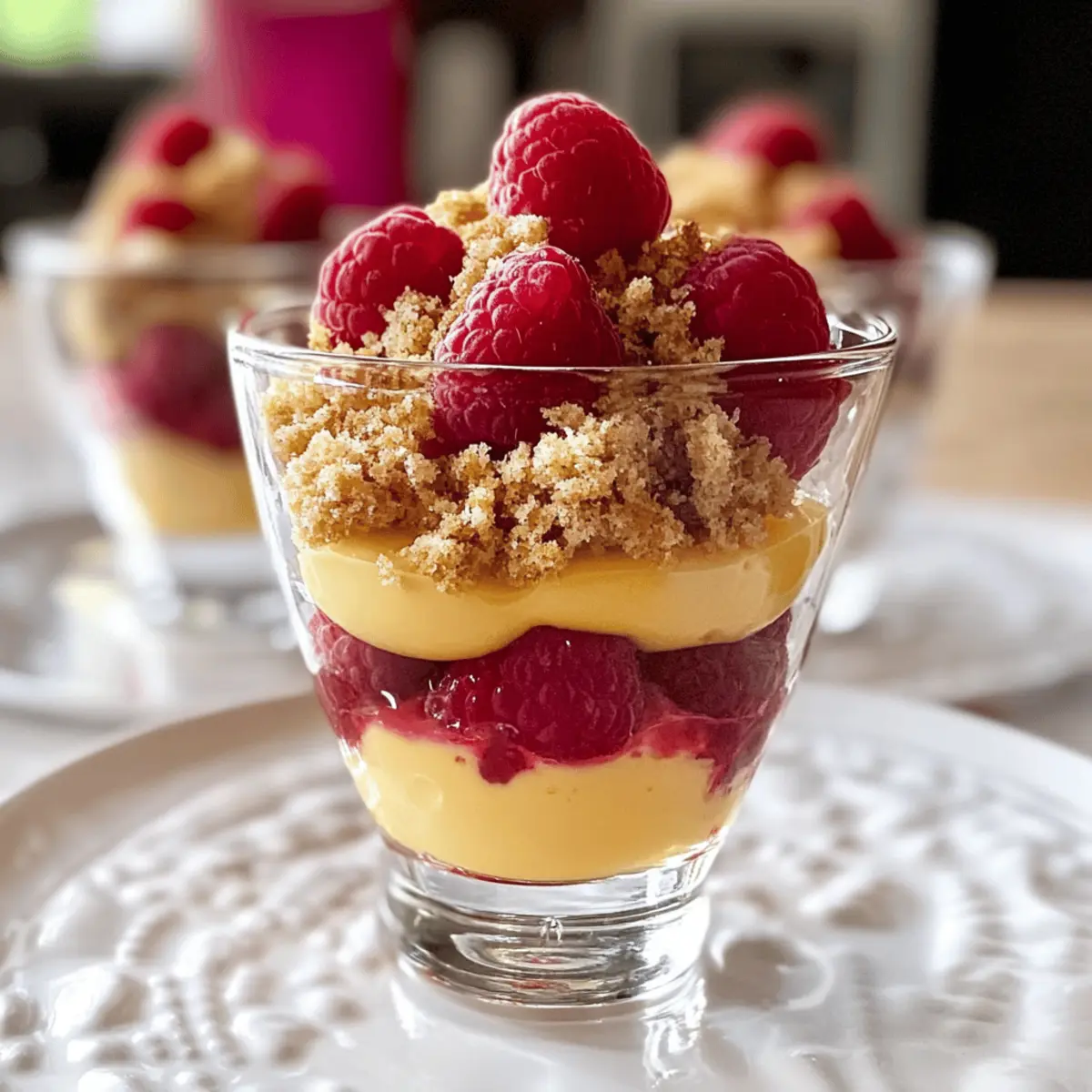 Sichtbarkeit überprüfen: Die Kombination aus Zitronencreme, Himbeeren und Streuseln sollte ansprechend geschichtet sein; verwenden Sie Gläser mit breiter Öffnung für eine tolle Präsentation.