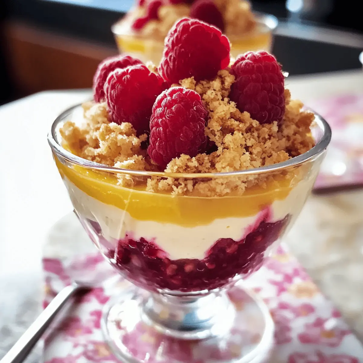 Ein erfrischendes Zitronen-Himbeer-Crumble kombiniert eine samtige Zitronencreme mit lebhaften Himbeeren und einem knusprigen Streusel.