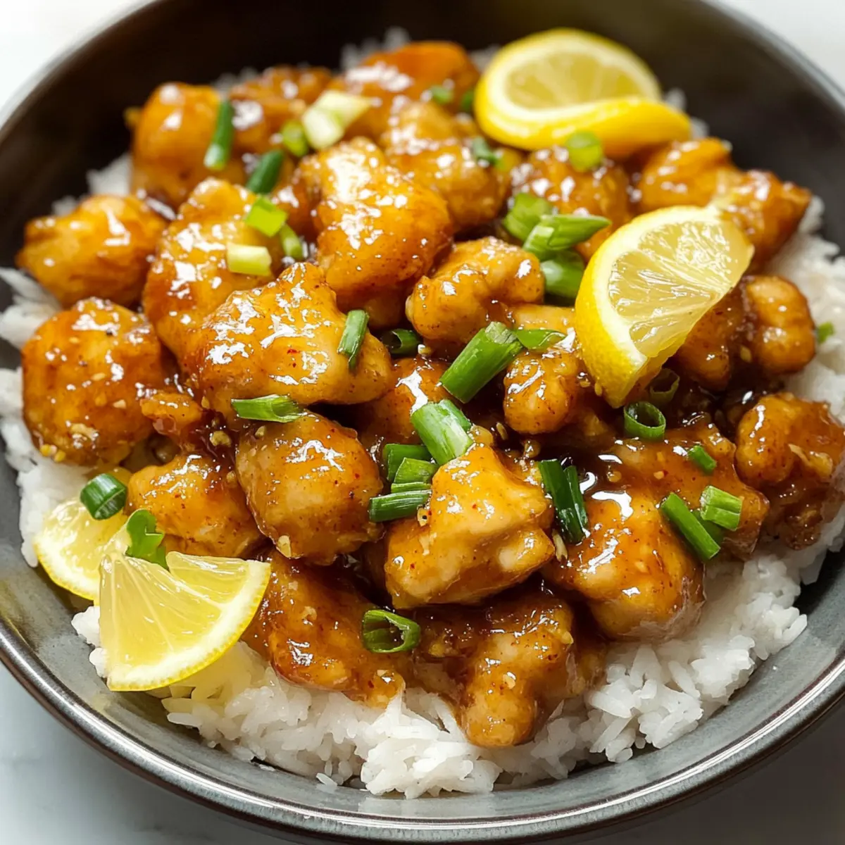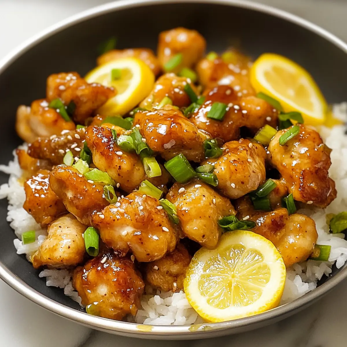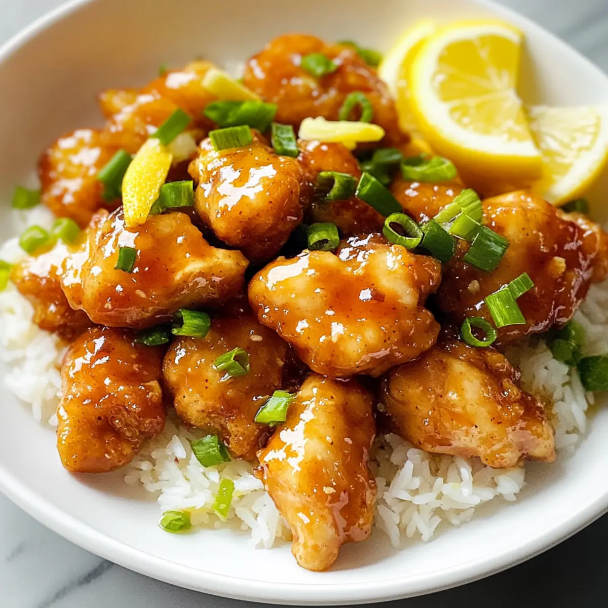 Es gibt Gerichte, die uns sofort in die richtige Stimmung versetzen, und mein Zitronenhähnchen ist genau das! Diese knackigen, goldenen Hähnchenstücke in einer glänzenden, süß-sauren Zitronensauce sind nicht nur einfach zuzubereiten, sondern auch der perfekte Genuss für hektische Abende. In nur 30 Minuten zaubern Sie ein asiatisch inspiriertes Gericht auf den Tisch, das definitiv auch die Fast-Food-Sehnsüchte stillt. Die Kombination aus tangy Zitrone und zartem Hähnchen macht es zu einem Rezept, das sowohl für große Familientafeln als auch für intime Dinner-Abende geeignet ist. Neugierig darauf, wie einfach es ist, diesen Restaurant-Klassiker nach Hause zu holen? Lassen Sie uns gemeinsam loslegen! Warum werden Sie dieses Rezept lieben? Einfachheit: Die Zubereitung ist kinderleicht und benötigt nur grundlegende Kochfertigkeiten, perfekt für alle, die in der Küche nicht viel Zeit verlieren möchten. Knusprig & Zart: Jedes Stück Hühnchen ist außen knusprig und innen saftig – die perfekte Kombination, die Ihre Sinne verzaubert. Schnell: In nur 30 Minuten steht diese köstliche Mahlzeit auf dem Tisch, ideal für vielbeschäftigte Abende. Vielseitigkeit: Servieren Sie das Zitronenhähnchen mit verschiedenen Beilagen wie Reis oder Nudeln; es passt zu allem! Familienfreundlich: Dieses Gericht wird sowohl Kinder als auch Erwachsene begeistern und ist damit perfekt für die ganze Familie. Probieren Sie es einfach aus – es ist eine großartige Möglichkeit, etwas Abwechslung in Ihre wöchentlichen Abendessen zu bringen! Zitronenhähnchen Zutaten Für das Hähnchen • Hähnchenbrust – Saftiges Protein, verwenden Sie am besten entbeinte, hautlose Hähnchenbrust. Eine Alternative wäre Truthahn oder Tofu. • Salz & Pfeffer – Würzen für eine geschmackliche Verstärkung. Passen Sie die Menge nach eigenem Geschmack an. • Knoblauchpulver – Fügt Tiefe zum Geschmack hinzu. Frischer, gehackter Knoblauch kann ebenfalls verwendet werden. • Speisestärke – Für eine knusprige Textur beim Frittieren. Sie können es mit Pfeilwurzstärke oder Tapioka-Mehl ersetzen, um es glutenfrei zu machen. • Olivenöl – Zum Braten des Hähnchens. Sie können auch Pflanzen- oder Rapsöl verwenden, falls gewünscht. Für die Sauce • Wasser – Um die Sauce flüssig zu machen. Kann durch Hühnerbrühe ersetzt werden, um den Geschmack zu intensivieren. • Zitronensaft – Essentiell für die Sauce; frisch ist am besten, während Flaschenlimonade oft zu süß ist. • Zitronenschale – Intensiviert das Zitronenaroma in der Sauce. Limettenschale ist eine großartige Alternative für eine andere Zitrusnote. • Zucker – Balanciert die Säure der Zitrone aus. Honig oder Ahornsirup sind natürliche Süßungsmittel, die auch verwendet werden können. Dieses Zitronenhähnchen wird Ihre monatlichen Dinner-Abende in ein neues Licht rücken! Schritt-für-Schritt-Anleitung für Zitronenhähnchen Step 1: Hähnchen vorbereiten Schneiden Sie die Hähnchenbrust in mundgerechte Stücke und würzen Sie sie großzügig mit Salz, Pfeffer und Knoblauchpulver. Bestreuen Sie das Hähnchen anschließend mit Speisestärke und tossen Sie alles gut, sodass die Stücke gleichmäßig bedeckt sind. Lassen Sie die marinierten Stücke für einige Minuten ruhen, damit die Aromen sich entfalten können. Step 2: Sauce anrühren In einer separaten Schüssel vermischen Sie das Wasser, den frisch gepressten Zitronensaft, die Zitronenschale und den Zucker. Rühren Sie alles gut durch, bis sich der Zucker aufgelöst hat. Fügen Sie zum Schluss etwas Speisestärke hinzu und mischen Sie alles gut, um eine glatte Sauce zu erhalten, die später für das Zitronenhähnchen verwendet wird. Step 3: Hähnchen braten Erhitzen Sie 2 Esslöffel Olivenöl in einer großen Pfanne bei mittlerer bis hoher Hitze. Wenn das Öl heiß ist (es sollte leicht schimmern), geben Sie die Hälfte der marinierten Hähnchenstücke in die Pfanne. Braten Sie die Stücke für etwa 4 Minuten an, bis sie eine goldbraune Kruste haben, und wenden Sie sie dann vorsichtig. Kochen Sie sie weitere 3-4 Minuten, bis sie durchgegart sind und eine Temperatur von 75 °C erreicht haben. Step 4: Auf den Teller legen Nehmen Sie das gebratene Hähnchen aus der Pfanne und geben Sie es auf einen Teller. Wiederholen Sie den Vorgang mit dem restlichen Hähnchen und fügen Sie bei Bedarf einen weiteren Esslöffel Olivenöl hinzu. Achten Sie darauf, die Stücke nicht zu überfüllen, damit sie schön knusprig bleiben können. Step 5: Sauce hinzufügen Sobald das gesamte Hähnchen gebraten ist, geben Sie die reservierten Hähnchenstücke wieder in die Pfanne. Nehmen Sie die Pfanne vom Herd und gießen Sie die vorbereitete Zitronensauce gleichmäßig über das Hähnchen. Lassen Sie die Mischung 30 Sekunden bis 1 Minute köcheln, damit die Sauce eindickt und alle Hähnchenstücke schön glasiert werden. Step 6: Anrichten und servieren Servieren Sie das Zitronenhähnchen sofort, garniert mit frischen Zitronenscheiben und gehackten Frühlingszwiebeln für einen zusätzlichen Farb- und Geschmackskick. Genießen Sie das Gericht idealerweise mit einer Beilage aus frisch gedämpftem Reis, um die köstliche Sauce aufzunehmen. Stellen Sie Zitronenhähnchen im Voraus zubereiten Das Zitronenhähnchen eignet sich hervorragend für die Vorbereitung im Voraus! Sie können die Hähnchenstücke bis zu 24 Stunden im Voraus marinieren, indem Sie sie mit Salz, Pfeffer, Knoblauchpulver und Speisestärke bestreuen und in einem luftdichten Behälter im Kühlschrank aufbewahren, um die Aromen zu intensivieren. Auch die Sauce lässt sich einfach bis zu 3 Tage vorher zubereiten; bewahren Sie sie in einem verschlossenen Glas im Kühlschrank auf, damit sie frisch bleibt. Wenn es Zeit zum Kochen ist, braten Sie das Hähnchen wie gewohnt und geben Sie die vorbereitete Sauce hinzu – die köstlichen Aromen sind einfach und schnell abrufbar, perfekt für vielbeschäftigte Abende, ohne Einbußen beim Geschma
