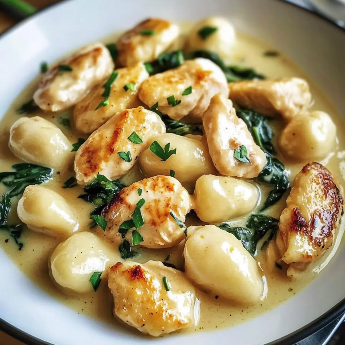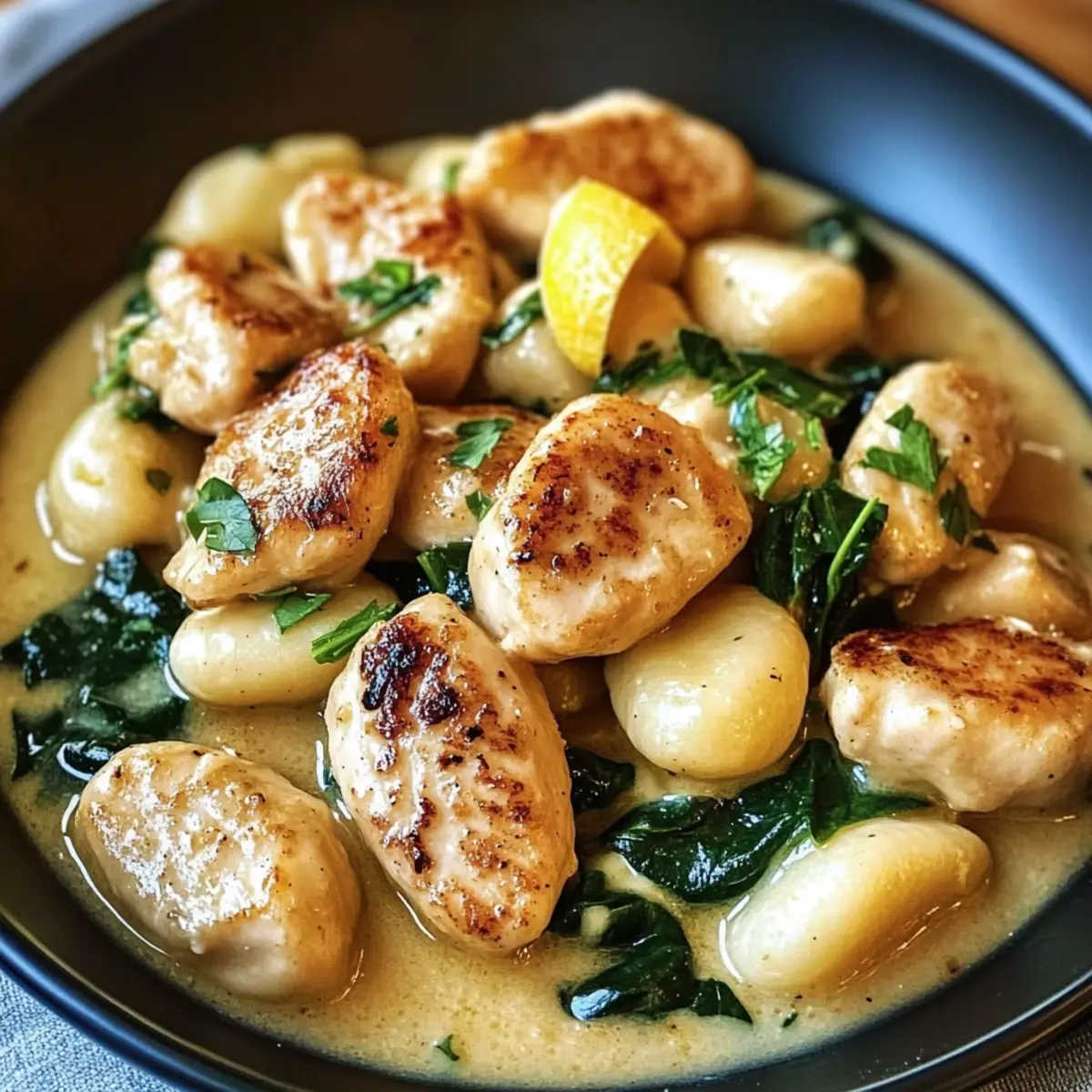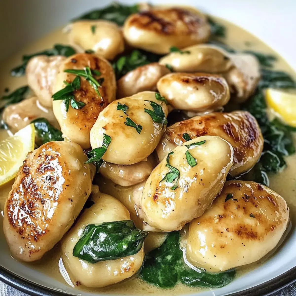 Die Zubereitung leckerer Gerichte kann manchmal wie ein Wettlauf gegen die Zeit erscheinen. Aber was wäre, wenn ich Ihnen sage, dass Sie ein köstliches Zitronenhühnchen Gnocchi Gericht in weniger als 30 Minuten zaubern können? Diese Kombination aus zartem Hühnchen, fluffigem Gnocchi und einer cremigen, zitronigen Sauce sorgt nicht nur für ein schnelles Abendessen, sondern ist auch ein wahrer Publikumsliebling. Die Vorteile? Es ist unkompliziert und vereint die Aromen der italienischen Küche, die jeder liebt. Perfekt für hektische Wochentage oder wenn Gäste ins Haus stehen! Also, sind Sie bereit, diesen geschmacklichen Kurzurlaub in Ihrer eigenen Küche zu erleben? Warum werden Sie dieses Rezept lieben? Simplicity: Die Zubereitung ist kinderleicht und benötigt keine besonderen Kochkünste, was es ideal für Küchenneulinge macht. Köstlicher Geschmack: Die Kombination aus frisch gepresstem Zitronensaft und cremiger Sauce zaubert ein Geschmacksfeuerwerk, das selbst die anspruchsvollsten Gaumen begeistert. Wunderbare Vielseitigkeit: Ob mit Hähnchen, Garnelen oder einer vegetarischen Version – dieses Rezept passt sich Ihren Vorlieben an und bleibt dennoch ein Hochgenuss. Probieren Sie eine Variation mit frischem Spinat oder einer leckeren Pasta mit Gemüse für noch mehr Abwechslung! Zeitersparnis: In weniger als 30 Minuten steht dieses Gericht auf dem Tisch, perfekt für stressige Wochentage. Beliebtes Komfortessen: Fast jeder liebt die italienische Küche, und dieses Gericht bringt die besten Aromen auf Ihren Tisch – ideal für Familienessen oder Überraschungsgäste! Zutaten für das Zitronenhühnchen Gnocchi Gericht • Ein schnelles, leckeres Abendessen! Für die Gnocchi: Gnocchi – Sie können fertige Gnocchi verwenden oder selbstgemachte zubereiten, um die Textur zu verbessern. Für das Hühnchen: Hühnchenbrustfilets, ohne Haut – Diese liefern Proteine und eine köstliche Basis; eine vegetarische Variante ist Tofu. Würze: Salz und Pfeffer – Wichtige Gewürze, um den Geschmack zu intensivieren; nach persönlichem Geschmack anpassen. Kochfette: Olivenöl – Ideal zum Braten des Hühnchens; alternativen Ölen können ebenfalls verwendet werden. Aromatische Extras: Knoblauch – Frisch und aromatisch, sorgt für einen köstlichen Geschmack in der Sauce. Für die Sauce: Hühnerbrühe – Bringt Tiefe in die Sauce; geringere Natrium-Varianten sind gesünder. Schlagsahne – Macht die Sauce cremig; kann durch eine pflanzliche Alternative ersetzt werden. Saft und Schale von 1 großen Zitrone – Fügt einen erfrischenden Geschmack hinzu; frischer Zitronensaft wird empfohlen. Für die Farbe und den Nährwert: Frischer Spinat – Macht das Gericht bunter und nährstoffreicher; kann durch andere Blattsalate ersetzt werden. Für den Geschmack: Geriebener Parmesan – Fügt einen herzhaften Umami-Geschmack hinzu; für eine milchfreie Option ist Hefeflocken eine gute Wahl. Für die Garnitur: Frische Petersilie – Ein farbenfrohes Highlight für die Präsentation; optional, aber sehr empfehlenswert für das Auge. Genießen Sie Ihr Zitronenhühnchen Gnocchi Gericht, das nicht nur einfach zuzubereiten ist, sondern auch ein wahrer Genuss an jedem Tisch! Schritt-für-Schritt-Anleitung für das Zitronenhühnchen Gnocchi Gericht Step 1: Gnocchi vorbereiten Falls Sie selbstgemachte Gnocchi verwenden, kochen Sie dazu die Russet-Kartoffeln in einem großen Topf mit kochendem Wasser für etwa 20 Minuten, bis sie weich sind. Lassen Sie sie abkühlen, pürieren Sie sie und vermengen Sie das Püree mit Mehl, Ei und Salz, um einen geschmeidigen Teig zu formen. Formen Sie kleine Stücke und kochen Sie diese in sprudelndem Wasser, bis sie nach 2-3 Minuten an die Oberfläche steigen. Step 2: Hühnchen braten Würzen Sie die Hühnchenbrustfilets großzügig mit Salz und Pfeffer. Erwärmen Sie in einer großen Pfanne bei mittlerer Hitze ungefähr 2 Esslöffel Olivenöl. Braten Sie die Hühnchenstücke 6-7 Minuten pro Seite an, bis sie goldbraun sind und eine Kerntemperatur von 75 °C erreichen. Nehmen Sie das Hühnchen aus der Pfanne und lassen Sie es einige Minuten ruhen, bevor Sie es in Scheiben schneiden. Step 3: Sauce zubereiten Verwenden Sie die gleiche Pfanne, um 2-3 gehackte Knoblauchzehen für etwa 1 Minute anzubraten, bis sie aromatisch sind. Fügen Sie 1 Tasse Hühnerbrühe hinzu, bringen Sie die Mischung zum Köcheln und lassen Sie sie 2-3 Minuten reduzieren. Gießen Sie 1 Tasse Schlagsahne sowie den Saft und die Schale einer großen Zitrone hinzu und lassen Sie alles weitere 5 Minuten bei schwacher Hitze köcheln. Step 4: Spinat und Parmesan hinzufügen Mischen Sie eine handvoll frischen Spinat in die Soße, bis dieser zusammenfällt und an Volumen verliert. Geben Sie anschließend 50 g geriebenen Parmesan in die Pfanne und rühren Sie alles gut um, bis der Käse geschmolzen und die Sauce cremig ist. Verfeinern Sie die Sauce nach Geschmack mit zusätzlichem Salz und Pfeffer und nehmen Sie die Pfanne vom Herd. Step 5: Gnocchi und Hühnchen vereinen Geben Sie die vorbereiteten Gnocchi und die in Scheiben geschnittenen Hühnchenstücke in die Sauce und vermengen Sie alles vorsichtig, sodass die Gnocchi gut von der cremigen Zitronensauce umhüllt werden. Lassen Sie das Gericht bei niedriger Hitze für 2-3 Minuten durchwärmen, damit die Aromen gut verschmelzen. Step 6: Anrichten und servieren Richten Sie das Zitronenhühnchen Gnocchi Gericht auf Tellern an und garnieren Sie es mit frisch gehackter Petersilie sowie eventuell zusätzlichem geriebenem Parmesan. Servieren Sie es warm, ideal zusammen mit einer Scheibe knusprigem Brot oder einem frischen Salat, um das köstliche Aroma perfekt zu ergänzen. Vorbereitung für das Zitronenhühnchen Gnocchi Gericht Für Ihre hektischen Wochentage ist dieses Zitronenhühnchen Gnocchi Gericht ideal für die Vorausplanung! Sie können die Gnocchi bis zu 24 Stunden im Voraus herstellen und in einem luftdichten Behälter im Kühlschrank aufbewahren, u